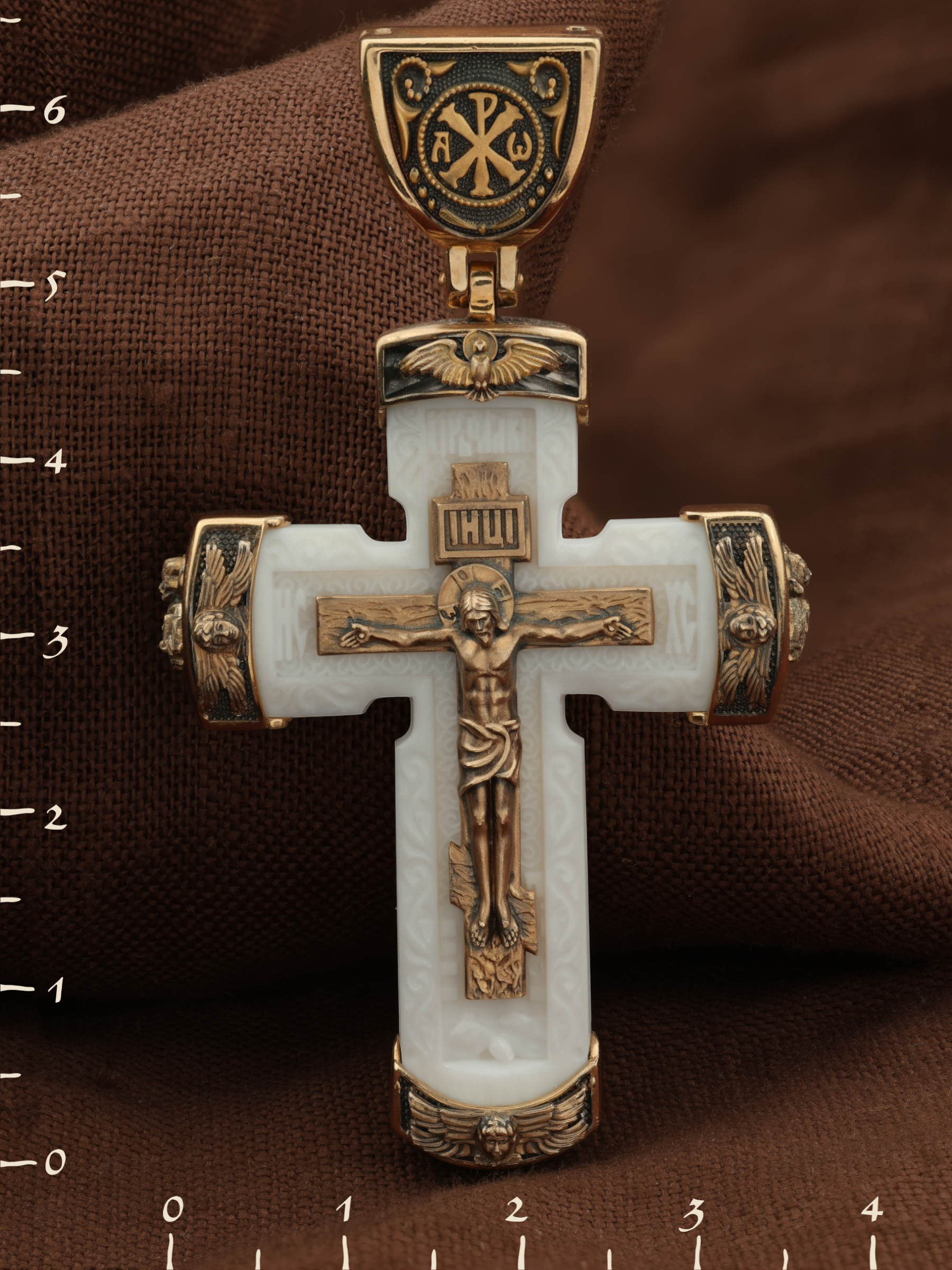 На лицевой стороне креста изображено Распятие, потому что это орудие казни Иисус Христос сделал орудием победы над грехом и смертью. Своими страданиями Он искупил грехи человечества, умерев и сошествовав во ад, победил сатану, освободил души праведников от вечной смерти и открыл им небесные врата рая. Жертва Христа сделала возможным спасение для каждого человека. На православном кресте Христос не умирает, а свободно простирает руки, ладони Иисуса открыты, будто он хочет обнять все человечество, даря им свою любовь и открывая путь к вечной жизни.