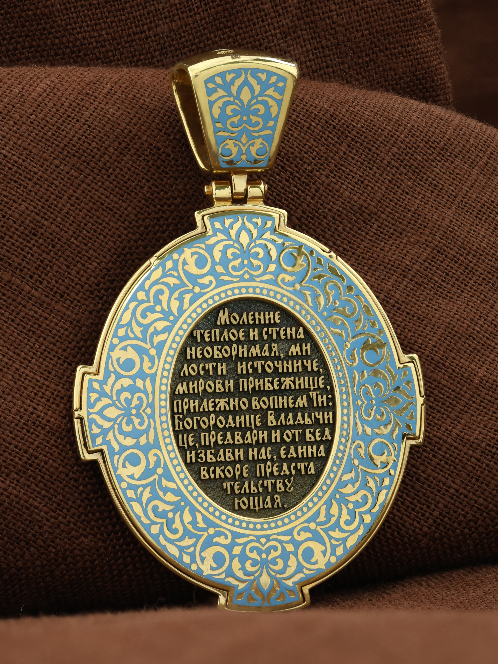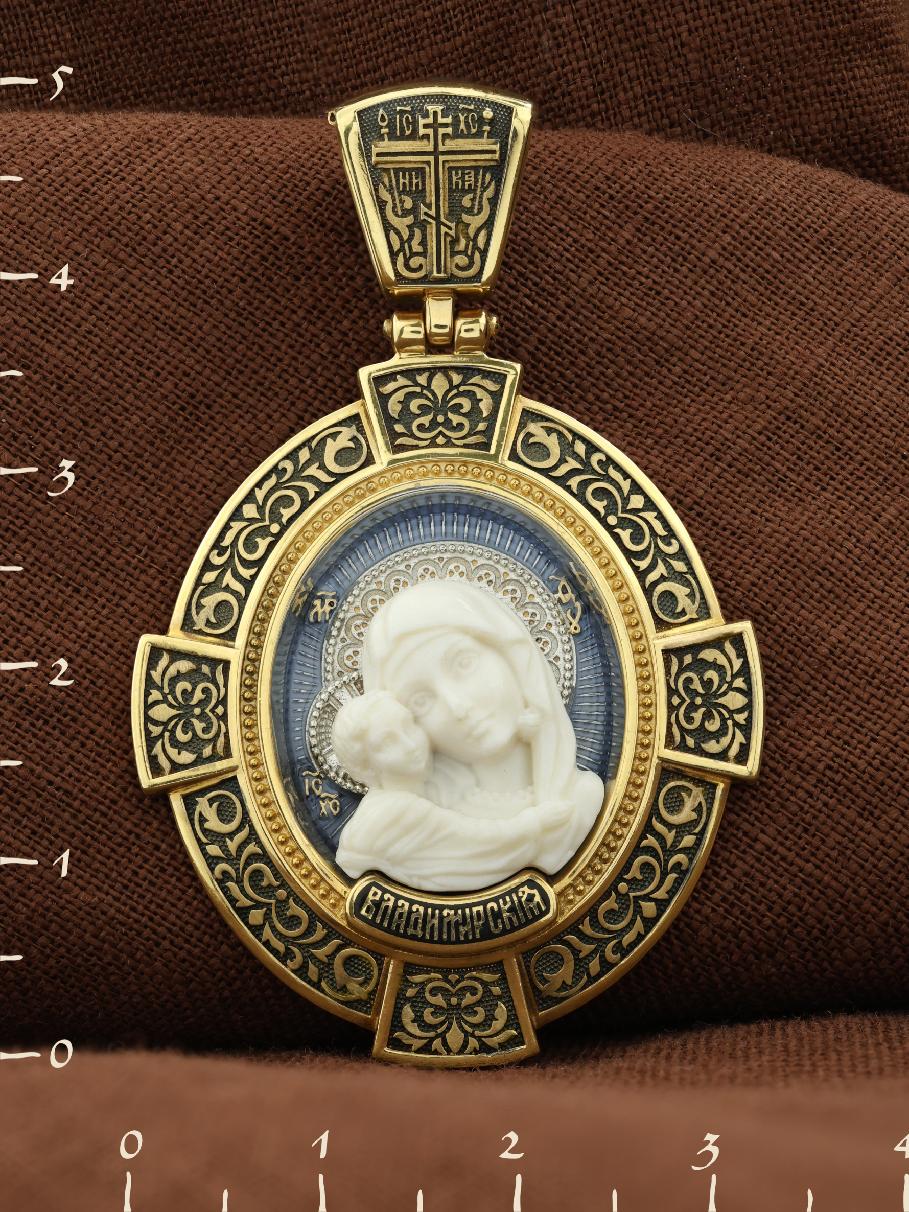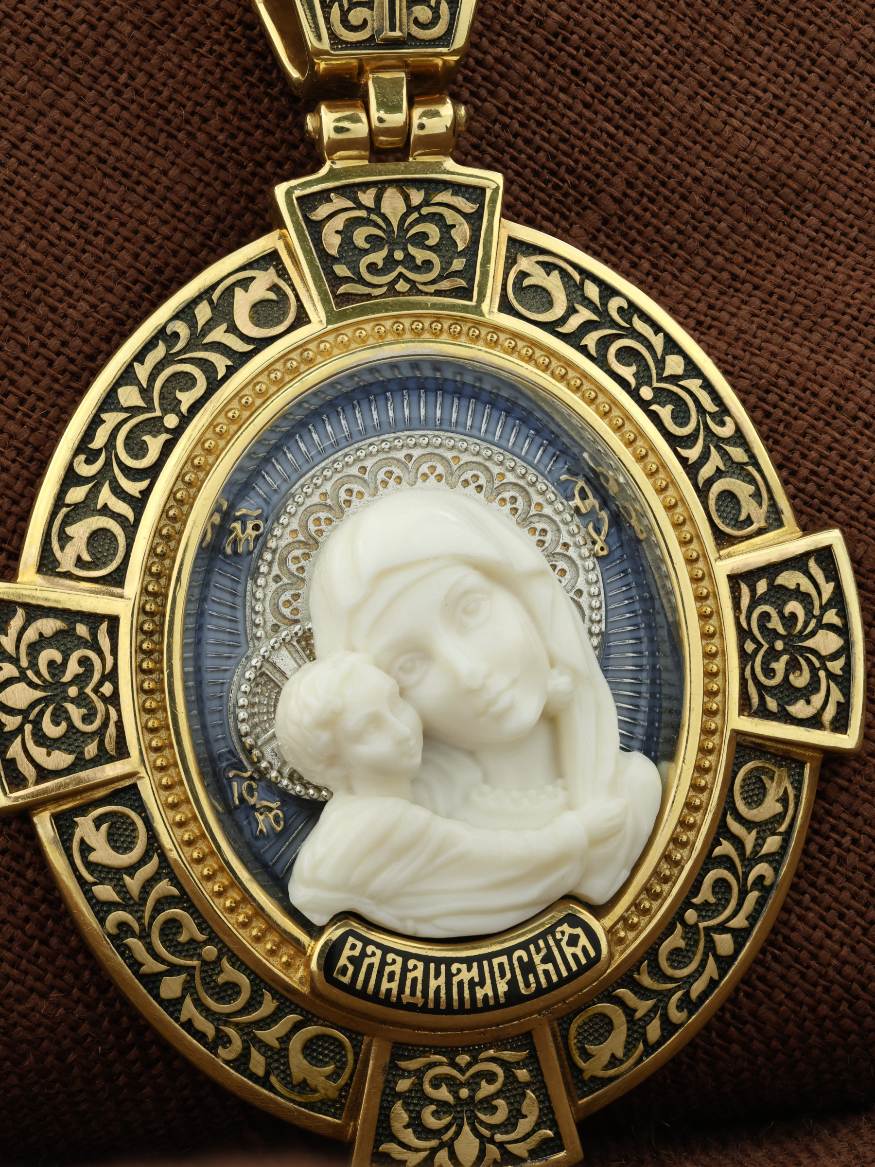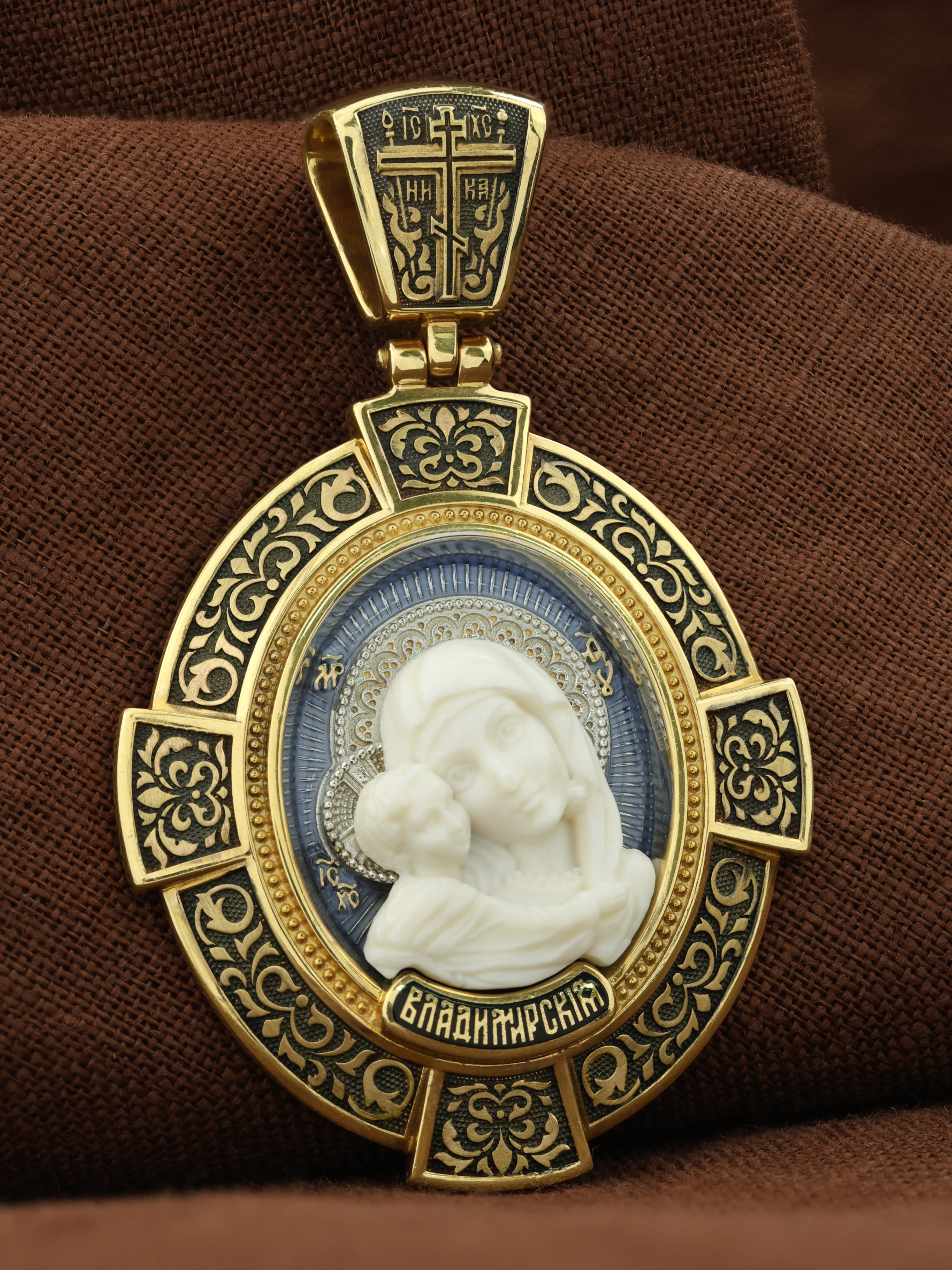 На лицевой стороне образка изображена Владимирская икона Божией Матери — одна из самых чтимых святынь Русской православной церкви. По преданию, икона была написана Святым апостолом и евангелистом Лукой во время земной жизни Богородицы. Дева Мария, увидев Свое изображение, молвила: «Отныне ублажат Мя вси роди. Благодать Рождшегося от Меня и Моя с сим образом да будет». Образ написан в лирическом иконографическом типе «Умиление». Младенец припал щекой к щеке Матери и тянется к ней правой рукой, другой нежно обнимая за шею. Икона вплоть до V века находилась в Иерусалиме, затем была перевезена в Византию. На Русь икона была привезена в 1131 г. За прошедшие столетия святыня неоднократно переезжала из Владимира в Москву и обратно, не раз спасая страну от захватчиков. Русская Православная Церковь установила троекратное празднование Владимирской иконе Божьей Матери. Каждый из дней празднования связан с избавлением русского народа от порабощения иноплеменниками по молитвам ко Пресвятой Богородице. В последующие века у иконы происходили многие важные исторические события: подписание актов, принятие присяги значимых государственных деятелей и возведение на престол. На кулонном кольце изображен Спас Нерукотворный — образ Господа и Спасителя нашего Иисуса Христа, чудесно отпечатавшийся на плате, котором Христос вытер свой лик.