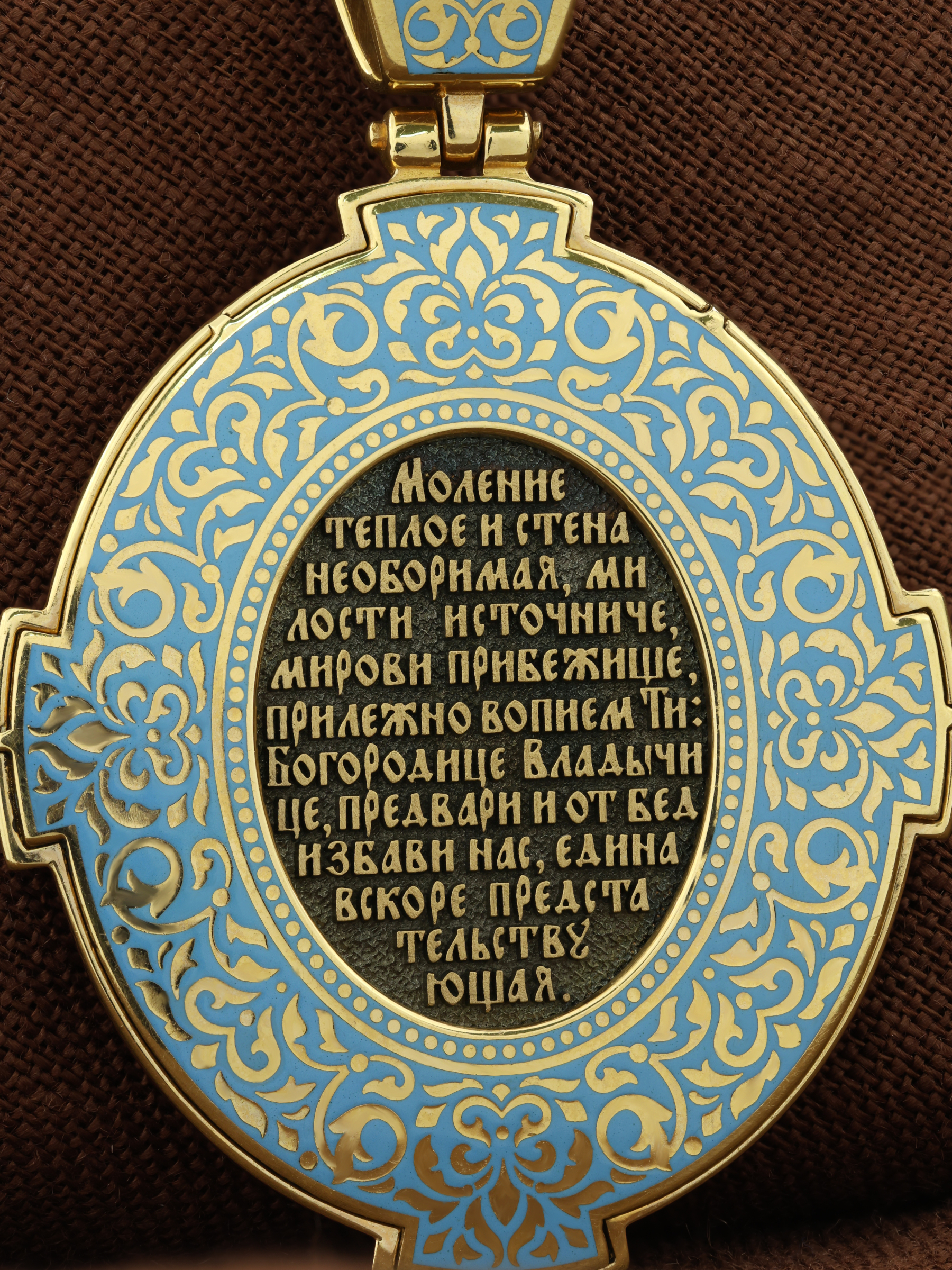 На оборотной стороне образка изображена молитва " Моление теплое и стена необоримая, милости источниче, мирови прибежище, прилежно вопием Ти: Богородице Владычице, предвари, и от бед избави нас, Едина вскоре Предстательствующая».