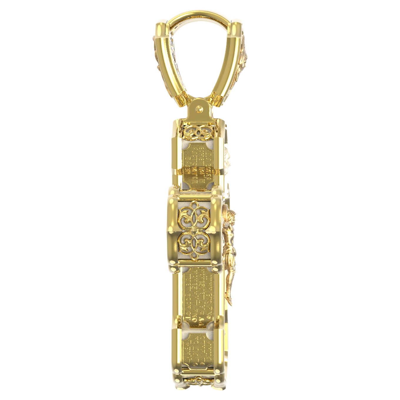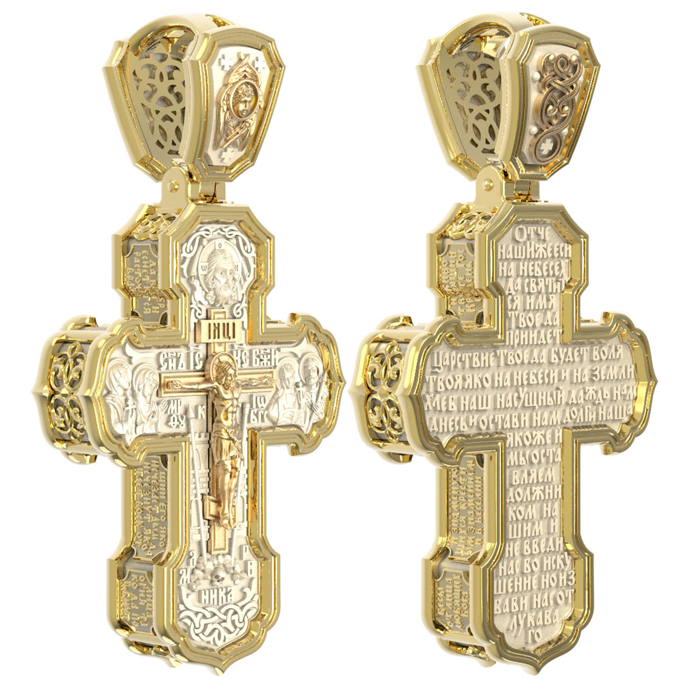 На лицевой стороне креста изображено Распятие Господа и Спасителя нашего Иисуса Христа. Крест- символ спасения и искупления рода человеческого, знамение победы над смертью и адом. Иисус Христос, как искупительная жертва освобождения человечества от власти греха, умер крестной смертью и в третий день воскрес. На верхней табличке, выше головы Иисуса, расположена надпись, составленная Понтием Пилатом — «IНЦI». Она означает «Иисус Назорей, Царь Иудейский». Надпись «IС» « ХС» означает Иисус Христос и помещается на разных сторонах поперечной (большой) перекладины креста. Рядом расположена надпись «Сын Божий». Выше Распятия изображен Нерукотворный образ Господа и Спасителя нашего Иисуса Христа. Слева от Распятия — Пресвятая Богородица и святая мироносица Мария Магдалина с крестом в руке. Справа — апостол и евангелист Иоанн Богослов, один из ближайших учеников Иисуса Христа и сотник Лонгин с крестом в правой руке и копьем — в левой. За крестом высится Иерусалимская стена. Крест стоит на горе камней, символизирующих Голгофу. В ее основании различается череп — это голова Адама. Вдоль креста изображены копие сотника Лонгина и трость с губкой и буквы «К» и «Т». Надпись «МЛРБ» — «место лобное рай бысть» означает, что место лобное стало раем и помещаются в нижней части креста. Рядом — слово «НИКА», что означает «победитель». На православном кресте Христос не умирает, а свободно простирает руки, ладони Иисуса открыты, будто он хочет обнять все человечество, даря им свою любовь и открывая путь к вечной жизни. На кулонном кольце изображен шестикрылый Серафим.