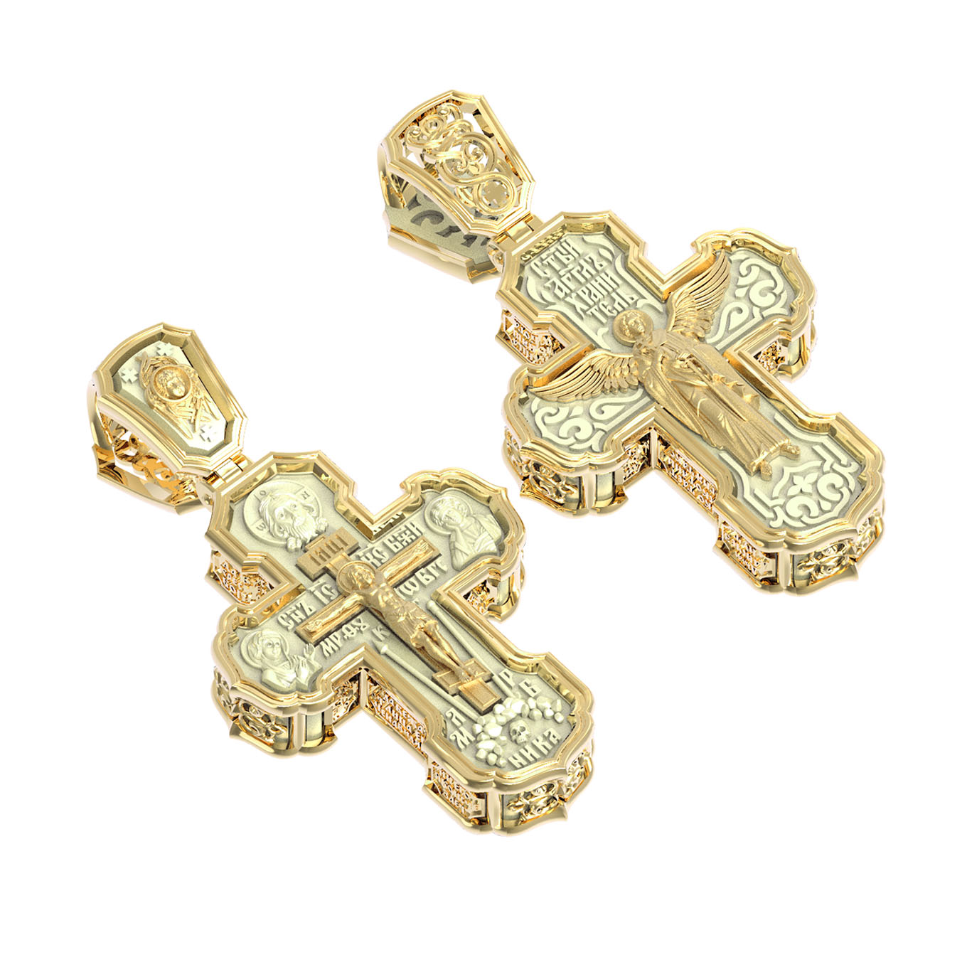 На лицевой стороне креста изображено Распятие Господа и Спасителя нашего Иисуса Христа. Крест- символ спасения и искупления рода человеческого, знамение победы над смертью и адом. Иисус Христос, как искупительная жертва освобождения человечества от власти греха, умер крестной смертью и в третий день воскрес. На верхней табличке, выше головы Иисуса, расположена надпись, составленная Понтием Пилатом — «IНЦI». Она означает «Иисус Назорей, Царь Иудейский». Надпись «IС» « ХС» означает Иисус Христос и помещается на разных сторонах поперечной (большой) перекладины креста. Рядом расположена надпись «Сын Божий». Выше Распятия изображен Нерукотворный образ Господа и Спасителя нашего Иисуса Христа. Слева от Распятия изображена Пресвятая Богородица, справа — апостол и евангелист Иоанн Богослов, один из ближайших учеников Иисуса Христа. Крест стоит на горе камней, символизирующих Голгофу. В ее основании различается череп — это голова Адама. Вдоль креста изображены копие сотника Лонгина и трость с губкой и буквы «К» и «Т». Надпись «МЛРБ» — «место лобное рай бысть» означает, что место лобное стало раем и помещаются в нижней части креста. Рядом — слово «НИКА», что означает «победитель». На православном кресте Христос не умирает, а свободно простирает руки, ладони Иисуса открыты, будто он хочет обнять все человечество, даря им свою любовь и открывая путь к вечной жизни. На кулонном кольце изображен шестикрылый Серафим.