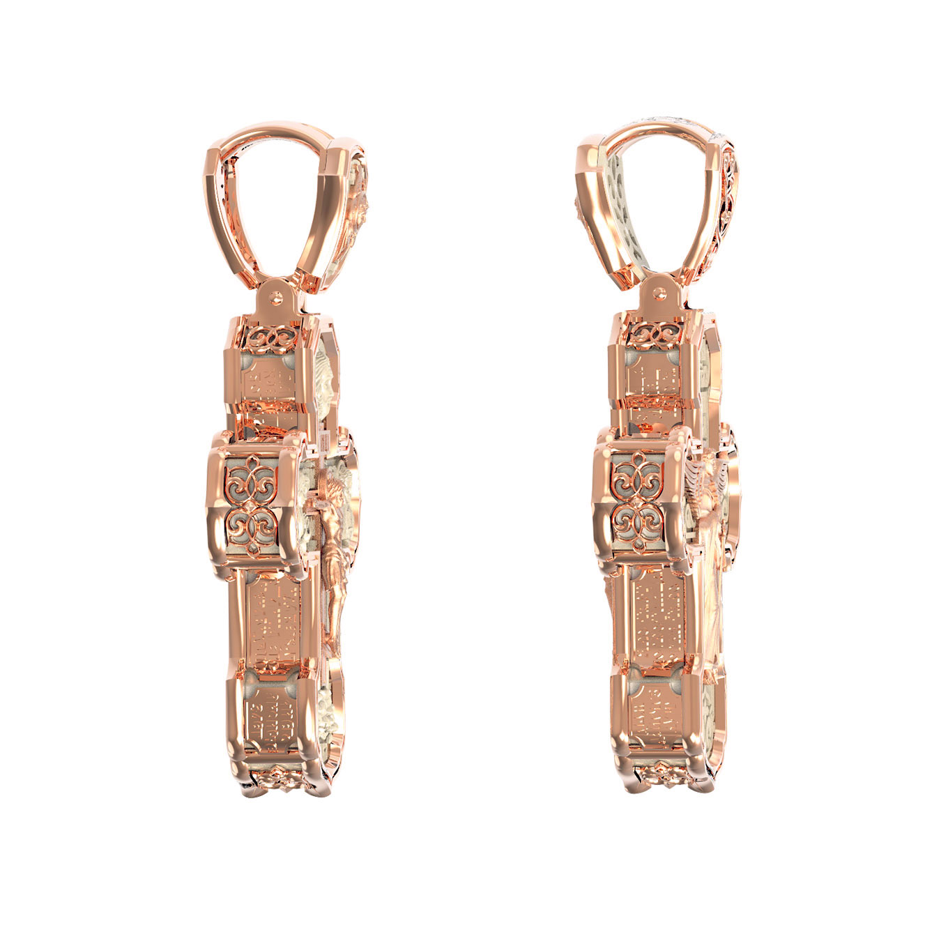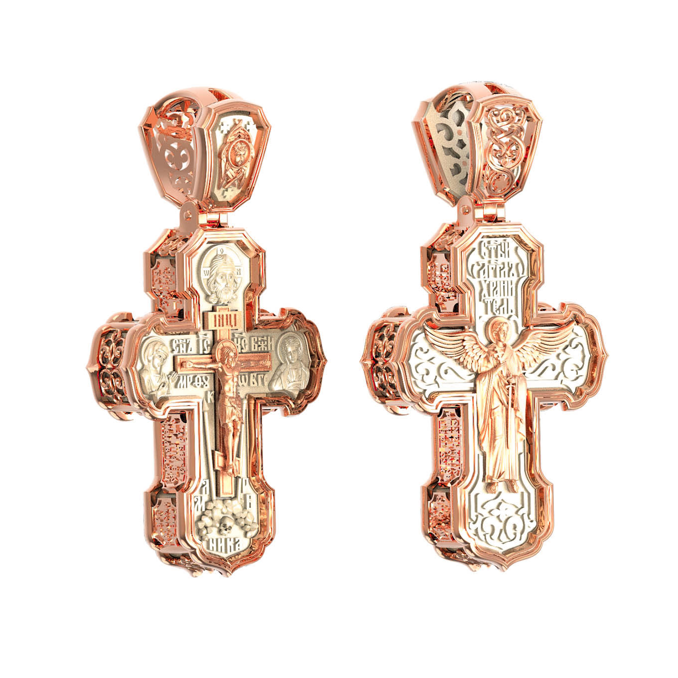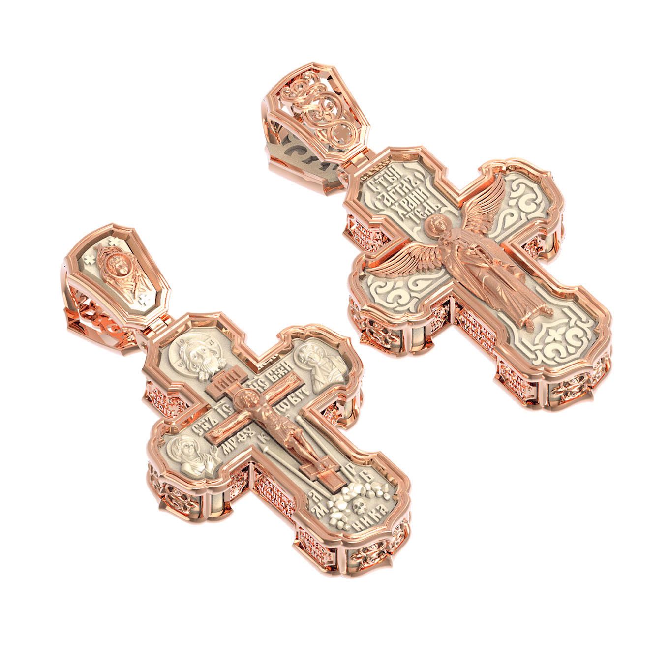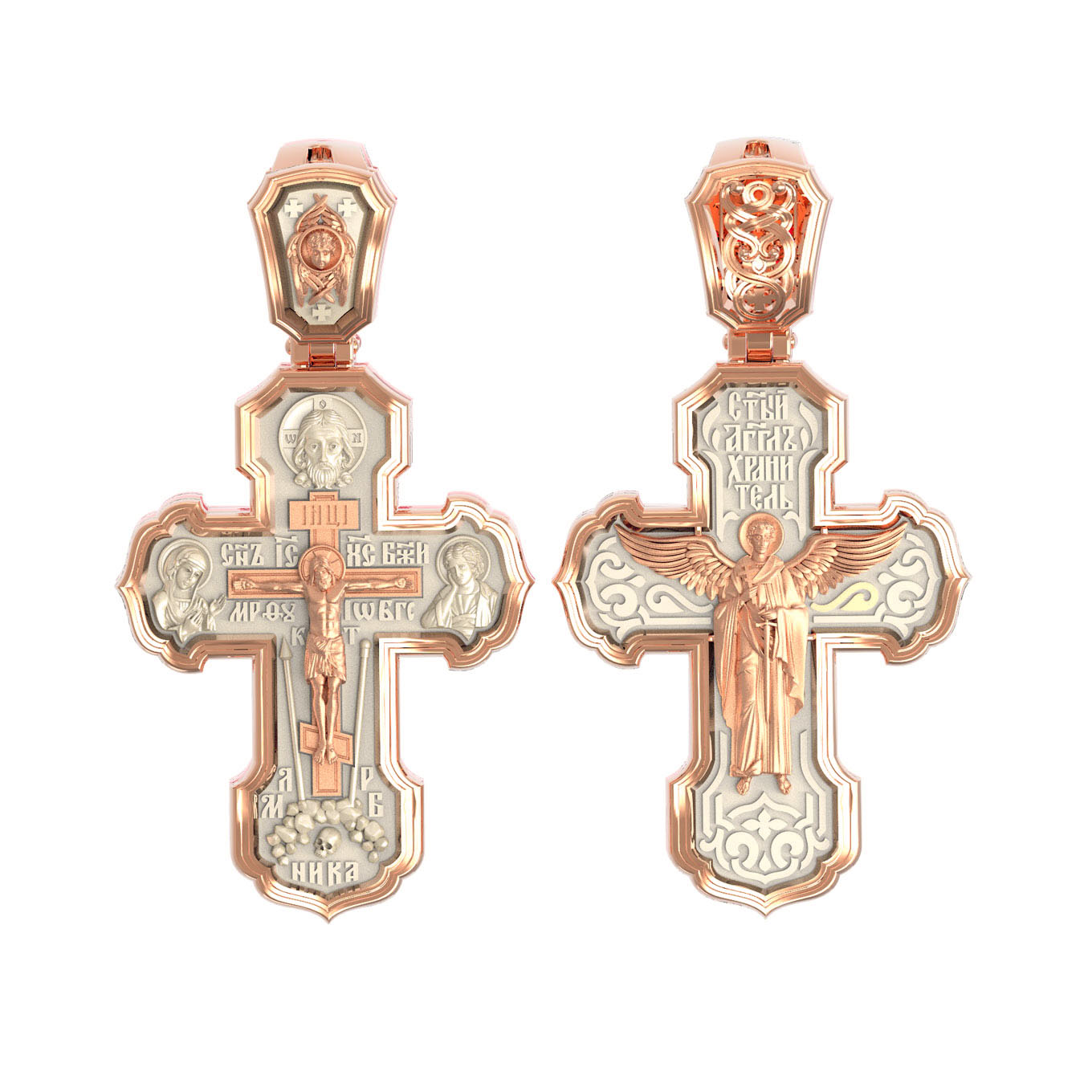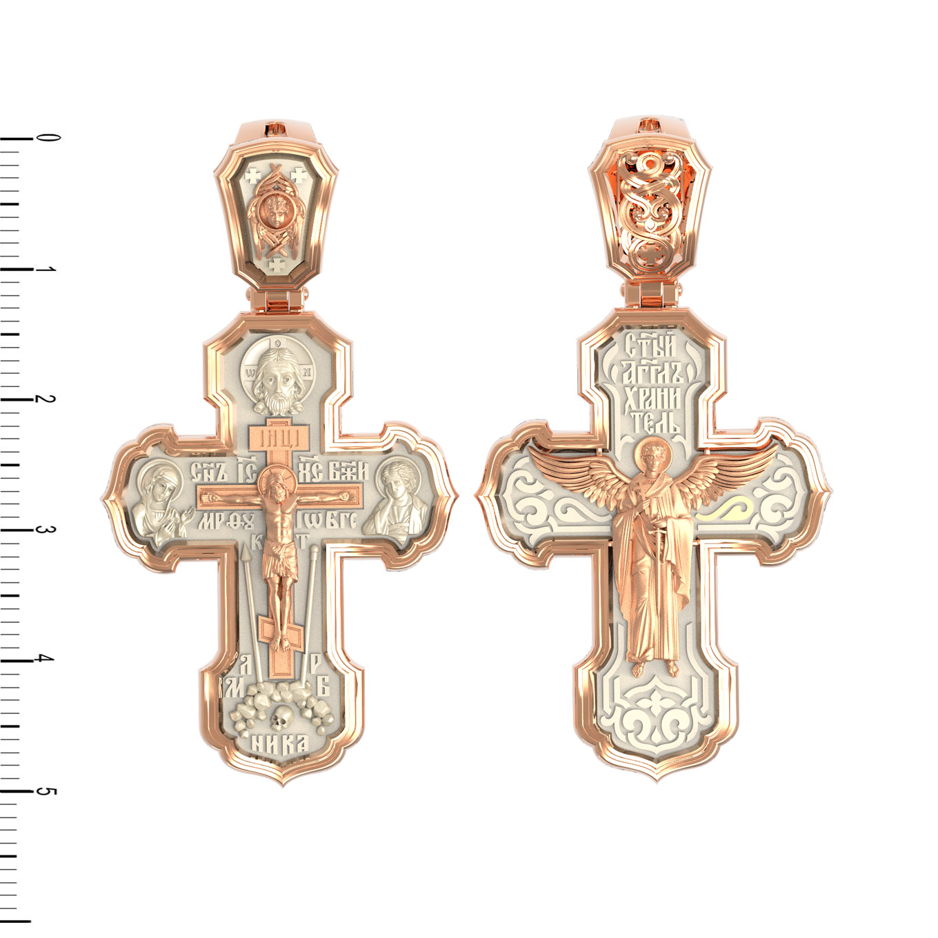 На лицевой стороне креста изображено Распятие Господа и Спасителя нашего Иисуса Христа. Крест- символ спасения и искупления рода человеческого, знамение победы над смертью и адом. Иисус Христос, как искупительная жертва освобождения человечества от власти греха, умер крестной смертью и в третий день воскрес. На верхней табличке, выше головы Иисуса, расположена надпись, составленная Понтием Пилатом — «IНЦI». Она означает «Иисус Назорей, Царь Иудейский». Надпись «IС» « ХС» означает Иисус Христос и помещается на разных сторонах поперечной (большой) перекладины креста. Рядом расположена надпись «Сын Божий». Выше Распятия изображен Нерукотворный образ Господа и Спасителя нашего Иисуса Христа. Слева от Распятия изображена Пресвятая Богородица, справа — апостол и евангелист Иоанн Богослов, один из ближайших учеников Иисуса Христа. Крест стоит на горе камней, символизирующих Голгофу. В ее основании различается череп — это голова Адама. Вдоль креста изображены копие сотника Лонгина и трость с губкой и буквы «К» и «Т». Надпись «МЛРБ» — «место лобное рай бысть» означает, что место лобное стало раем и помещаются в нижней части креста. Рядом — слово «НИКА», что означает «победитель». На православном кресте Христос не умирает, а свободно простирает руки, ладони Иисуса открыты, будто он хочет обнять все человечество, даря им свою любовь и открывая путь к вечной жизни. На кулонном кольце изображен шестикрылый Серафим.