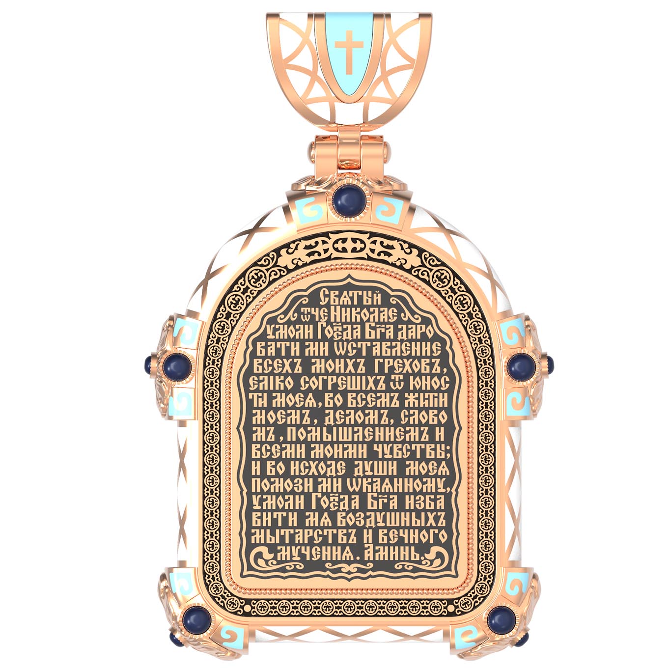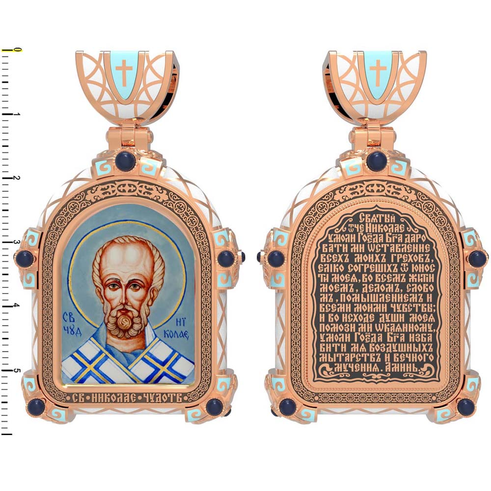 На лицевой стороне образка изображен Святитель Николай архиепископ Мир Ликийских, Чудотворец. Он является одним из самых известных на Руси святых, издревле считающийся помощником и молитвенником за всех, притекающих к нему. Чудес его исчислить невозможно. Николай Чудотворец подавал многим исцеления в болезнях и телесных недугах, обогащал бедствующих в крайней нищете, подавал голодным пищу, спасал от потопления, освобождал из плена и избавлял от смерти.