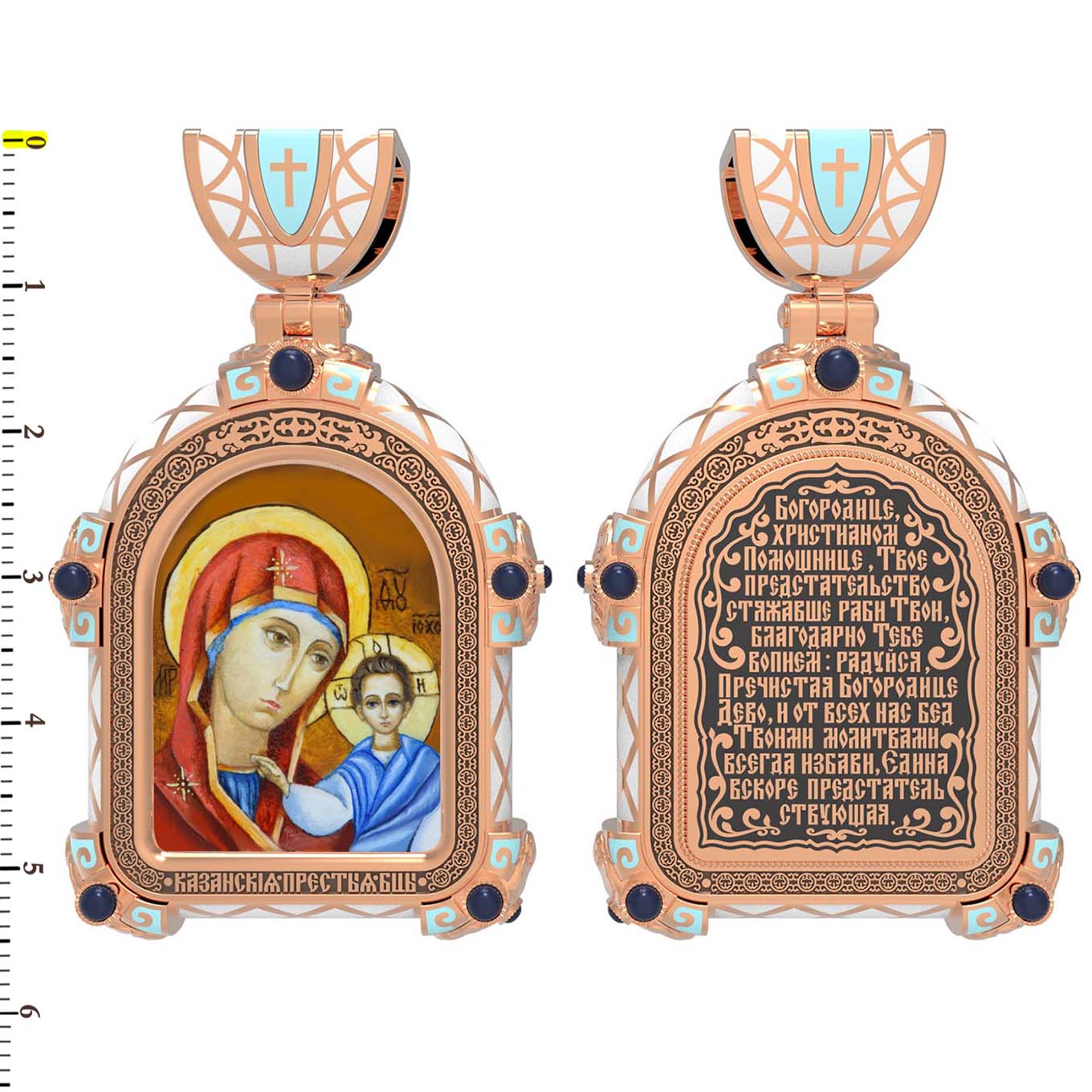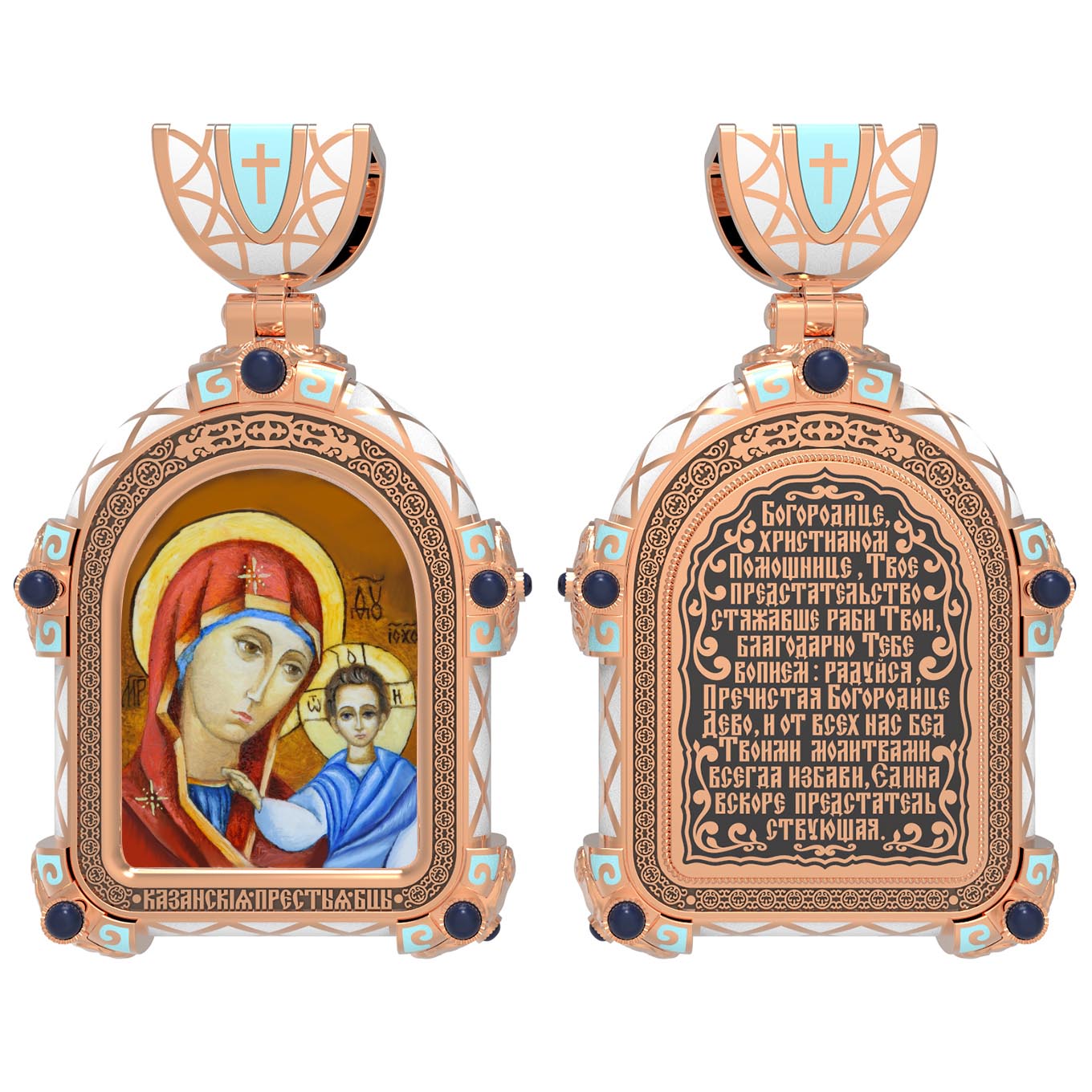 На лицевой стороне образка изображена Казанская икона Божией Матери. Пресвятая Богородица — милосердная заступница, просительница за нас перед Богом. Она стала воистину нашей Матушкой, охраняющей и поддерживающей нас от рождения до самой смерти, а Ее благодатная помощь изливается на нас по молитвам у ее чудотворных икон. Казанская икона явилась в 1579 году в Казани, вскоре после взятия Казанского царства у татар Иоанном Грозным. Этот образ Богородицы не раз сопровождал русский народ в бедствиях. Икона Божией Матери Казанская вдохновляла русских ратников в период Смутного времени при освобождении Москвы от поляков. Перед Казанской иконой в 1709 году, накануне Полтавской победы, император Петр I молился о даровании победы русскому войску. В 1812 году накануне отъезда в действующую армию перед чудотворной иконой Божией Матери молился князь Михаил Кутузов. Не только государственным мужам и дружинам указывала путь икона — по доброй традиции именно этой иконой благословляют на брак молодых родители, длинным списком чудес сопровождается этот образ Богоматери — один из самых любимых на Руси. Существует множество древних списков с этой удивительной иконы. На кулонном кольце изображен Спас Нерукотворный — образ Господа и Спасителя нашего Иисуса Христа, чудесно отпечатавшийся на плате, котором Христос вытер свой лик.