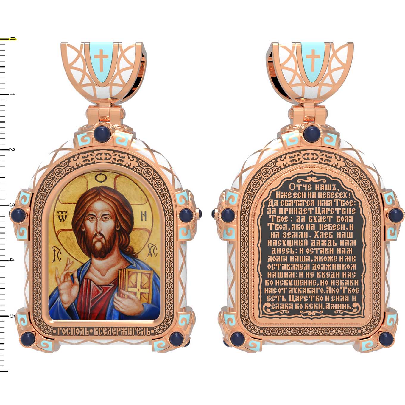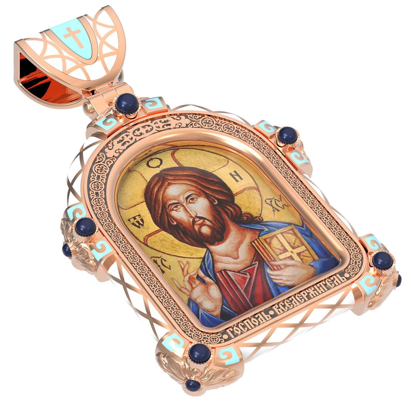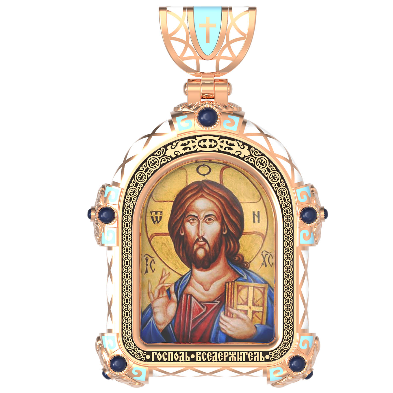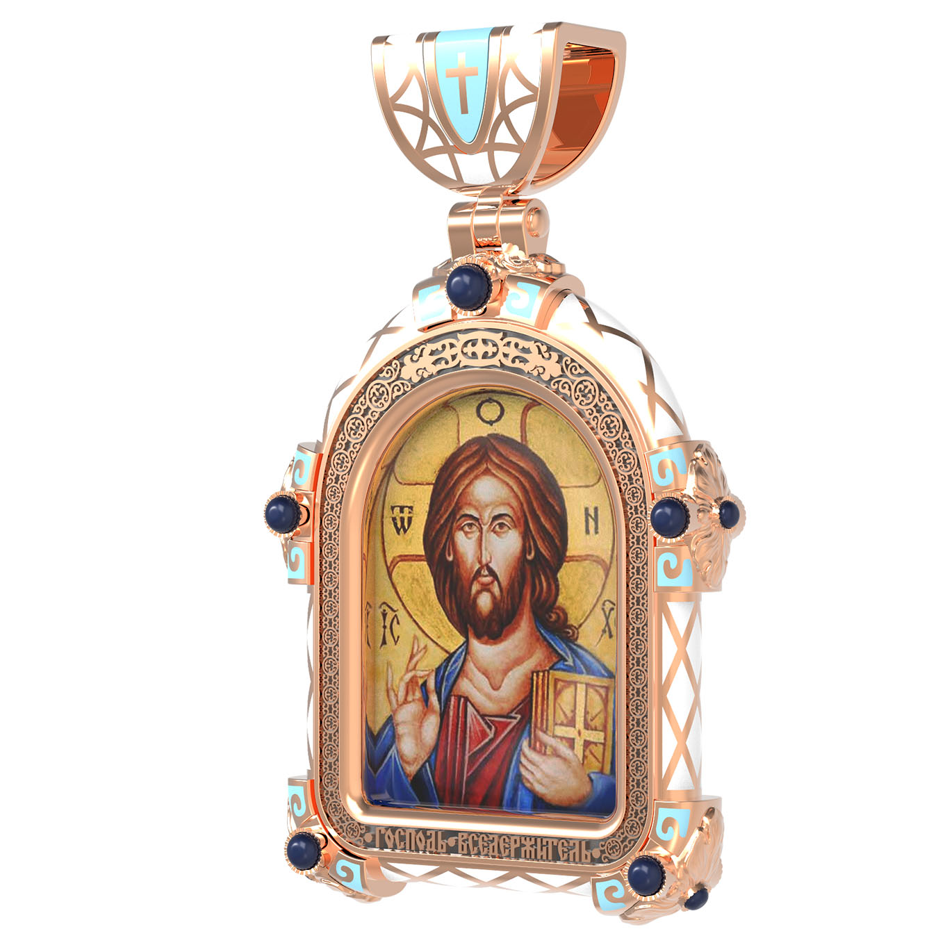 На лицевой стороне образка изображена икона Господа и Спасителя нашего Иисуса Христа — Господь Вседержитель или Пантократор (от греч. всевластный, всесильный). Он представлен как Царь Небесный и будущий Судия мира. Именование Иисуса «Вседержителем» указывает, с одной стороны, на Его Божественную природу: «Аз есмь Альфа и Омега, начало и конец, говорит Господь, Который есть и был и грядет, Вседержитель» (Откр. 1: 8). С другой стороны, такое именование связано и с человеческой природой Христа, искупившего крестной жертвой людские грехи и обновившего тем самым человеческую природу. Господь Иисусь Христос изображен фронтально огрудно. Главу Спасителя осеняет нимб, на нем угадывается крест. Крест символизирует голгофскую жертву Спасителя. По греческой традиции, на нимбе написаны буквы Омега, Омикрон, Ню — вместе они обозначают слово Сущий, одно из имен и характеристику Бога, согласно Священному Писанию. Правой рукой Он благословляет, а левой держит Евангелие — благую весть, принесенную Христом всему миру. Также означает она тот новый мир, который будет сотворен Богом после второго пришествия Христа. Символизирует и Книгу Жизни, где записаны имена всех, возлюбивших Бога. Всемогущий Бог предстает здесь не как обличающий судья, а как милостивый отец, ждущий возвращения блудных детей.