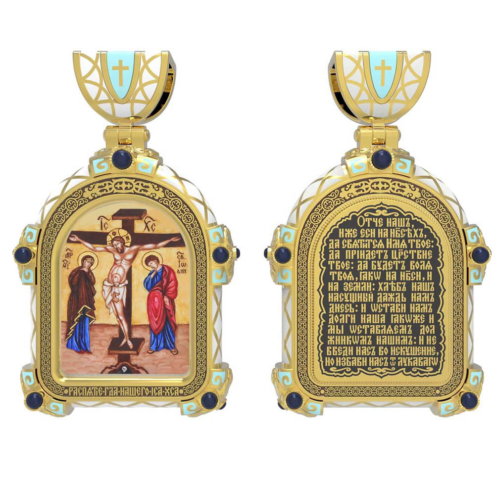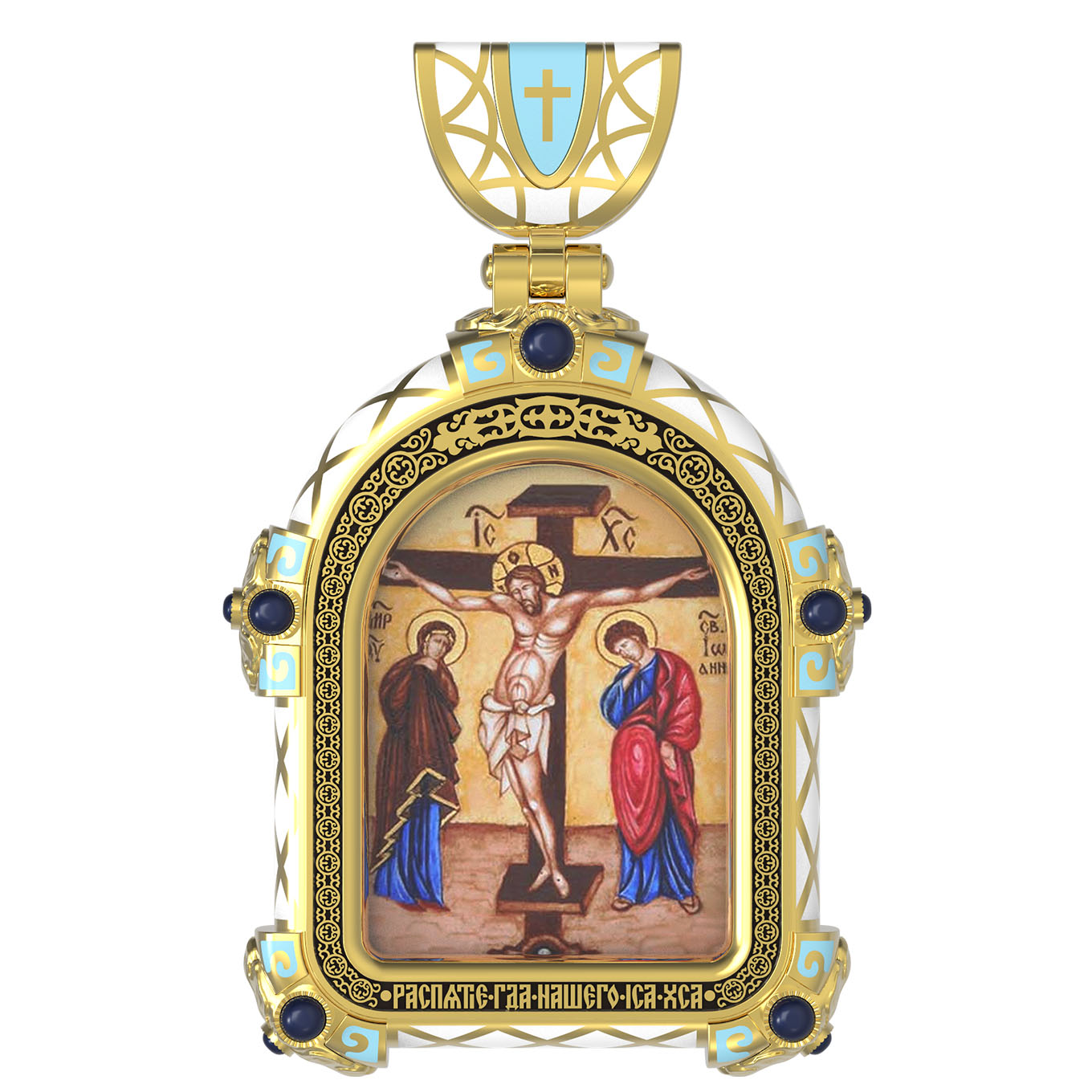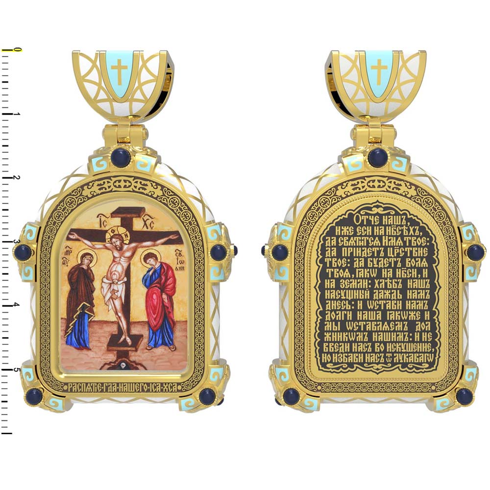 На лицевой стороне образка изображено Распятие Господа и Спасителя нашего Иисуса Христа. Своими крестными страданиями Господь смыл наши грехи, покрыл наш долг перед Богом или, на языке Писания, нас «искупил». В Голгофе сокрыта непостижимая тайна бесконечной правды и любви Бога. Крест стал символом победы добра над злом, жизни над смертью, напоминанием бесконечной Божьей любви, предметом радости. Воплотившийся Сын Божий Своею кровью освятил крест и сделал его проводником Своей благодати, источником освящения верующих. На верхней табличке, выше головы Иисуса, расположена надпись, составленная Понтием Пилатом — «IНЦI». Она означает «Иисус Назорей, Царь Иудейский». Ниже перекладины написано сокращенно имя Спасителя «IC» «XC» — Иисус Христос. Крест стоит на горе камней, символизирующих Голгофу. Под подножием Креста изображена покоящаяся голова (череп) Адама. Слева от Распятия стоят оплакивающие Господа Пресвятая Богородица и святая мироносица Мария Клеопова. Справа — апостол и евангелист Иоанн Богослов, один из ближайших учеников Иисуса Христа и сотник Лонгин с крестом в правой руке и копьем — в левой. По преданию, увидя, что они горько плачут, Иисус сказал Матери Своей: «Жено! Се сын Твой!» Потом сказал ученику Иоанну: «Се мати твоя». С этого времени Иоанн взял Матерь Божию к себе, и Она жила в его доме до самой смерти.