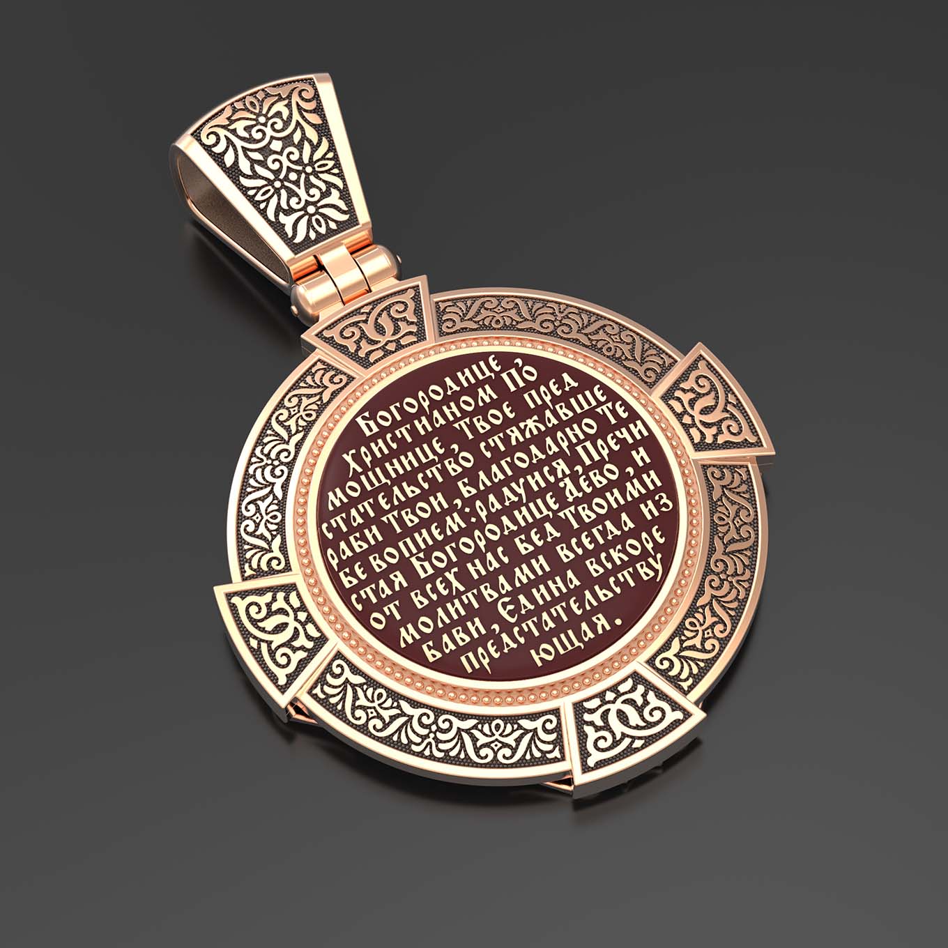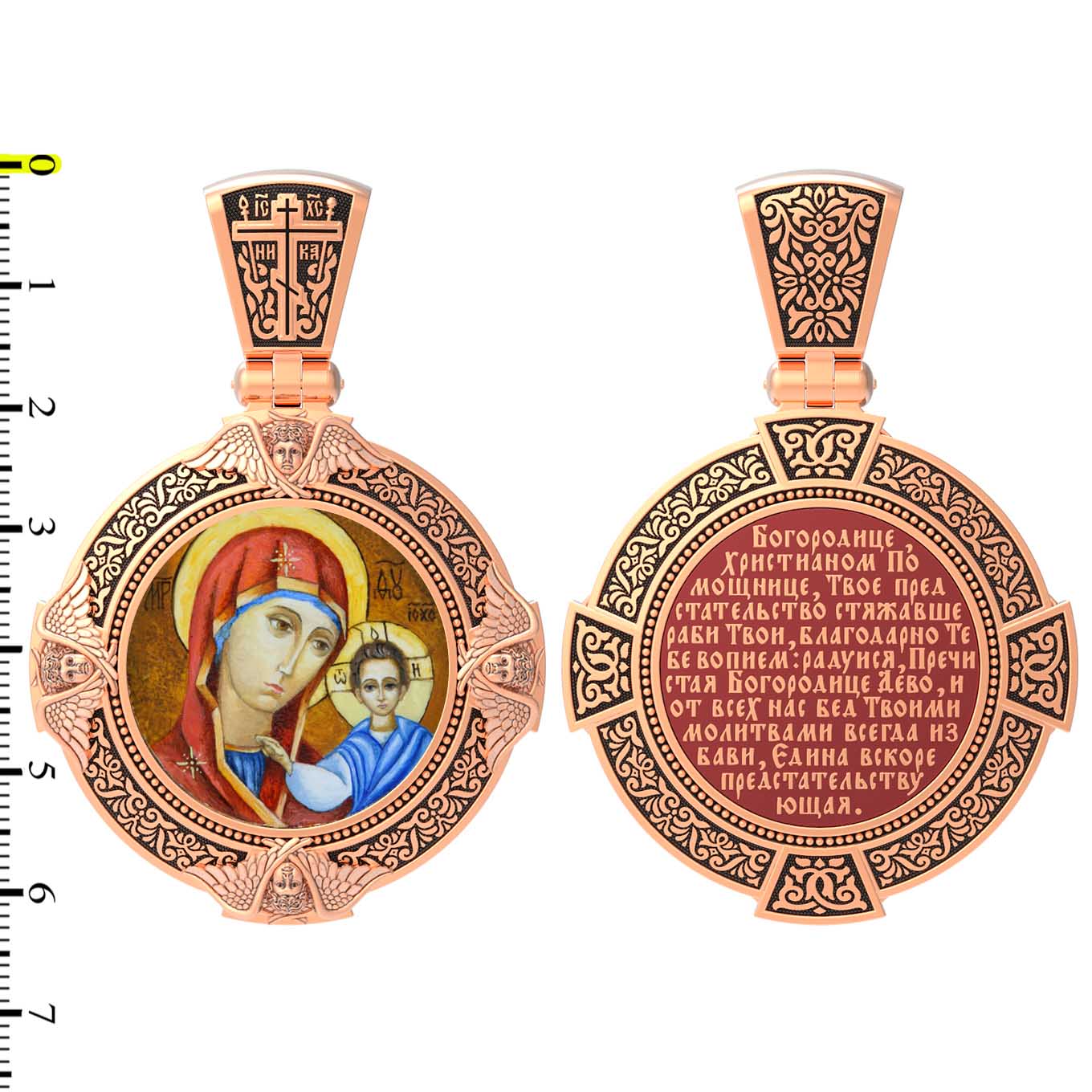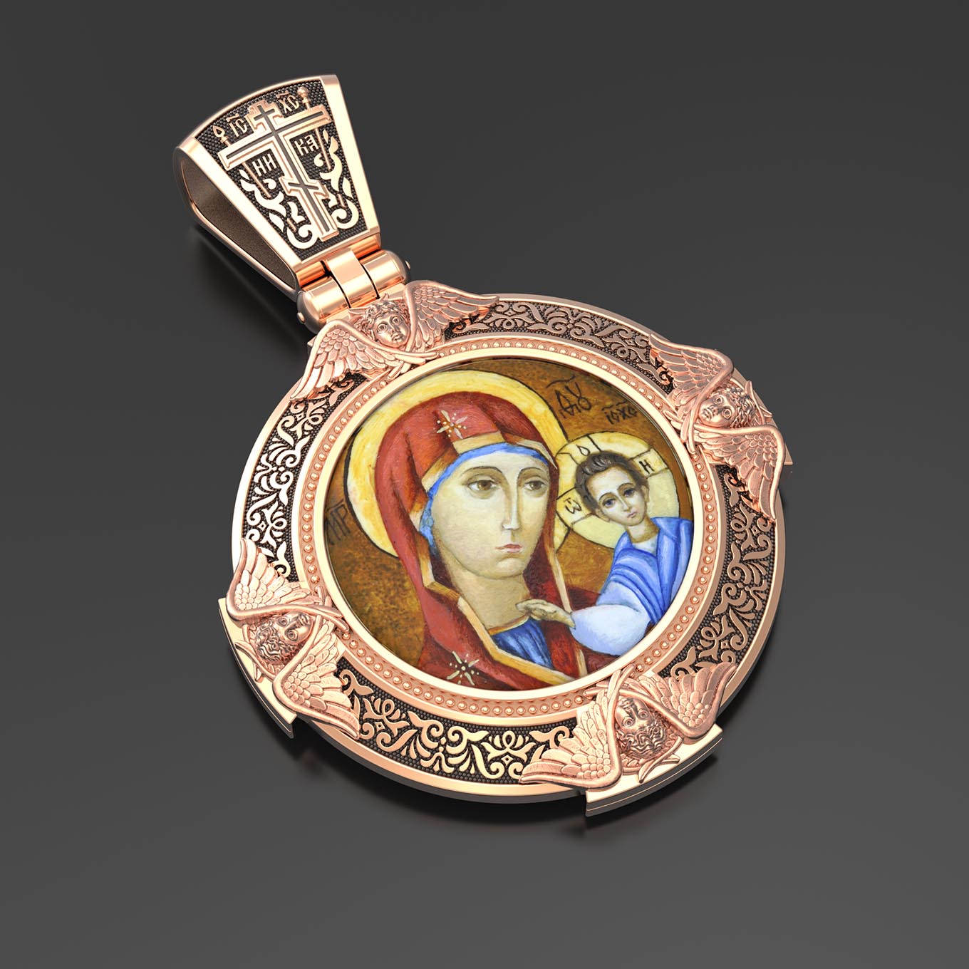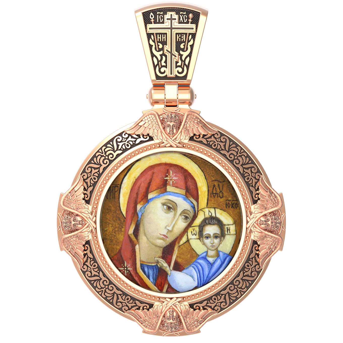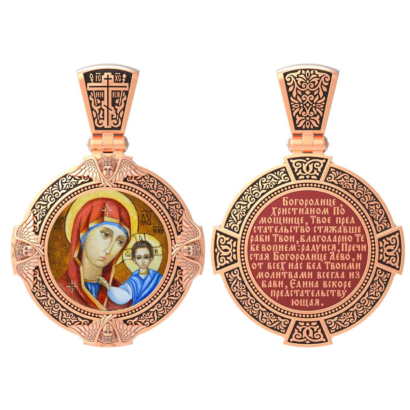 На лицевой стороне образка изображена Казанская икона Божией Матери. Пресвятая Богородица — милосердная заступница, просительница за нас перед Богом. Она стала воистину нашей Матушкой, охраняющей и поддерживающей нас от рождения до самой смерти, а Ее благодатная помощь изливается на нас по молитвам у ее чудотворных икон. Казанская икона явилась в 1579 году в Казани, вскоре после взятия Казанского царства у татар Иоанном Грозным. Этот образ Богородицы не раз сопровождал русский народ в бедствиях. Икона Божией Матери Казанская вдохновляла русских ратников в период Смутного времени при освобождении Москвы от поляков. Перед Казанской иконой в 1709 году, накануне Полтавской победы, император Петр I молился о даровании победы русскому войску. В 1812 году накануне отъезда в действующую армию перед чудотворной иконой Божией Матери молился князь Михаил Кутузов. Не только государственным мужам и дружинам указывала путь икона — по доброй традиции именно этой иконой благословляют на брак молодых родители, длинным списком чудес сопровождается этот образ Богоматери — один из самых любимых на Руси. Существует множество древних списков с этой удивительной иконы. На кулонном кольце изображен Спас Нерукотворный — образ Господа и Спасителя нашего Иисуса Христа, чудесно отпечатавшийся на плате, котором Христос вытер свой лик.