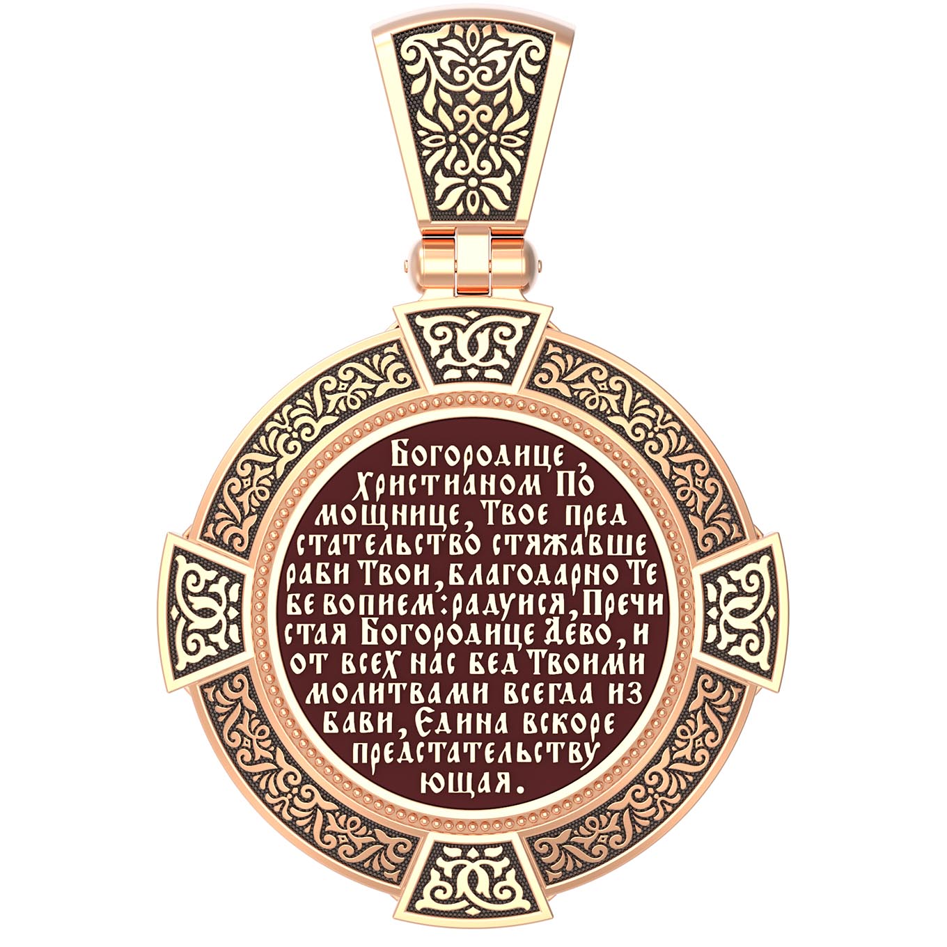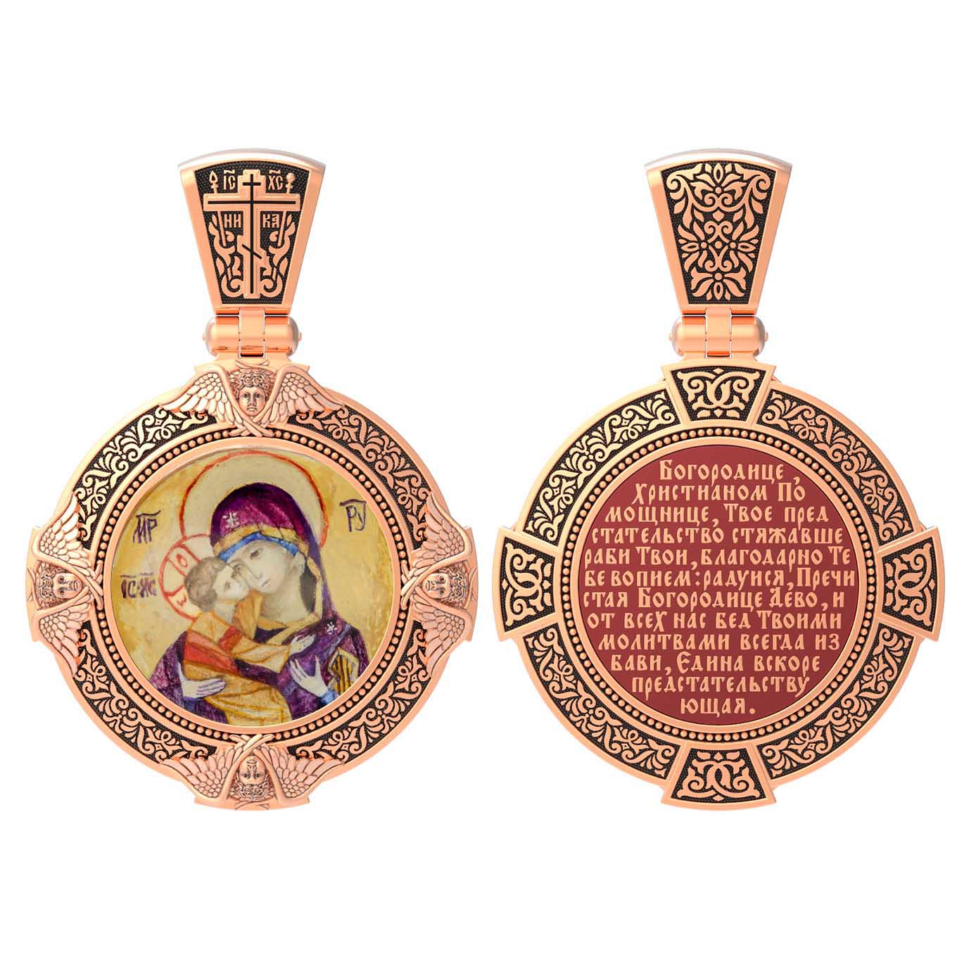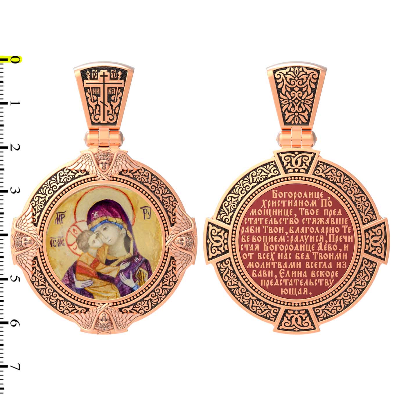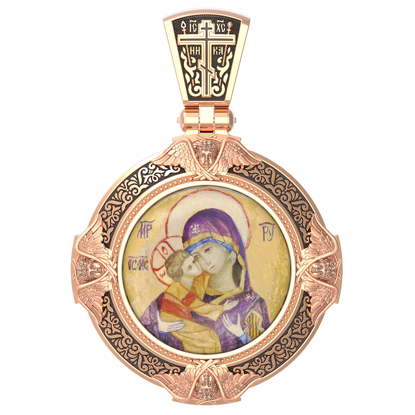 На лицевой стороне образка изображена Владимирская икона Божией Матери — одна из самых чтимых святынь Русской православной церкви. По преданию, икона была написана Святым апостолом и евангелистом Лукой во время земной жизни Богородицы. Дева Мария, увидев Свое изображение, молвила: «Отныне ублажат Мя вси роди. Благодать Рождшегося от Меня и Моя с сим образом да будет». Образ написан в лирическом иконографическом типе «Умиление». Младенец припал щекой к щеке Матери и тянется к ней правой рукой, другой нежно обнимая за шею. Икона вплоть до V века находилась в Иерусалиме, затем была перевезена в Византию. На Русь икона была привезена в 1131 г. За прошедшие столетия святыня неоднократно переезжала из Владимира в Москву и обратно, не раз спасая страну от захватчиков. Русская Православная Церковь установила троекратное празднование Владимирской иконе Божьей Матери. Каждый из дней празднования связан с избавлением русского народа от порабощения иноплеменниками по молитвам ко Пресвятой Богородице. В последующие века у иконы происходили многие важные исторические события: подписание актов, принятие присяги значимых государственных деятелей и возведение на престол. На кулонном кольце изображен Спас Нерукотворный — образ Господа и Спасителя нашего Иисуса Христа, чудесно отпечатавшийся на плате, котором Христос вытер свой лик.