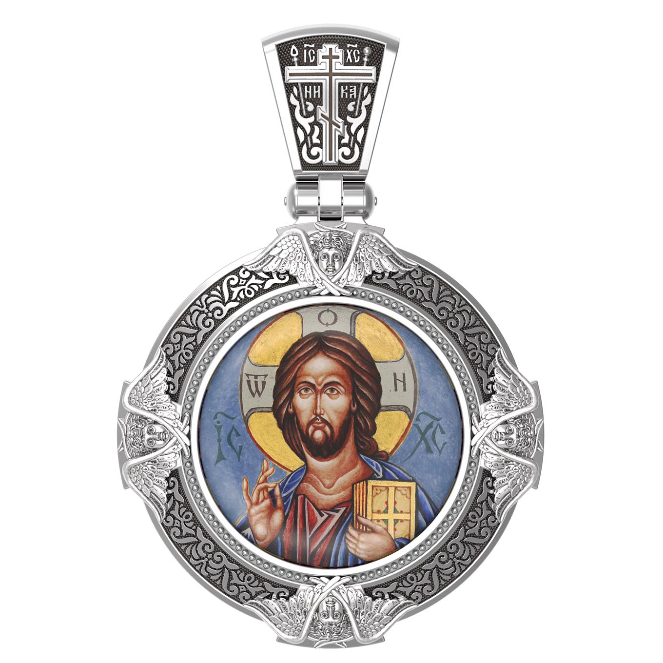 На лицевой стороне образка изображена икона Господа и Спасителя нашего Иисуса Христа — Господь Вседержитель или Пантократор (от греч. всевластный, всесильный). Он представлен как Царь Небесный и будущий Судия мира. Именование Иисуса «Вседержителем» указывает, с одной стороны, на Его Божественную природу: «Аз есмь Альфа и Омега, начало и конец, говорит Господь, Который есть и был и грядет, Вседержитель» (Откр. 1: 8). С другой стороны, такое именование связано и с человеческой природой Христа, искупившего крестной жертвой людские грехи и обновившего тем самым человеческую природу. Господь Иисусь Христос изображен фронтально огрудно. Главу Спасителя осеняет нимб, на нем угадывается крест. Крест символизирует голгофскую жертву Спасителя. По греческой традиции, на нимбе написаны буквы Омега, Омикрон, Ню — вместе они обозначают слово Сущий, одно из имен и характеристику Бога, согласно Священному Писанию. Правой рукой Он благословляет, а левой держит Евангелие — благую весть, принесенную Христом всему миру. Также означает она тот новый мир, который будет сотворен Богом после второго пришествия Христа. Символизирует и Книгу Жизни, где записаны имена всех, возлюбивших Бога. Всемогущий Бог предстает здесь не как обличающий судья, а как милостивый отец, ждущий возвращения блудных детей.