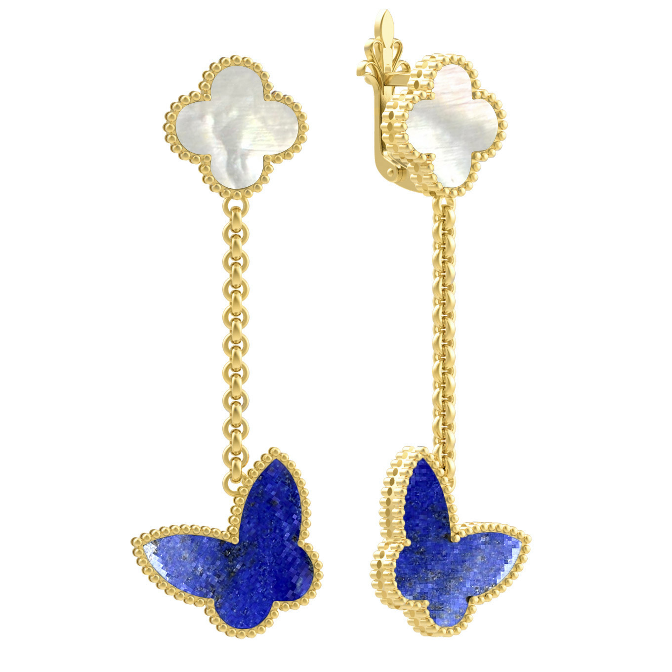 Данная модель создана как для женщин, так и для мужчин, предпочитающих лаконичные, но выразительные украшения. Серьги из лимонного золота с лазуритом и перламутром идеально дополнят вашу шкатулку, а при желании могут стать центральным элементом, так как изделие прекрасно подходит для формирования стильных комплектов. Оцените изысканность дизайна бабочки, где каждый элемент подчеркивает статусность и хороший вкус владельца.