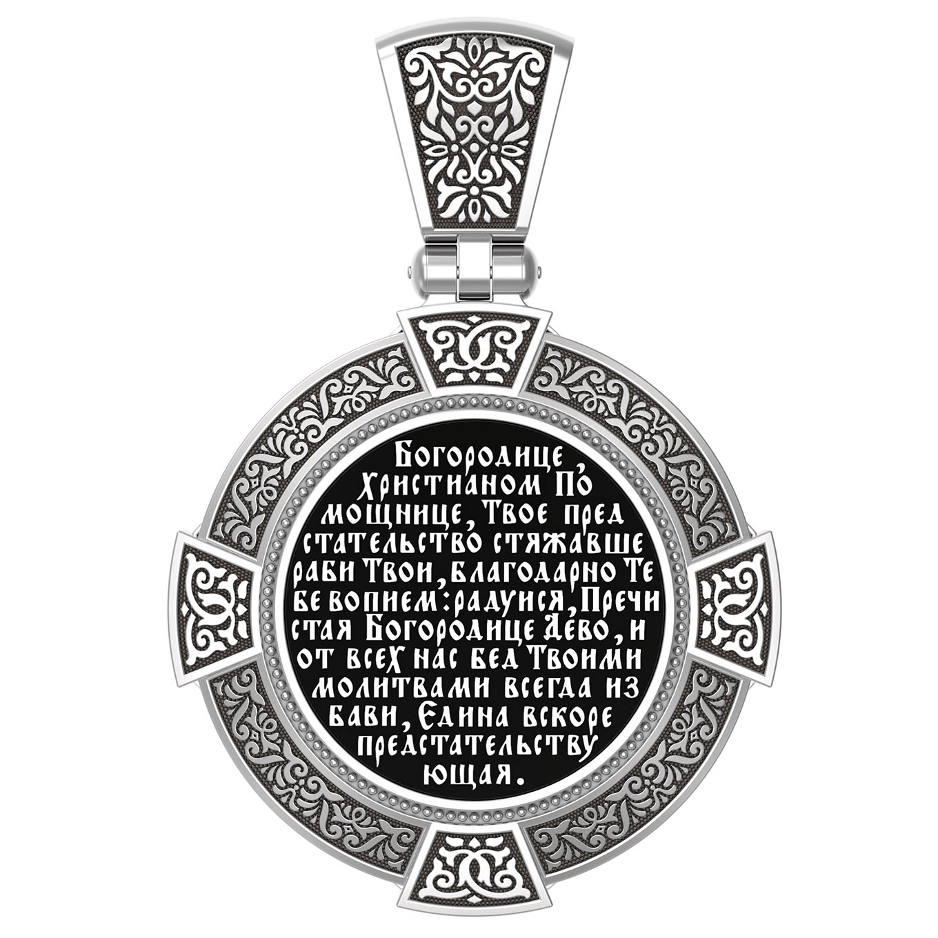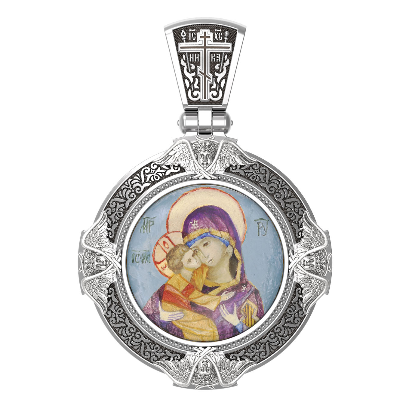 На лицевой стороне образка изображена Владимирская икона Божией Матери — одна из самых чтимых святынь Русской православной церкви. По преданию, икона была написана Святым апостолом и евангелистом Лукой во время земной жизни Богородицы. Дева Мария, увидев Свое изображение, молвила: «Отныне ублажат Мя вси роди. Благодать Рождшегося от Меня и Моя с сим образом да будет». Образ написан в лирическом иконографическом типе «Умиление». Младенец припал щекой к щеке Матери и тянется к ней правой рукой, другой нежно обнимая за шею. Икона вплоть до V века находилась в Иерусалиме, затем была перевезена в Византию. На Русь икона была привезена в 1131 г. За прошедшие столетия святыня неоднократно переезжала из Владимира в Москву и обратно, не раз спасая страну от захватчиков. Русская Православная Церковь установила троекратное празднование Владимирской иконе Божьей Матери. Каждый из дней празднования связан с избавлением русского народа от порабощения иноплеменниками по молитвам ко Пресвятой Богородице. В последующие века у иконы происходили многие важные исторические события: подписание актов, принятие присяги значимых государственных деятелей и возведение на престол. На кулонном кольце изображен Спас Нерукотворный — образ Господа и Спасителя нашего Иисуса Христа, чудесно отпечатавшийся на плате, котором Христос вытер свой лик.