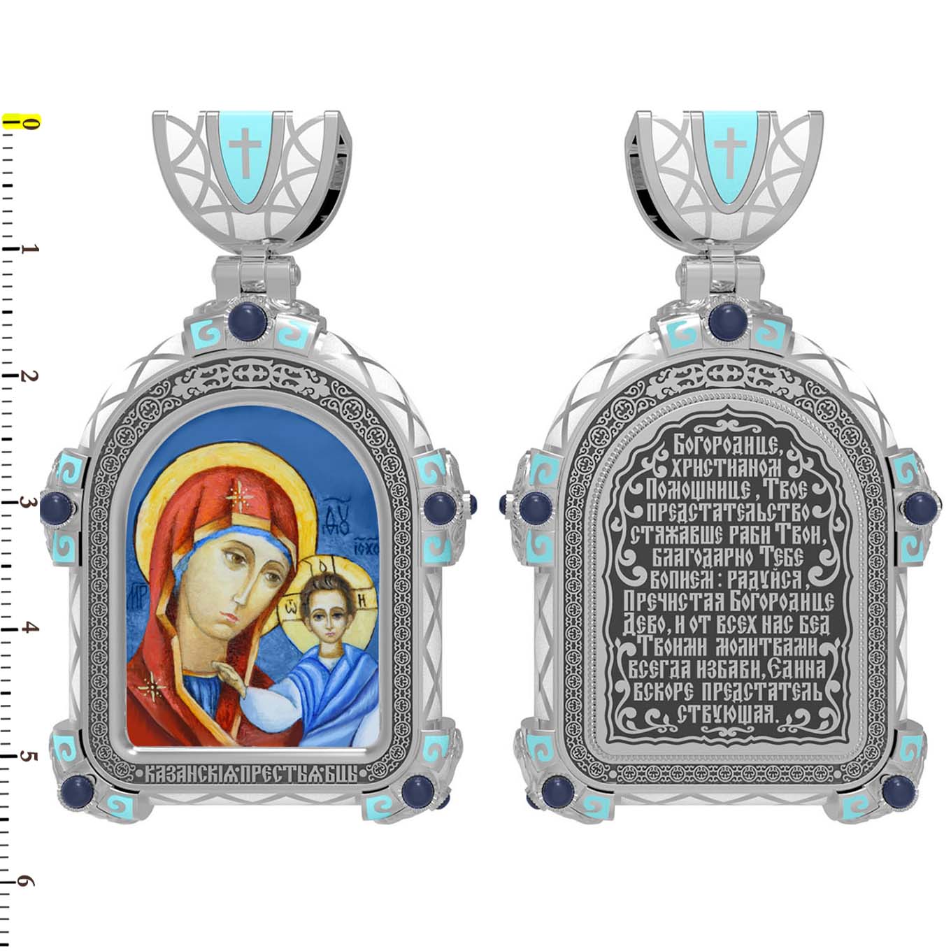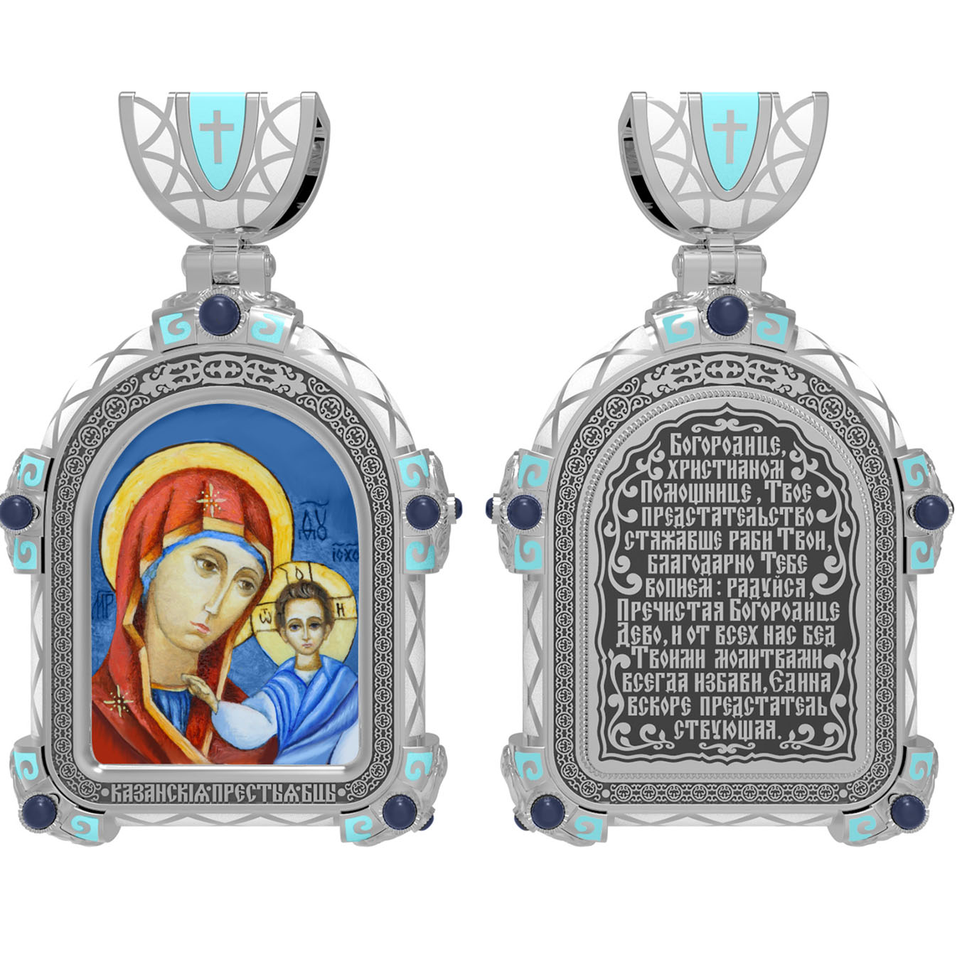 На лицевой стороне образка изображена Казанская икона Божией Матери. Пресвятая Богородица — милосердная заступница, просительница за нас перед Богом. Она стала воистину нашей Матушкой, охраняющей и поддерживающей нас от рождения до самой смерти, а Ее благодатная помощь изливается на нас по молитвам у ее чудотворных икон. Казанская икона явилась в 1579 году в Казани, вскоре после взятия Казанского царства у татар Иоанном Грозным. Этот образ Богородицы не раз сопровождал русский народ в бедствиях. Икона Божией Матери Казанская вдохновляла русских ратников в период Смутного времени при освобождении Москвы от поляков. Перед Казанской иконой в 1709 году, накануне Полтавской победы, император Петр I молился о даровании победы русскому войску. В 1812 году накануне отъезда в действующую армию перед чудотворной иконой Божией Матери молился князь Михаил Кутузов. Не только государственным мужам и дружинам указывала путь икона — по доброй традиции именно этой иконой благословляют на брак молодых родители, длинным списком чудес сопровождается этот образ Богоматери — один из самых любимых на Руси. Существует множество древних списков с этой удивительной иконы. На кулонном кольце изображен Спас Нерукотворный — образ Господа и Спасителя нашего Иисуса Христа, чудесно отпечатавшийся на плате, котором Христос вытер свой лик.