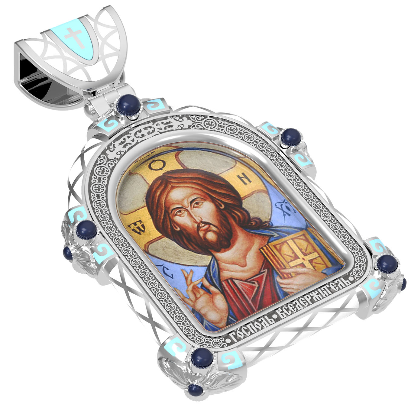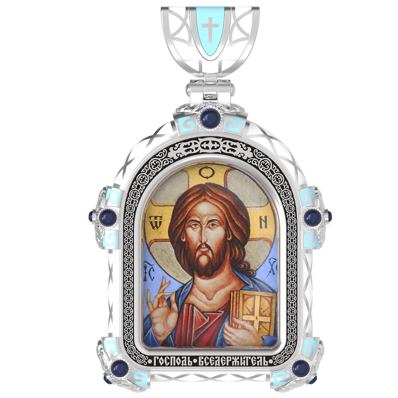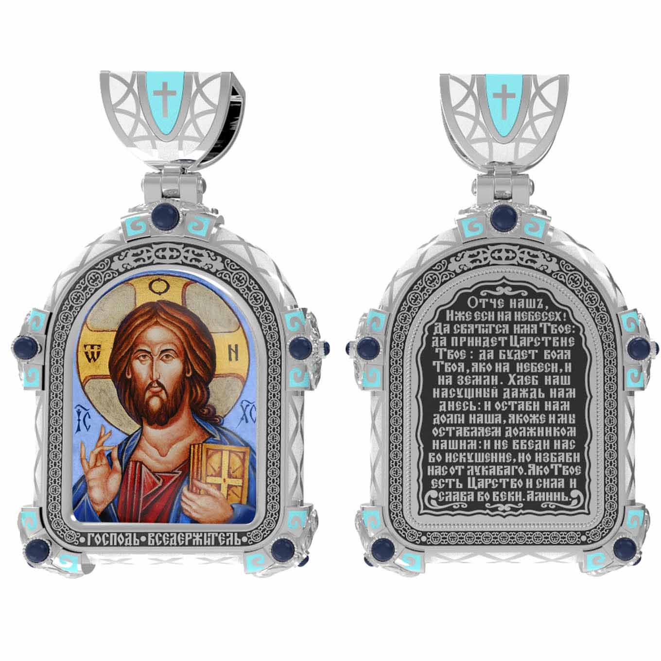 На лицевой стороне образка изображена икона Господа и Спасителя нашего Иисуса Христа — Господь Вседержитель или Пантократор (от греч. всевластный, всесильный). Он представлен как Царь Небесный и будущий Судия мира. Именование Иисуса «Вседержителем» указывает, с одной стороны, на Его Божественную природу: «Аз есмь Альфа и Омега, начало и конец, говорит Господь, Который есть и был и грядет, Вседержитель» (Откр. 1: 8). С другой стороны, такое именование связано и с человеческой природой Христа, искупившего крестной жертвой людские грехи и обновившего тем самым человеческую природу. Господь Иисусь Христос изображен фронтально огрудно. Главу Спасителя осеняет нимб, на нем угадывается крест. Крест символизирует голгофскую жертву Спасителя. По греческой традиции, на нимбе написаны буквы Омега, Омикрон, Ню — вместе они обозначают слово Сущий, одно из имен и характеристику Бога, согласно Священному Писанию. Правой рукой Он благословляет, а левой держит Евангелие — благую весть, принесенную Христом всему миру. Также означает она тот новый мир, который будет сотворен Богом после второго пришествия Христа. Символизирует и Книгу Жизни, где записаны имена всех, возлюбивших Бога. Всемогущий Бог предстает здесь не как обличающий судья, а как милостивый отец, ждущий возвращения блудных детей.