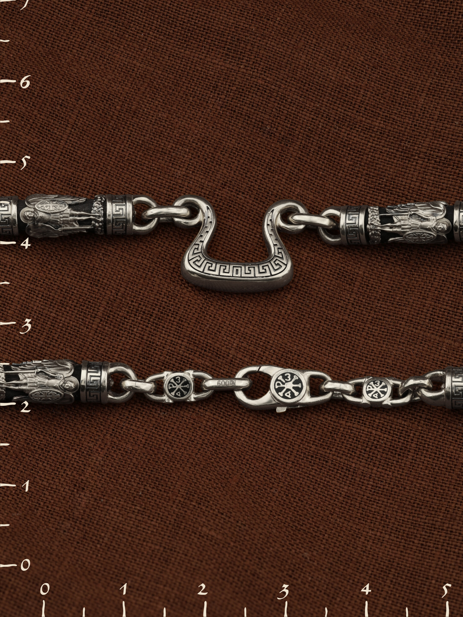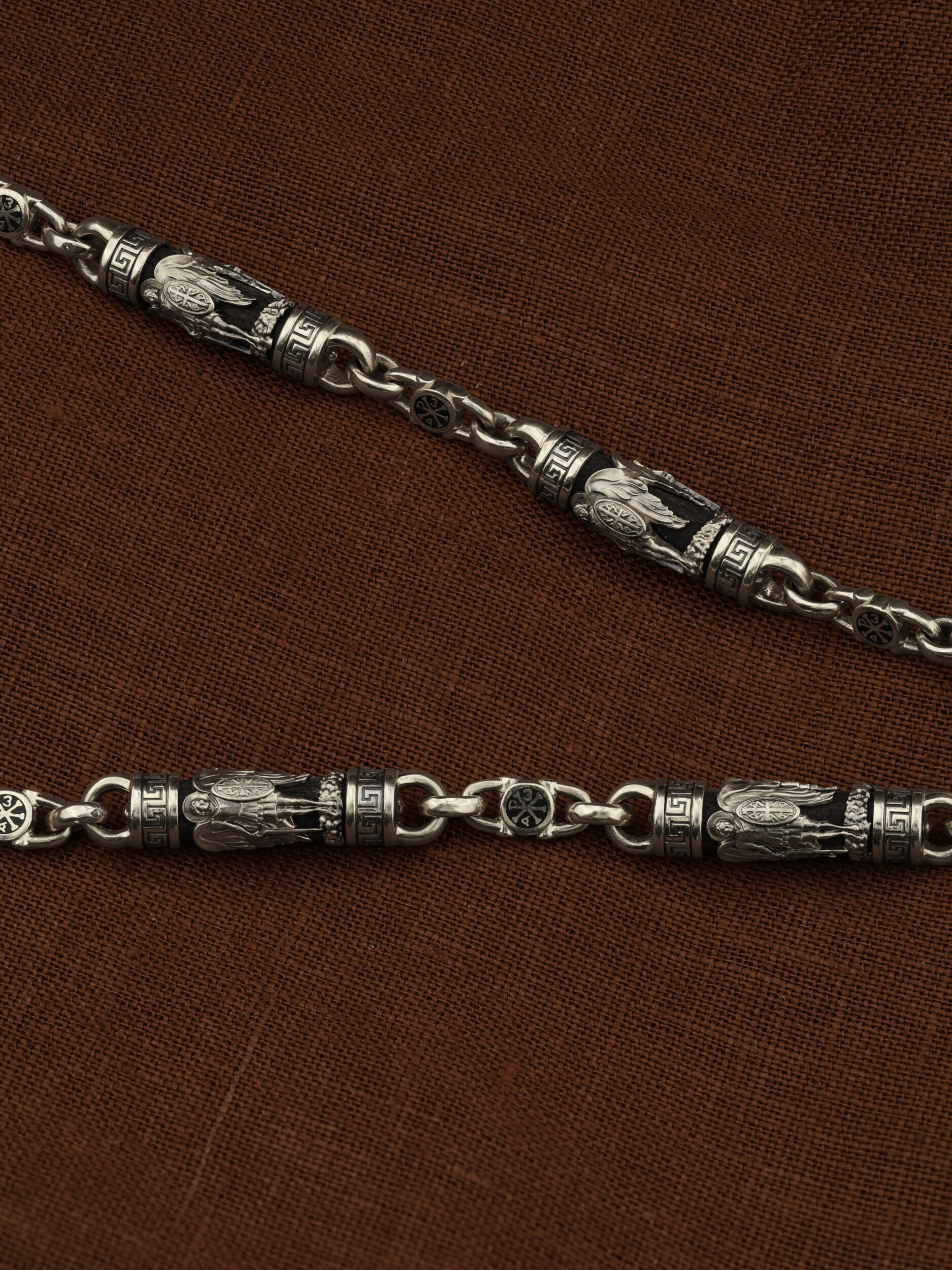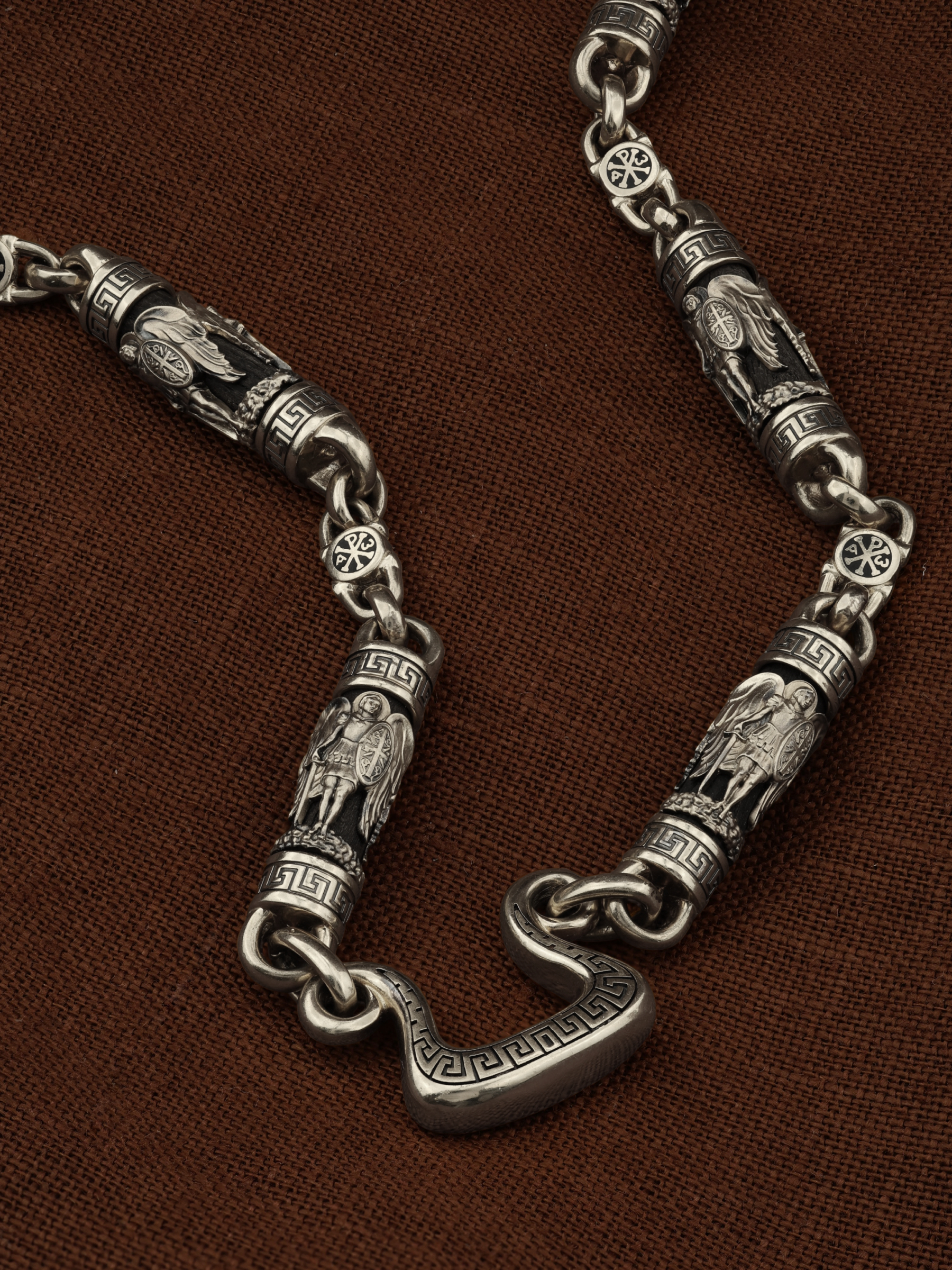На звеньях цепи изображена Хризма — монограмма имени Христа, которая состоит из двух начальных греческих букв имени — Х (хи) и Р (ро), скрещённых между собой. По краям монограммы помещены греческие буквы a и w. Такое употребление этих букв восходит к тексту Апокалипсиса: «Аз есмь Альфа и Омега, начало и конец, говорит Господь, Который есть и был и грядет, Вседержитель.» (Откр. 1:8; см. также Откр. 22:13). Также на звеньях изображен Святой Ангел-Хранитель в виде прекрасного юноши держащего в правой руке мечь, а в левой — щит. Ангел-Хранитель — это Ангел приставляемый Богом к человеку при крещении для охраны и помощи в добрых делах. Он невидимо находится при человеке на протяжении всей его жизни, если человек сохраняет в себе любовь к Богу и истинную веру перед Ним. Ангел-Xранитель делают для нас все, что служит к истинному нашему благу и спасению. Невидимо пребывая при нас постоянно, он, руководствуя нас ко спасению, не только по нашему желанию таинственно наставляет нас на все доброе и полезное, не только возносит наши молитвы к Богу, но еще и сам от себя охраняют и защищают нас от врагов видимых и невидимых и ходатайствует за нас пред Богом. Ангел-Хранитель так любит нас, как никто на земле любить не может. Одного лишь каждому из нас он желает — спасения души; к этому он направляет все свои заботы. И если видит нас также заботящимися о спасении, радуется, если же видит нас пребывающими в нерадении о душе своей, скорбит. Но и самый великий грешник может примириться со своим Ангелом-Хранителем посредством искреннего раскаяния в грехах и оставления их навсегда. В таком случае, по слову Писания, великая радость бывает для всех ангелов на небесах (Лк. 15:10). Цепь украшена орнаментом.