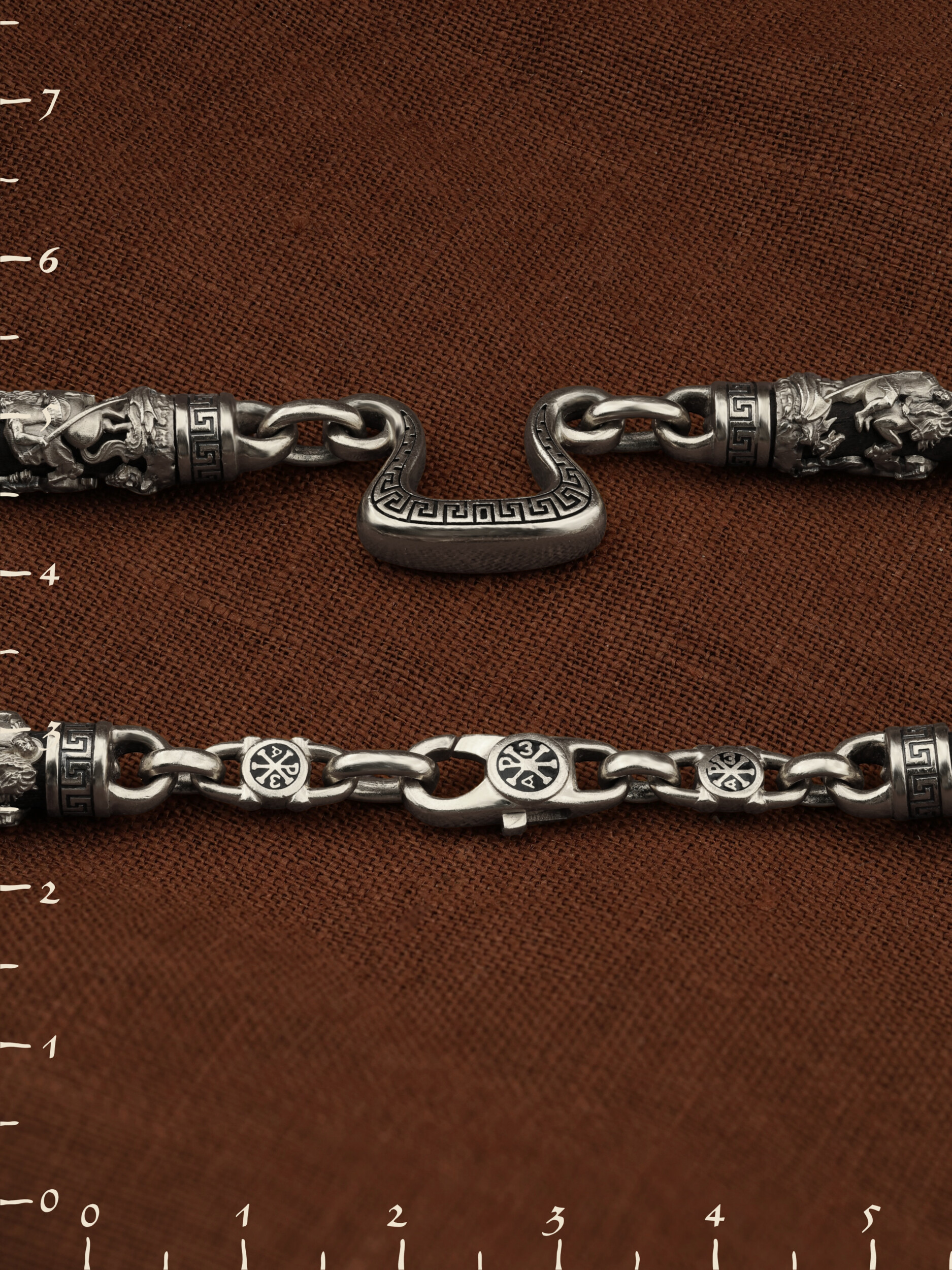 На звеньях цепи изображена Хризма — монограмма имени Христа, которая состоит из двух начальных греческих букв имени — Х (хи) и Р (ро), скрещённых между собой. По краям монограммы помещены греческие буквы a и w. Такое употребление этих букв восходит к тексту Апокалипсиса: «Аз есмь Альфа и Омега, начало и конец, говорит Господь, Который есть и был и грядет, Вседержитель.» (Откр. 1:8; см. также Откр. 22:13). Также на звеньях цепи помещено изображен святого великомученика Георгия Победоносца — одного из самых почитаемых и удивительных святых. Георгий родился в Каппадокии (Малая Азия) в семье богатых и знатных горожан. Юношей поступил на службу к римскому императору Диоклетиану, за отличное знание военного дела и проявленную в боях и походах храбрость был приближен к императору и удостоен высокого воинского звания. Во время начавшихся гонений на христиан, перешел на сторону гонимых и, отвергнув человеческий страх, стал ярым проповедником учения Христа. Мучители подвергли опального воеводу жесточайшим восьмидневным пыткам и казнили его (обезглавили) в возрасте около тридцати лет в 303 году. На Руси он известен как Юрий или Егорий, заступник для верующих, чья жизнь имеет какое-либо отношение к военным делам, помощник в крестьянском труде. На цепи Георгий изображен как воитель, сидящий на вздыбленном коне и поражающий копьем огнедышащего змея. Змей символизирует собою сатанинские силы. Молитвами вознесенными к Всевышнему и своей непреклонной верой он смог одолеть чудовище. Святой убил змея, спас царскую дочь, принесенную в жертву, и жителей города, их души от влияния дьявола, породив в них надежду и веру в Господа, призывая людей принять христианскую веру. Цепь украшена орнаментом.