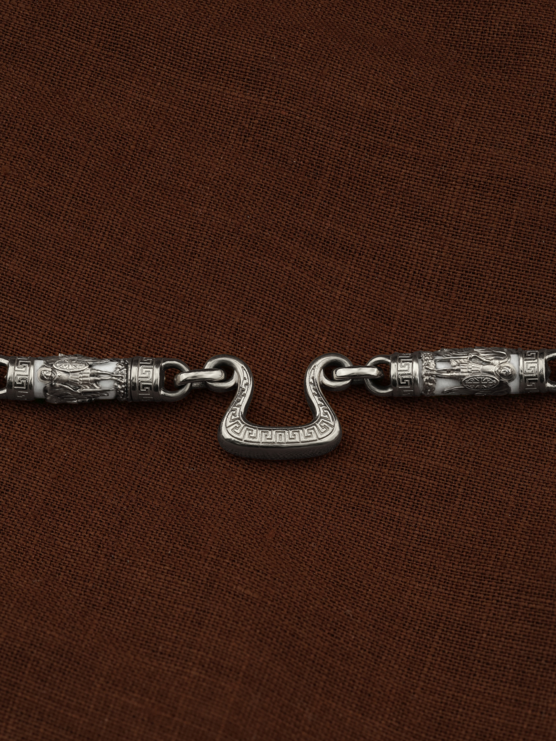На звеньях цепи изображена Хризма — монограмма имени Христа, которая состоит из двух начальных греческих букв имени — Х (хи) и Р (ро), скрещённых между собой. По краям монограммы помещены греческие буквы a и w. Такое употребление этих букв восходит к тексту Апокалипсиса: «Аз есмь Альфа и Омега, начало и конец, говорит Господь, Который есть и был и грядет, Вседержитель.» (Откр. 1:8; см. также Откр. 22:13). Также на звеньях изображен Святой Ангел-Хранитель в виде прекрасного юноши держащего в правой руке мечь, а в левой — щит. Ангел-Хранитель — это Ангел приставляемый Богом к человеку при крещении для охраны и помощи в добрых делах. Он невидимо находится при человеке на протяжении всей его жизни, если человек сохраняет в себе любовь к Богу и истинную веру перед Ним. Ангел-Xранитель делают для нас все, что служит к истинному нашему благу и спасению. Невидимо пребывая при нас постоянно, он, руководствуя нас ко спасению, не только по нашему желанию таинственно наставляет нас на все доброе и полезное, не только возносит наши молитвы к Богу, но еще и сам от себя охраняют и защищают нас от врагов видимых и невидимых и ходатайствует за нас пред Богом. Ангел-Хранитель так любит нас, как никто на земле любить не может. Одного лишь каждому из нас он желает — спасения души; к этому он направляет все свои заботы. И если видит нас также заботящимися о спасении, радуется, если же видит нас пребывающими в нерадении о душе своей, скорбит. Но и самый великий грешник может примириться со своим Ангелом-Хранителем посредством искреннего раскаяния в грехах и оставления их навсегда. В таком случае, по слову Писания, великая радость бывает для всех ангелов на небесах (Лк. 15:10). Цепь украшена орнаментом.