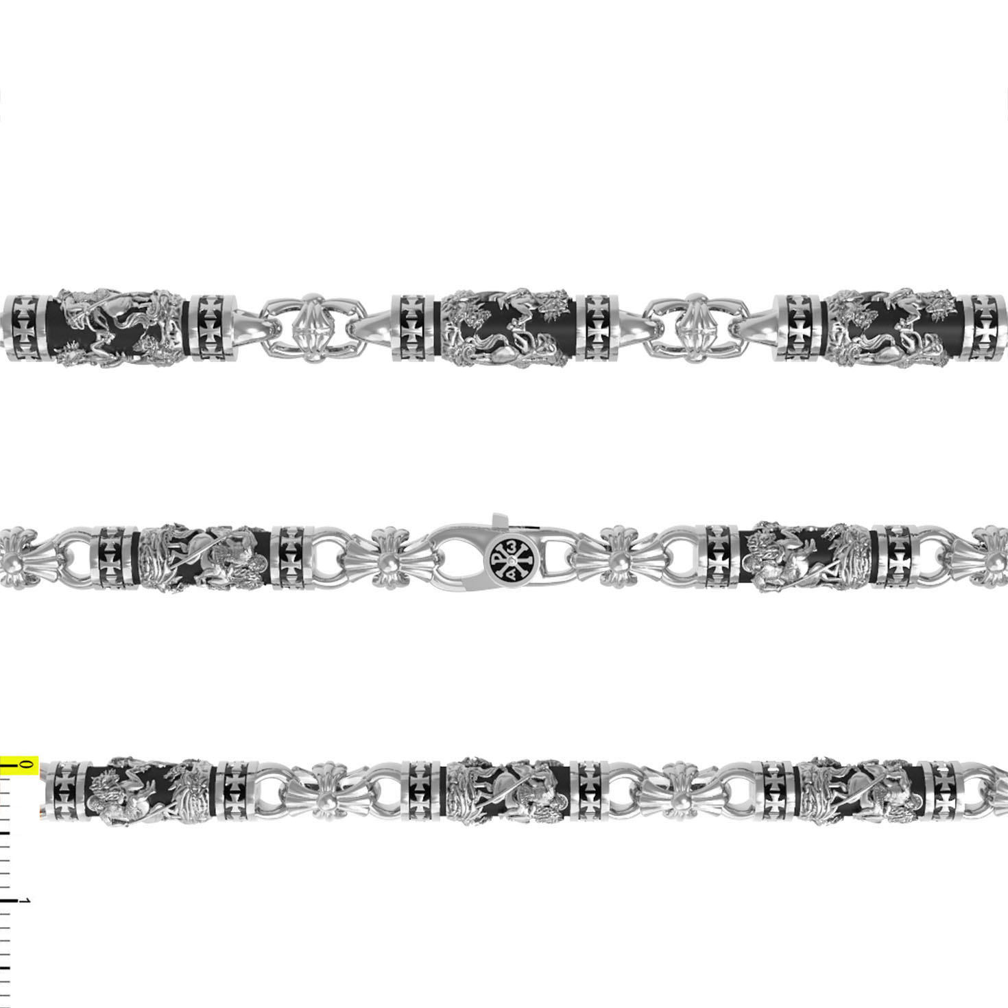 На звеньях цепи помещено изображение святого великомученика Георгия Победоносца — одного из самых почитаемых и удивительных святых. Георгий родился в Каппадокии (Малая Азия) в семье богатых и знатных горожан. Юношей поступил на службу к римскому императору Диоклетиану, за отличное знание военного дела и проявленную в боях и походах храбрость был приближен к императору и удостоен высокого воинского звания. Во время начавшихся гонений на христиан, перешел на сторону гонимых и, отвергнув человеческий страх, стал ярым проповедником учения Христа. Мучители подвергли опального воеводу жесточайшим восьмидневным пыткам и казнили его (обезглавили) в возрасте около тридцати лет в 303 году. На Руси он известен как Юрий или Егорий, заступник для верующих, чья жизнь имеет какое-либо отношение к военным делам, помощник в крестьянском труде. На цепи Георгий изображен как воитель, сидящий на вздыбленном коне и поражающий копьем огнедышащего змея. Змей символизирует собою сатанинские силы. Молитвами вознесенными к Всевышнему и своей непреклонной верой он смог одолеть чудовище. Святой убил змея, спас царскую дочь, принесенную в жертву, и жителей города, их души от влияния дьявола, породив в них надежду и веру в Господа, призывая людей принять христианскую веру.. На замке цепи изображена Хризма — монограмма имени Христа, которая состоит из двух начальных греческих букв имени — Х (хи) и Р (ро), скрещённых между собой. По краям монограммы помещены греческие буквы a и w. Такое употребление этих букв восходит к тексту Апокалипсиса: «Аз есмь Альфа и Омега, начало и конец, говорит Господь, Который есть и был и грядет, Вседержитель.» (Откр. 1:8; см. также Откр. 22:13).