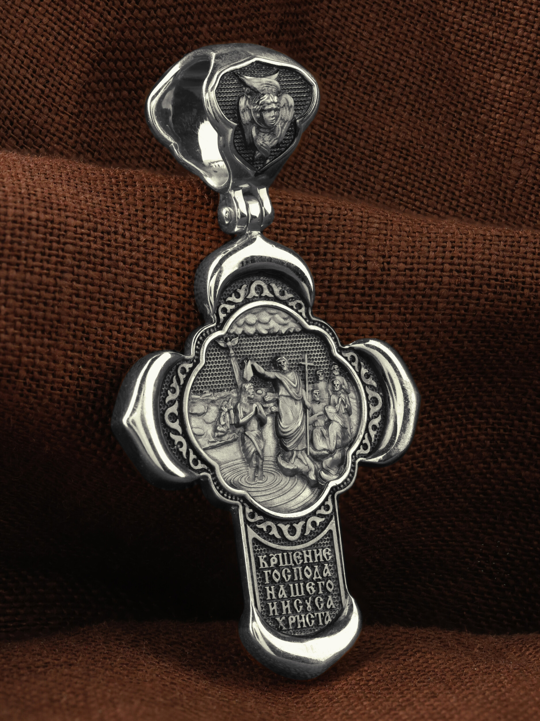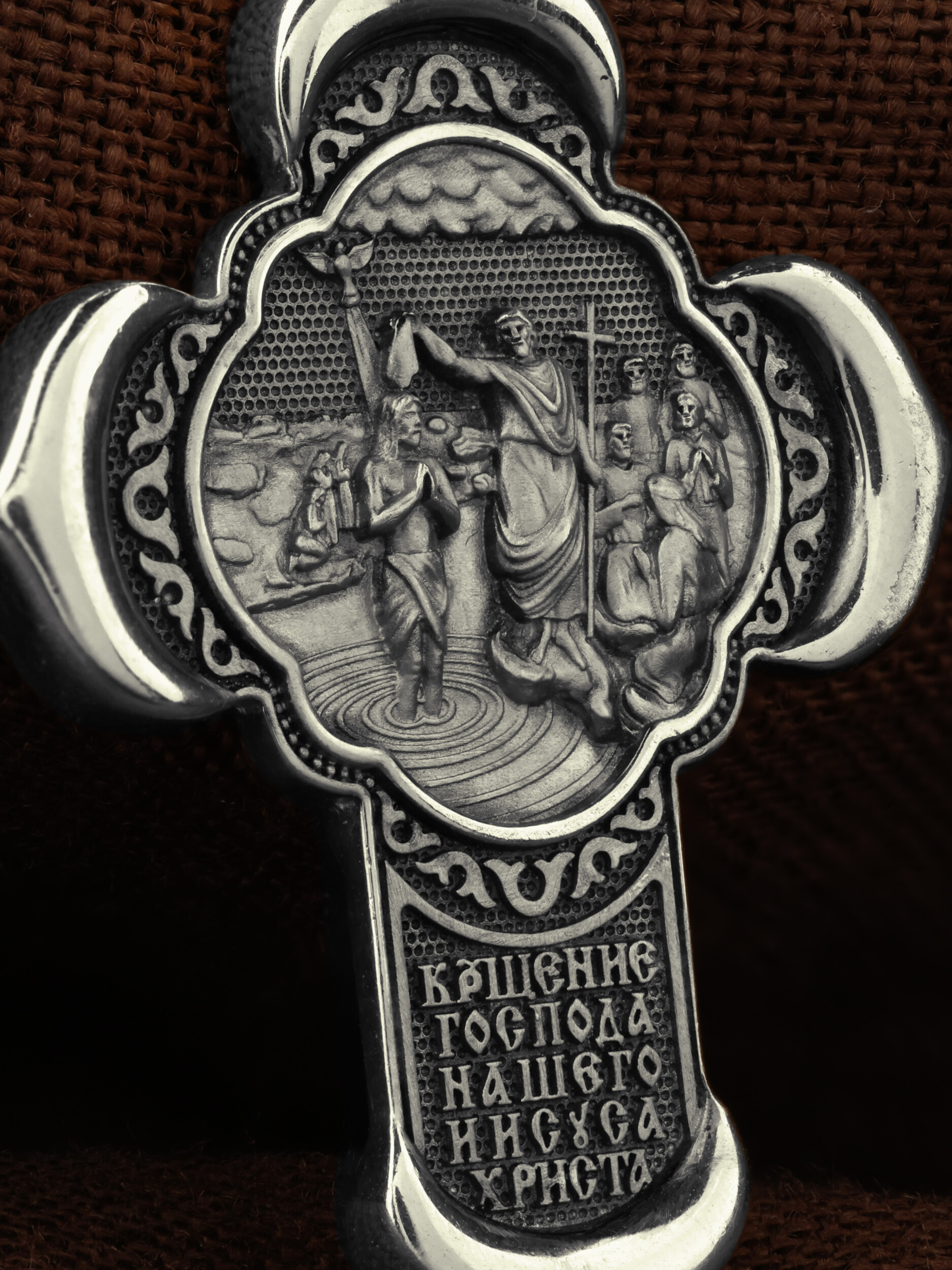 На оборотной стороне креста изображено Крещение Господа и Спасителя нашего Иисуса Христа, которое он принял в водах реки Иордан от Иоанна Предтечи. После крещения, когда Христос вышел из воды, вдруг разверзлись небеса. Дух Святой в образе голубя, осеняя Божественным светом, опустился на Иисуса и с неба раздалось: «Сей есть Сын Мой возлюбленный, в котором Мое благоволение» (Мф. 3,16−17). Погрузившись в воды Иордана, Господь освятил воду и сделал ее способной омывать человеческие грехи.