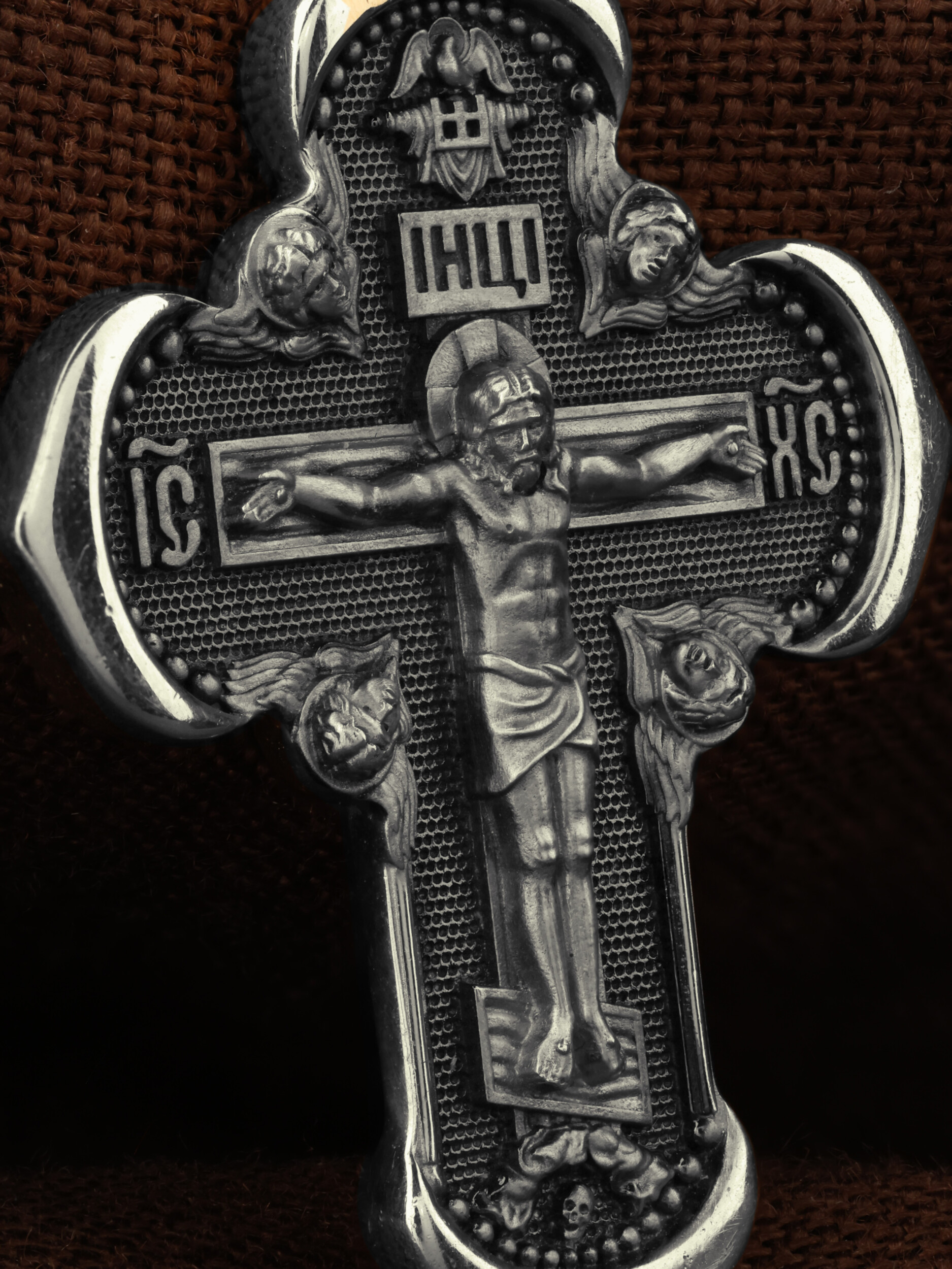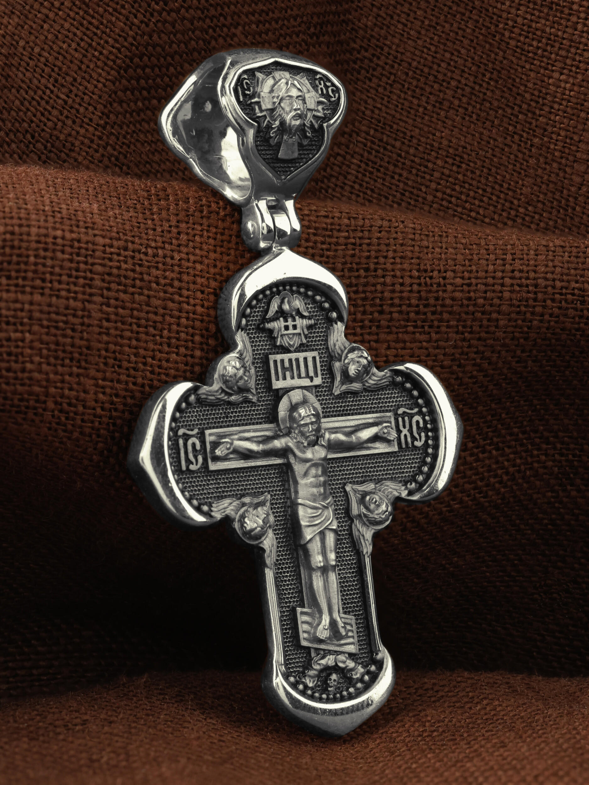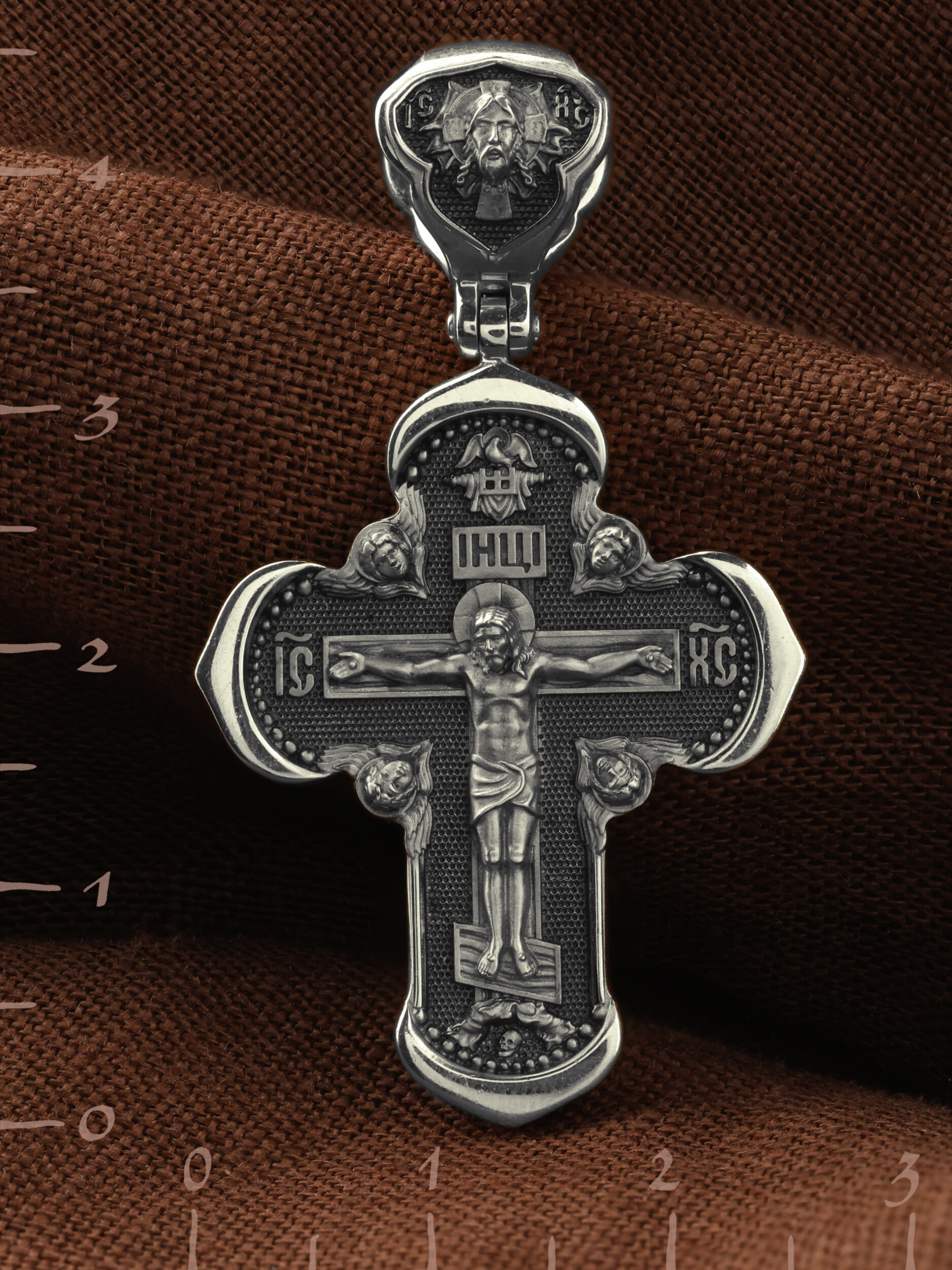 Под подножием Креста изображена покоящаяся голова (череп) Адама. Вокруг Распятия помещены изображения На лицевой стороне креста изображено Распятие Господа и Спасителя нашего Иисуса Христа. Крест- символ спасения и искупления рода человеческого, знамение победы над смертью и адом. Иисус Христос, как искупительная жертва освобождения человечества от власти греха, умер крестной смертью и в третий день воскрес. На верхней табличке, выше головы Иисуса, расположена надпись, составленная Понтием Пилатом — «IНЦI». Она означает «Иисус Назорей, Царь Иудейский». Надпись «IС» « ХС» означает Иисус Христос и помещается на разных сторонах поперечной перекладины креста. Возвышение, на котором стоит Крест, символизирует гору Голгофу, на которой произошло Распятие. Ангелов Серафимов. На кулонном кольце изображен Нерукотворный образ Господа и Спасителя нашего Иисуса Христа, чудесно отпечатавшийся на плате, котором Христос вытер свой лик.