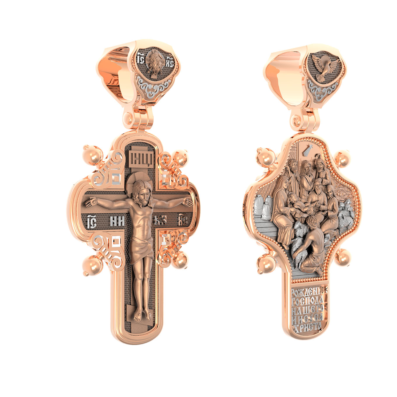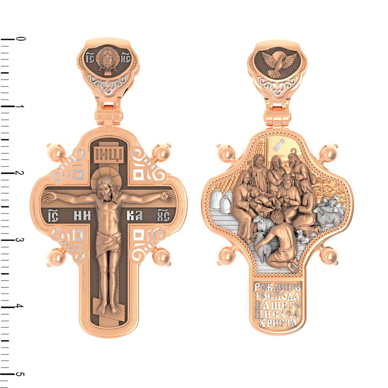 На оборотной стороне креста помещено изображение иконы «Рождество Христово». Господь Иисус Христос родился от Пресвятой Девы Марии в царствование императора Августа в городе Вифлееме. Как раз в это время Август повелел сделать всенародную перепись по всей своей империи, согласно которой каждый житель Палестины должен был идти в тот город, к которому испокон веков принадлежал его род. Пресвятая Богородица и праведный Иосиф, как происходившие от рода Давидова, должны были идти в Вифлеем (город Давида), чтобы внести свои имена в список подданных кесаря: «Пошел также и Иосиф из Галилеи, из города Назарета, в Иудею, в город Давидов, называемый Вифлеем, потому что он был из дома и рода Давидова, записаться с Мариею, обрученною ему женою, которая была беременна. Когда же они были там, наступило время родить Ей; и родила Сына своего Первенца, и спеленала Его, и положила Его в ясли, потому что не было им места в гостинице» (Лк.2:4−7).После рождения Спасителя на поле близ Вифлеема простым пастухам явились ангелы, благовествовавшие о пришествии в мир Христа песней славословия Господу: «Слава в вышних Богу, и на земли мир, в человецех благоволение!». Они повелели пастырям идти поклониться Младенцу. В это же время к Рожденному с дарами из дальних стран — златом, ливаном и смирной — пришли волхвы, которых к яслям Богомладенца привела воссиявшая в небе новая звезда. На кулонном кольце изображен Дух Святой в виде голубя сходящего с небес.