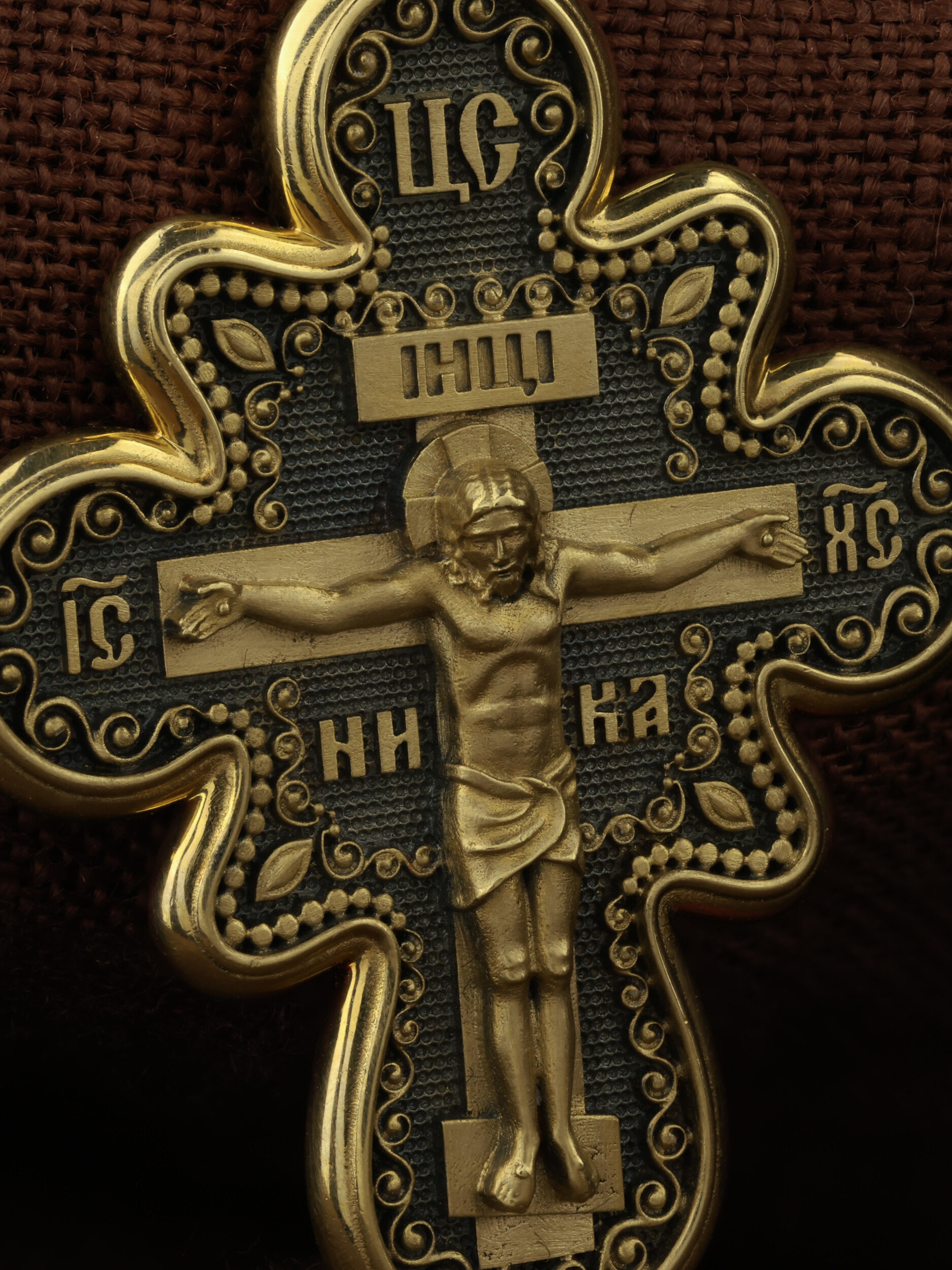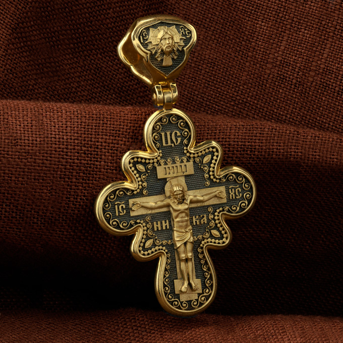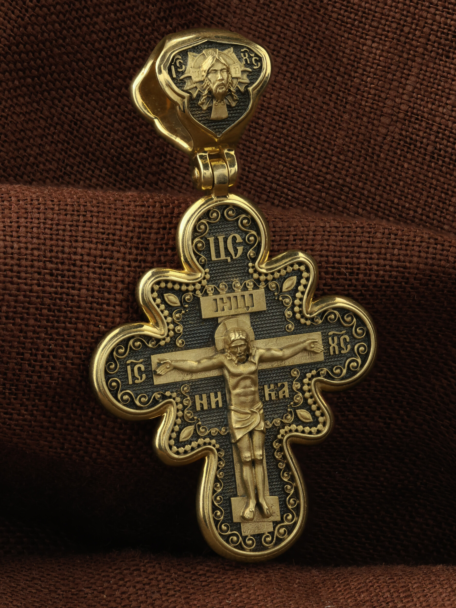На лицевой стороне креста изображено Распятие Господа и Спасителя нашего Иисуса Христа. Крест- символ спасения и искупления рода человеческого, знамение победы над смертью и адом. Иисус Христос, как искупительная жертва освобождения человечества от власти греха, умер крестной смертью и в третий день воскрес. Над Распятием помещена надпись «Царь Славы». На верхней табличке, выше головы Иисуса, расположена надпись, составленная Понтием Пилатом — «IНЦI». Она означает «Иисус Назорей, Царь Иудейский». Надпись «IC» «ХC», означает Иисус Христос, помещается на разных сторонах поперечной перекладины креста. Рядом — слово «НИКА», что означает «победитель». На кулонном кольце изображен Нерукотворный образ Господа и Спасителя нашего Иисуса Христа, чудесно отпечатавшийся на плате, которым Христос вытер свой лик.