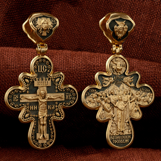 На оборотной стороне креста изображена икона Вознесение Господне. Описание события Вознесения Христова содержится в Евангелиях от Луки (Лк. 24, 50−51) и Марка (Мк. 16, 19), а также в Деяниях свв. апостолов (Деян 1, 9−11). Согласно этим повествованиям, после Своего Воскресения из мертвых Спаситель неоднократно являлся ученикам, чтобы удостоверить их в истинности Своего телесного Воскресения, укрепить в них веру и подготовить к принятию обетованного Святого Духа (Ин. 16, 7). На сороковой день после Своего Воскресения Господь Иисус Христос вывел учеников, собранных в Иерусалиме, из города в Вифанию, на гору Елеон (Деян. 1, 12). Здесь, после благословения апостолов, Он стал отдаляться от них и возноситься на небо. В Деяниях св. апостолов также упомянуто, что во время Вознесения Христова явились «два мужа в белой одежде», которые возвестили Его Второе пришествие: «Мужи галилейские! Что вы стоите и смотрите на небо? Сей Иисус, вознесшийся от вас на небо, придет таким же образом, как вы видели его восходящим на небо» (Деян. 1, 11). После Вознесения Господня ученики с радостью вернулись в Иерусалим (Лк. 24, 52), ожидая сошествия на них Святого Духа, которое произошло через несколько дней (Деян. 2, 1−4). На кулонном кольце изображен шестикрылый Ангел — Серафим.