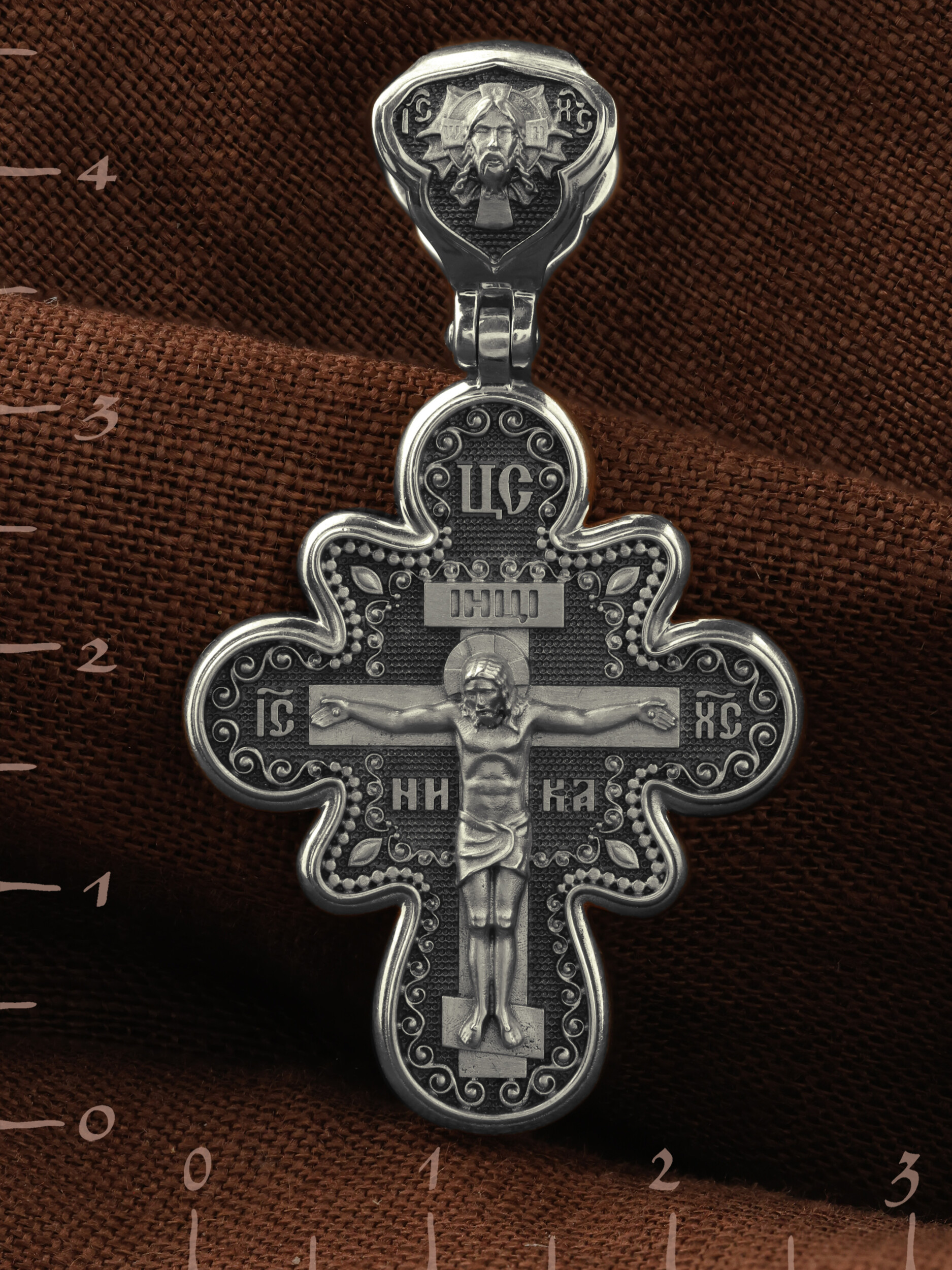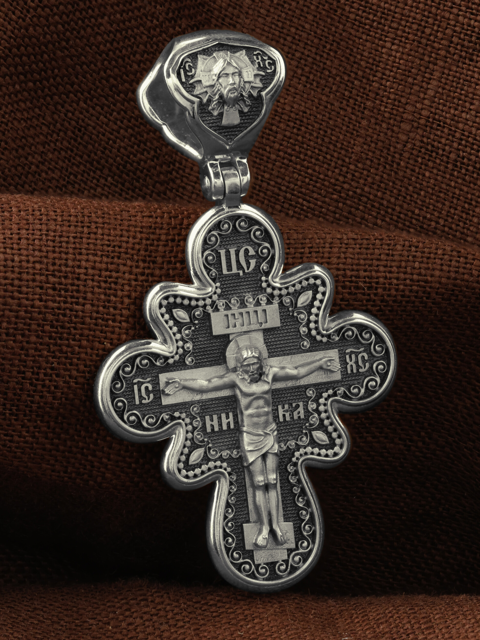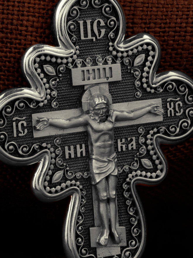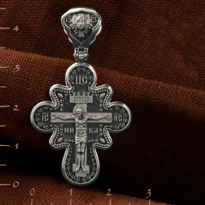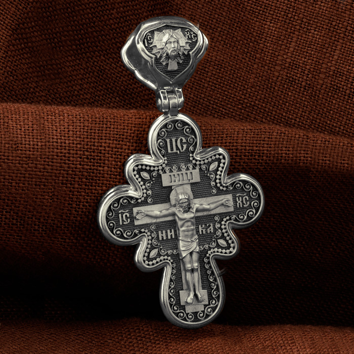 На лицевой стороне креста изображено Распятие Господа и Спасителя нашего Иисуса Христа. Крест- символ спасения и искупления рода человеческого, знамение победы над смертью и адом. Иисус Христос, как искупительная жертва освобождения человечества от власти греха, умер крестной смертью и в третий день воскрес. Над Распятием помещена надпись «Царь Славы». На верхней табличке, выше головы Иисуса, расположена надпись, составленная Понтием Пилатом — «IНЦI». Она означает «Иисус Назорей, Царь Иудейский». Надпись «IC» «ХC», означает Иисус Христос, помещается на разных сторонах поперечной перекладины креста. Рядом — слово «НИКА», что означает «победитель». На кулонном кольце изображен Нерукотворный образ Господа и Спасителя нашего Иисуса Христа, чудесно отпечатавшийся на плате, которым Христос вытер свой лик.