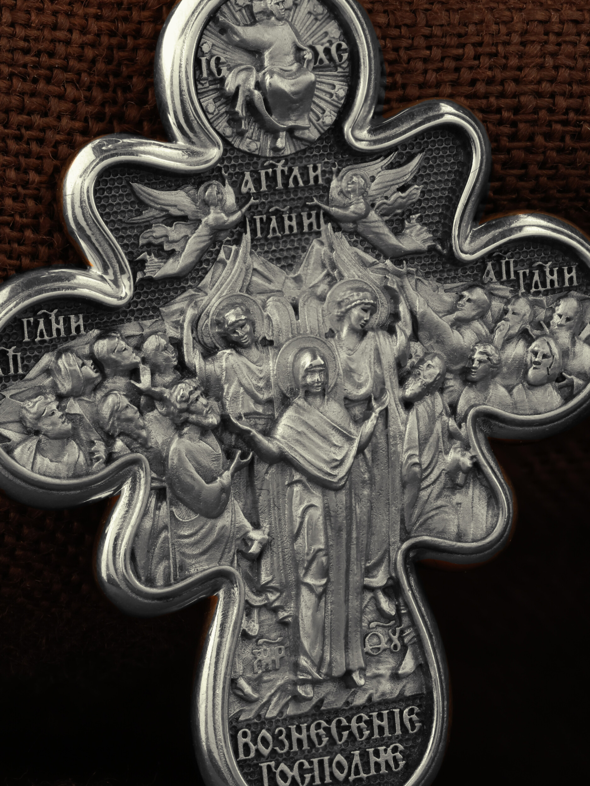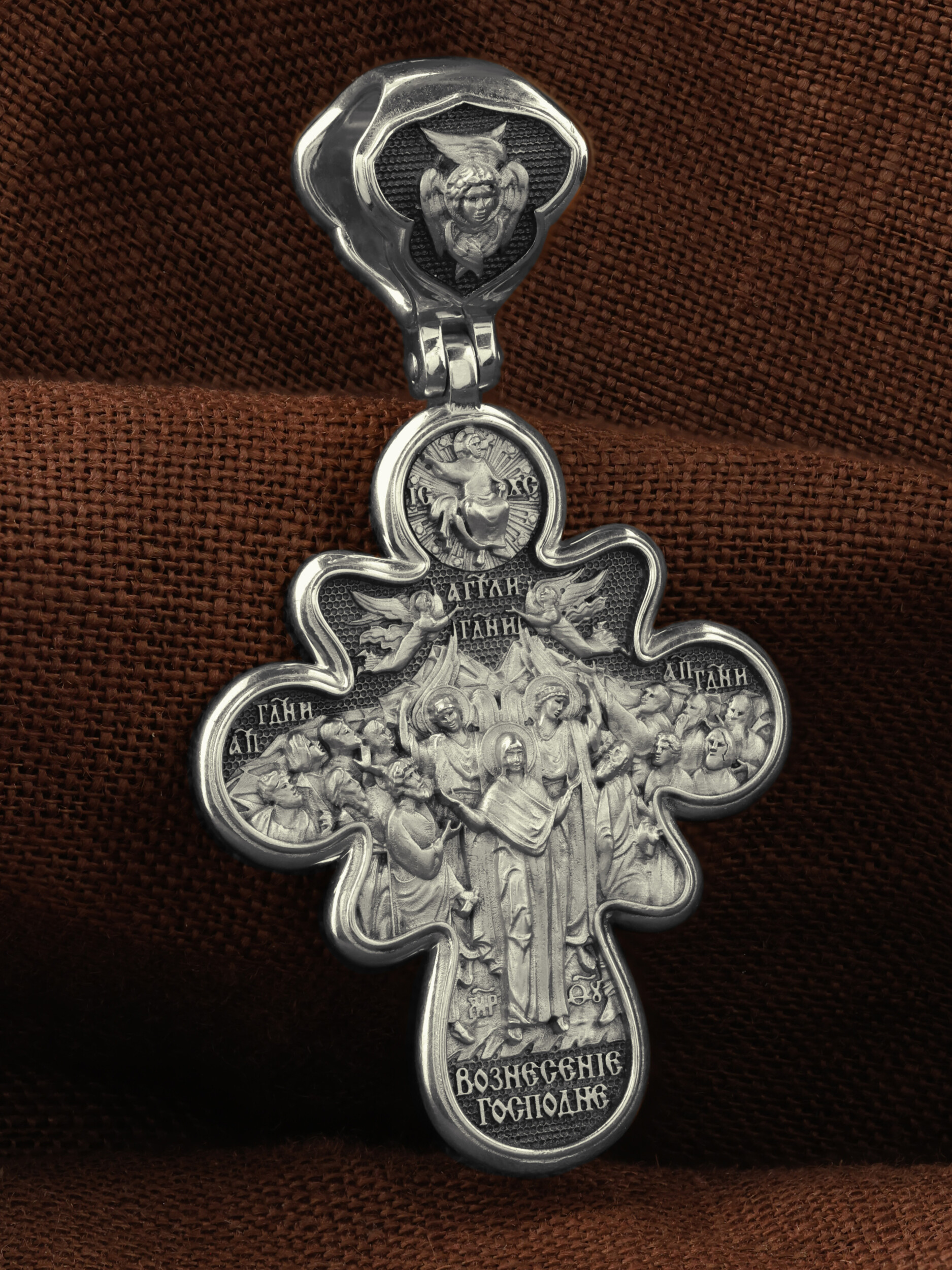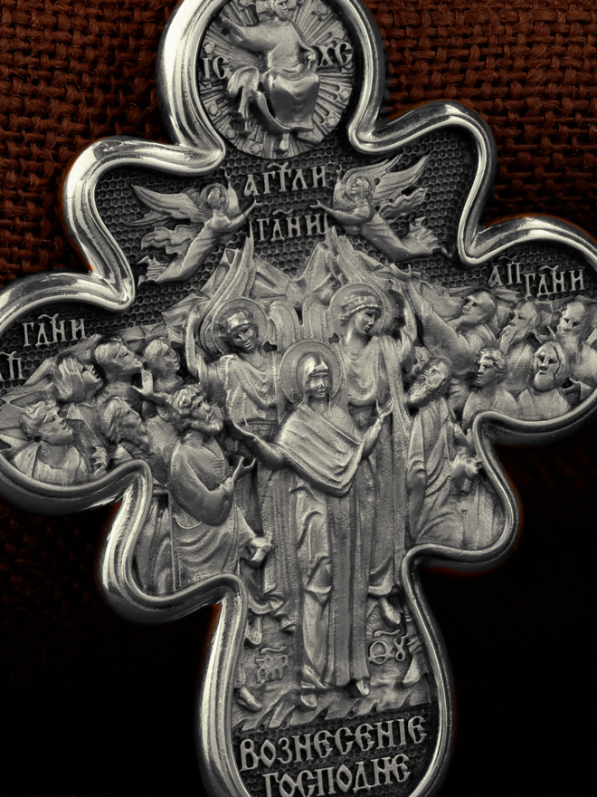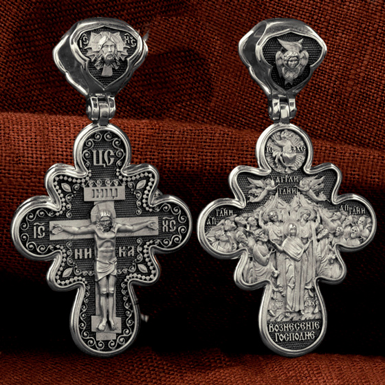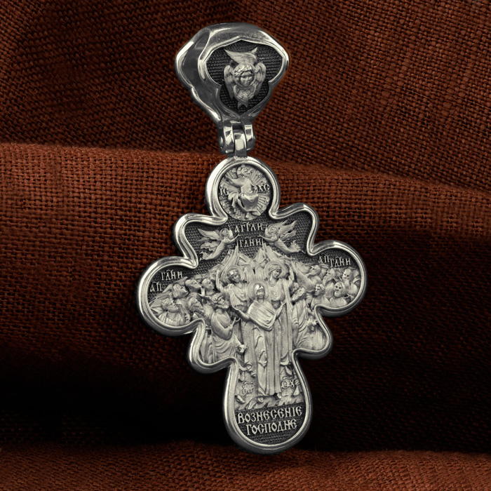 На оборотной стороне креста изображена икона Вознесение Господне. Описание события Вознесения Христова содержится в Евангелиях от Луки (Лк. 24, 50−51) и Марка (Мк. 16, 19), а также в Деяниях свв. апостолов (Деян 1, 9−11). Согласно этим повествованиям, после Своего Воскресения из мертвых Спаситель неоднократно являлся ученикам, чтобы удостоверить их в истинности Своего телесного Воскресения, укрепить в них веру и подготовить к принятию обетованного Святого Духа (Ин. 16, 7). На сороковой день после Своего Воскресения Господь Иисус Христос вывел учеников, собранных в Иерусалиме, из города в Вифанию, на гору Елеон (Деян. 1, 12). Здесь, после благословения апостолов, Он стал отдаляться от них и возноситься на небо. В Деяниях св. апостолов также упомянуто, что во время Вознесения Христова явились «два мужа в белой одежде», которые возвестили Его Второе пришествие: «Мужи галилейские! Что вы стоите и смотрите на небо? Сей Иисус, вознесшийся от вас на небо, придет таким же образом, как вы видели его восходящим на небо» (Деян. 1, 11). После Вознесения Господня ученики с радостью вернулись в Иерусалим (Лк. 24, 52), ожидая сошествия на них Святого Духа, которое произошло через несколько дней (Деян. 2, 1−4). На кулонном кольце изображен шестикрылый Ангел — Серафим.