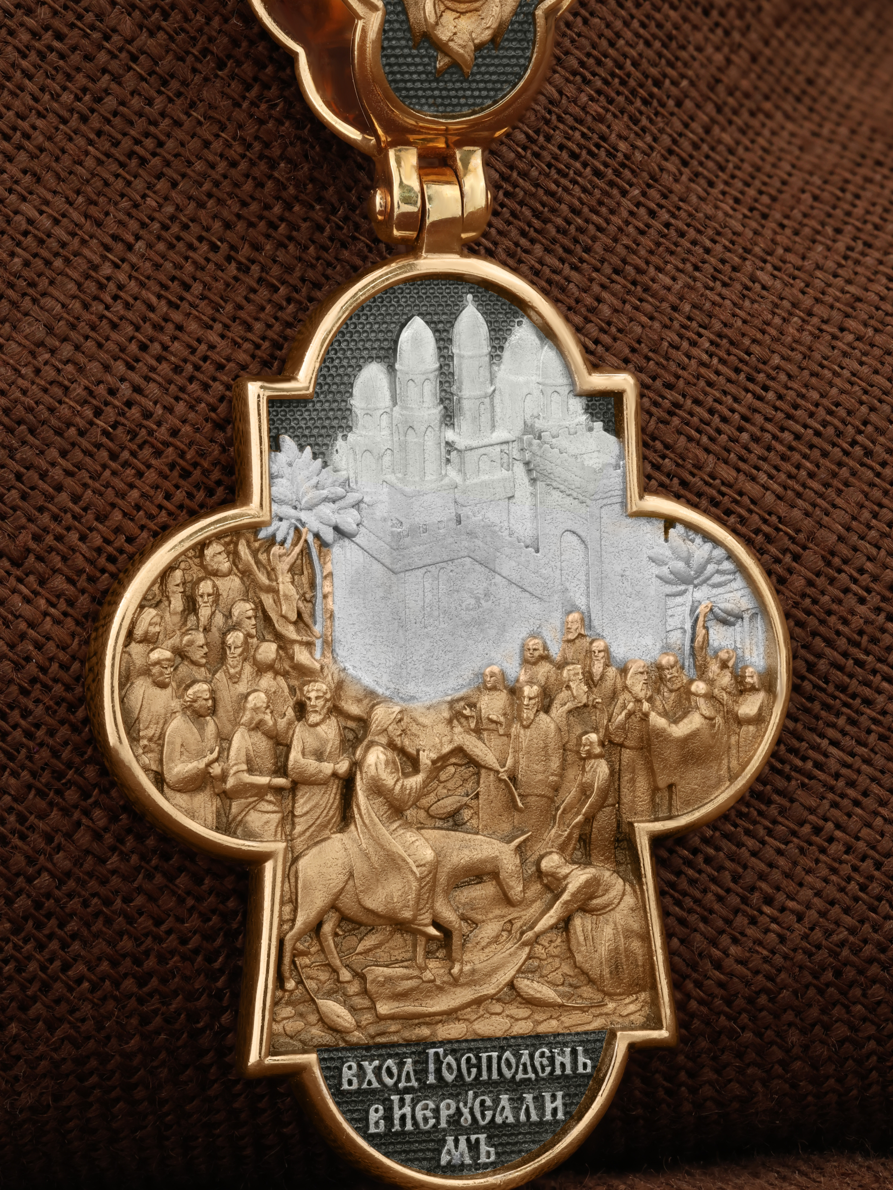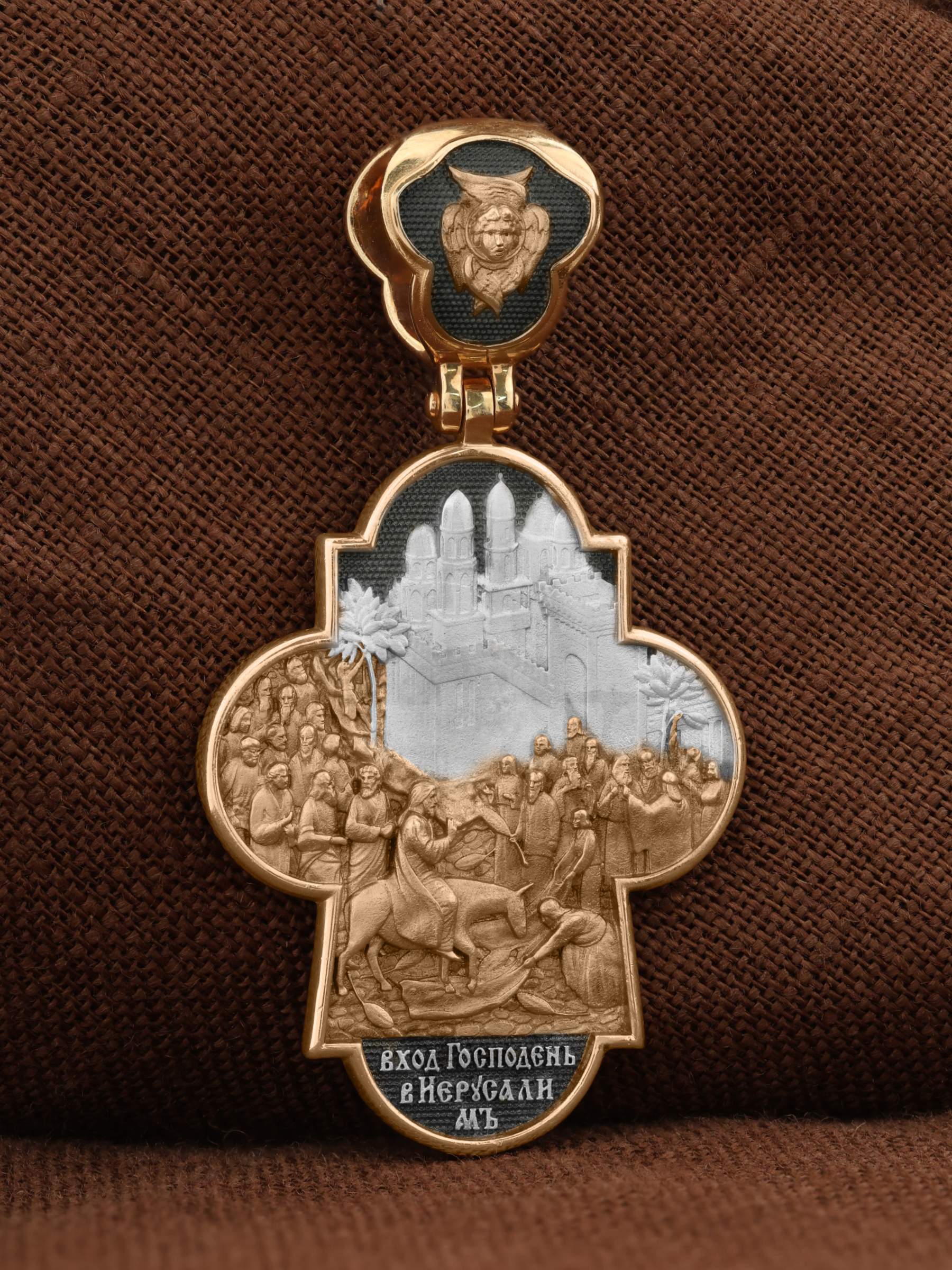 На оборотной стороне креста изображена икона Вход Господень во Иерусалим. Вход Господень в Иерусалим является одним из главных событий последних дней земной жизни Господа Иисуса Христа; оно описано четырьмя евангелистами. Господь в сопровождении учеников выехал из села Вифании и направился в Святой Град. С Елеонской горы Господь устремил свой взор на Иерусалим, вглядываясь в раскинувшийся внизу город, которому предназначено было стать Чашей Его Страданий. Толпы народа встречали Его, держа в руках пальмовые ветви (вайи), приветствуя криками: «Осанна!», что значит «спасение, радость, слава». Вход Господень в Иерусалим символически означает Второе Пришествие Христа. В Своем Первом Пришествии на землю Он явил Себя человечеству как Искупитель и Спаситель; во Втором — придет как Царь мира и Судия. На кулонном кольце изображен шестикрылый Ангел — Серафим.