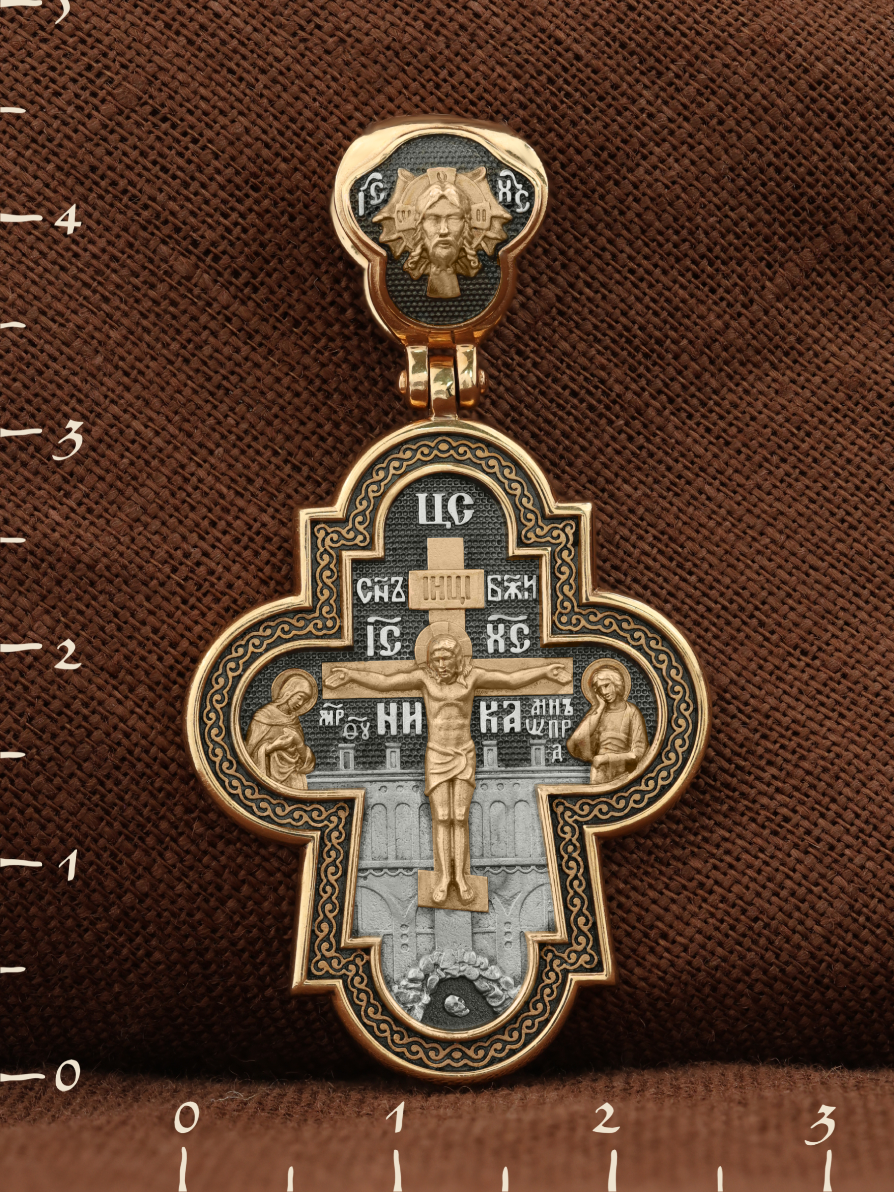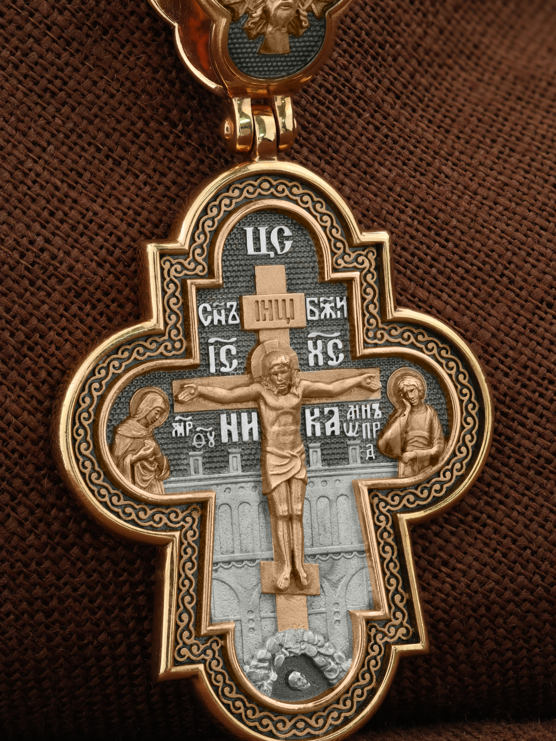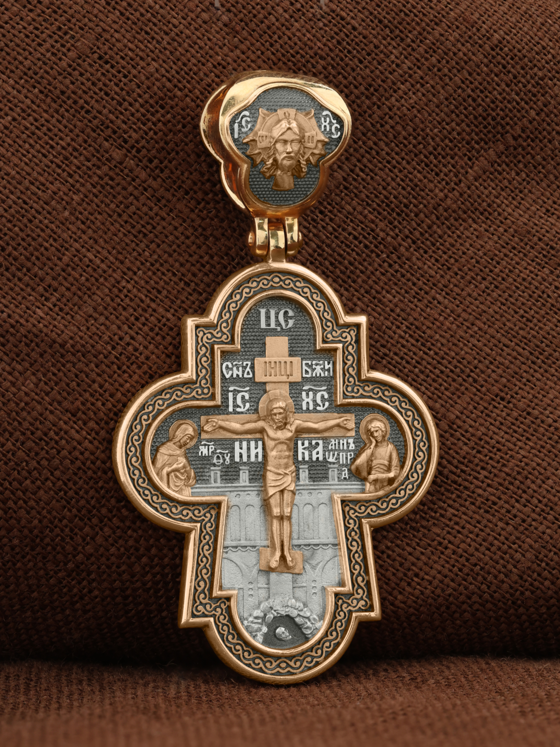 На лицевой стороне креста изображено Распятие Господа и Спасителя нашего Иисуса Христа, отдавшего Себя на смерть, для искупления грехов мира. Крест является символом жертвенной любви всеблагого Бога к падшим людям, всепобеждающим духовным оружием христиан, основанием и средоточием церковной жизни. Над Распятием помещена надпись «Царь Славы». Верхняя перекладина символизирует титло — табличку, на которой, согласно Евангелию, было начертано: Иисус Назорей Царь Иудейский (IНЦI). Распятие сопровождается надписями, олицетворяющими Христа. Надпись «Сын Божий» означает божественную природу Иисуса Христа. Надпись «IС» « ХС» означает Иисус Христос и размещена над поперечной перекладиной. Ниже — слово «НИКА», что означает «победитель». Слева от Распятия изображена Пресвятая Богородица, справа — апостол и евангелист Иоанн Богослов, один из ближайших учеников Иисуса Христа. За крестом высится Иерусалимская стена, в знак того, что Господь был распят вне стен города. Возвышение, на котором стоит Крест, символизирует гору Голгофу, на которой произошло Распятие. Под подножием Креста изображена покоящаяся голова (череп) Адама. На кулонном кольце изображен Нерукотворный образ Господа и Спасителя нашего Иисуса Христа, чудесно отпечатавшийся на плате, которым Христос вытер свой лик.