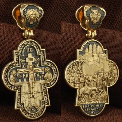 На оборотной стороне креста изображена икона Вход Господень во Иерусалим. Вход Господень в Иерусалим является одним из главных событий последних дней земной жизни Господа Иисуса Христа; оно описано четырьмя евангелистами. Господь в сопровождении учеников выехал из села Вифании и направился в Святой Град. С Елеонской горы Господь устремил свой взор на Иерусалим, вглядываясь в раскинувшийся внизу город, которому предназначено было стать Чашей Его Страданий. Толпы народа встречали Его, держа в руках пальмовые ветви (вайи), приветствуя криками: «Осанна!», что значит «спасение, радость, слава». Вход Господень в Иерусалим символически означает Второе Пришествие Христа. В Своем Первом Пришествии на землю Он явил Себя человечеству как Искупитель и Спаситель; во Втором — придет как Царь мира и Судия. На кулонном кольце изображен шестикрылый Ангел — Серафим.