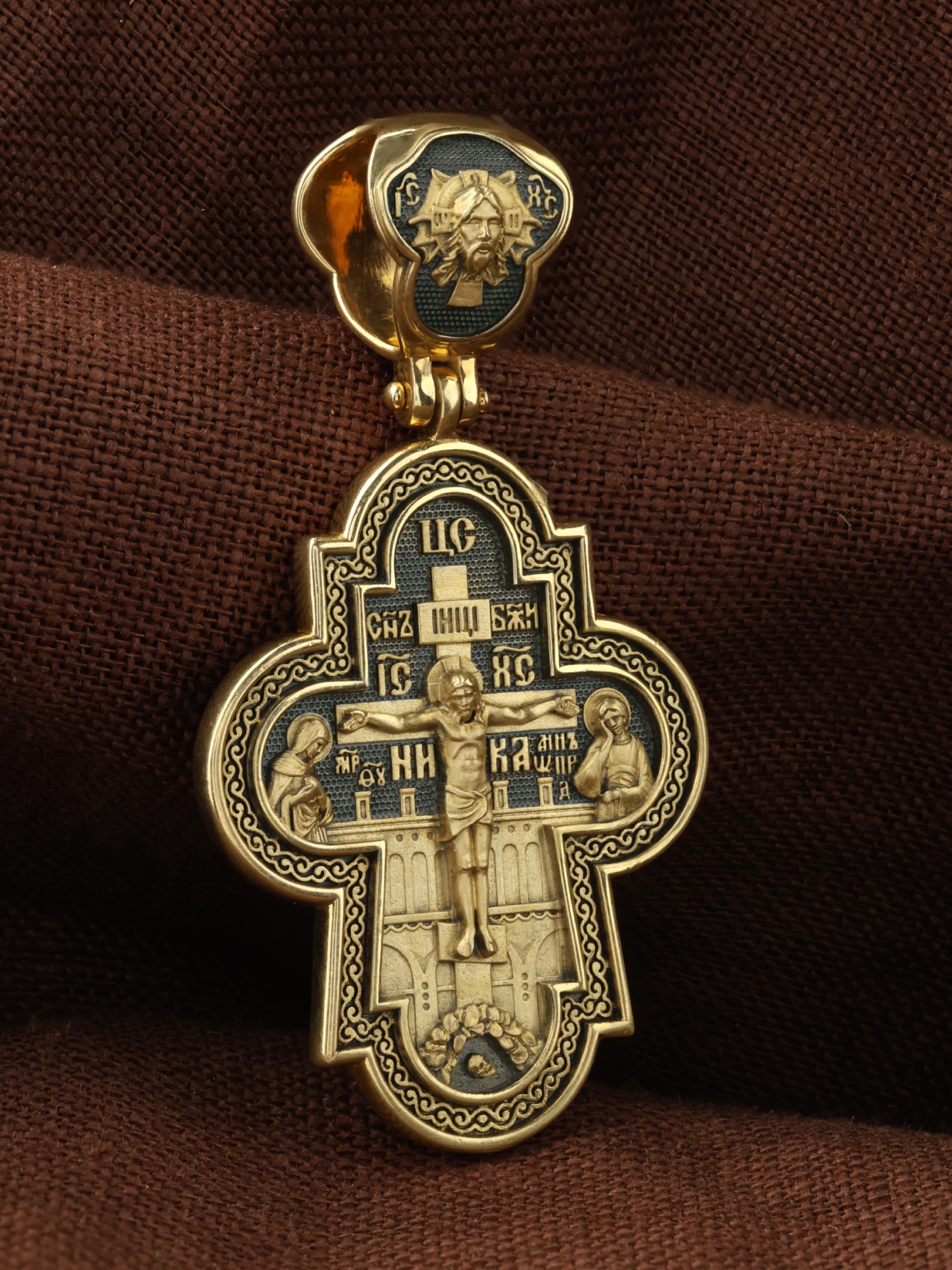 На лицевой стороне креста изображено Распятие Господа и Спасителя нашего Иисуса Христа, отдавшего Себя на смерть, для искупления грехов мира. Крест является символом жертвенной любви всеблагого Бога к падшим людям, всепобеждающим духовным оружием христиан, основанием и средоточием церковной жизни. Над Распятием помещена надпись «Царь Славы». Верхняя перекладина символизирует титло — табличку, на которой, согласно Евангелию, было начертано: Иисус Назорей Царь Иудейский (IНЦI). Распятие сопровождается надписями, олицетворяющими Христа. Надпись «Сын Божий» означает божественную природу Иисуса Христа. Надпись «IС» « ХС» означает Иисус Христос и размещена над поперечной перекладиной. Ниже — слово «НИКА», что означает «победитель». Слева от Распятия изображена Пресвятая Богородица, справа — апостол и евангелист Иоанн Богослов, один из ближайших учеников Иисуса Христа. За крестом высится Иерусалимская стена, в знак того, что Господь был распят вне стен города. Возвышение, на котором стоит Крест, символизирует гору Голгофу, на которой произошло Распятие. Под подножием Креста изображена покоящаяся голова (череп) Адама. На кулонном кольце изображен Нерукотворный образ Господа и Спасителя нашего Иисуса Христа, чудесно отпечатавшийся на плате, которым Христос вытер свой лик.