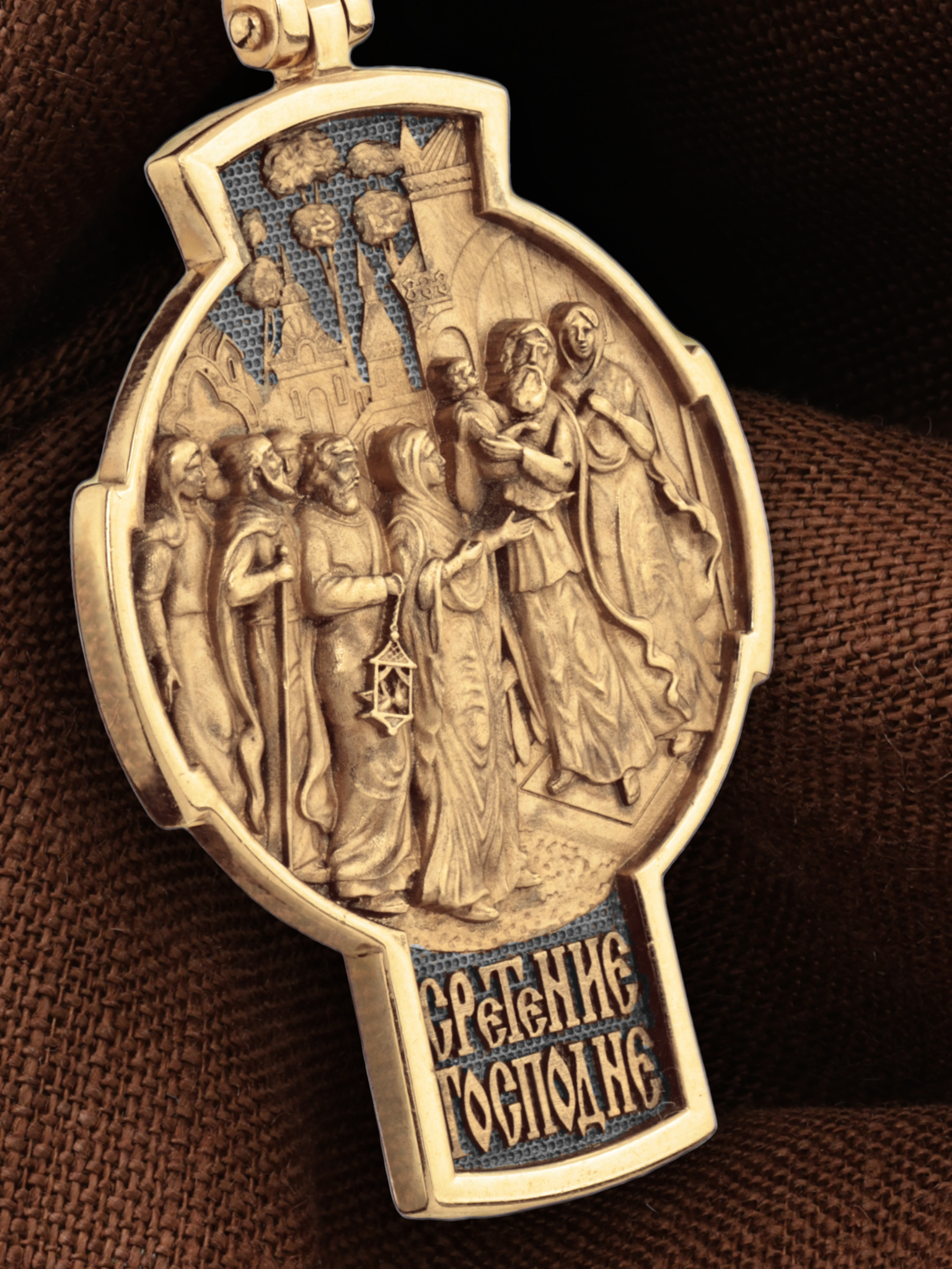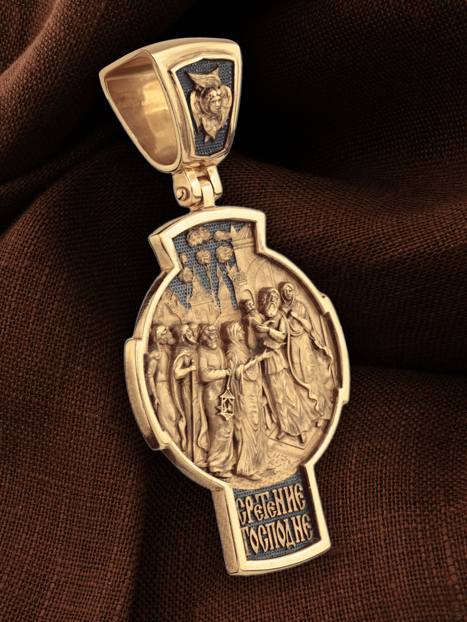 На оборотной стороне креста изображена икона Сретение Господне. В сороковой день по рождении Богомладенец был принесен в Иерусалимский храм. В это время жил в Иерусалиме праведный старец Симеон. Ему было откровение, что он не умрет, пока не увидит Христа Спасителя. По внушению свыше благочестивый старец пришел в храм в то время, когда Пресвятая Богородица и праведный Иосиф принесли туда Младенца Иисуса, чтобы исполнить законный обряд. Богоприимец Симеон взял Богомладенца на руки и, благословив Бога, изрек пророчество о Спасителе мира: «Ныне отпускаешь раба Твоего, Владыка, по слову Твоему, с миром, ибо видели очи мои спасение Твое, которое Ты уготовал пред лицем всех народов, свет к просвещению язычников и славу народа Твоего Израиля» (Лк. 2: 29–32). Пресвятой Деве праведный Симеон сказал: «Се, лежит Сей на падение и на восстание многих в Израиле и в предмет пререканий, и Тебе Самой оружие пройдет душу, да откроются помышления многих сердец». В храме была также 84-летняя вдовица Анна, пророчица, дочь Фануилова, которая постом и молитвой служила Богу в храме день и ночь. Она «славила Господа и говорила о Богомладенце всем, ожидавшим избавления в Иерусалиме». На кулонном кольце изображен шестикрылый Ангел — Серафим.