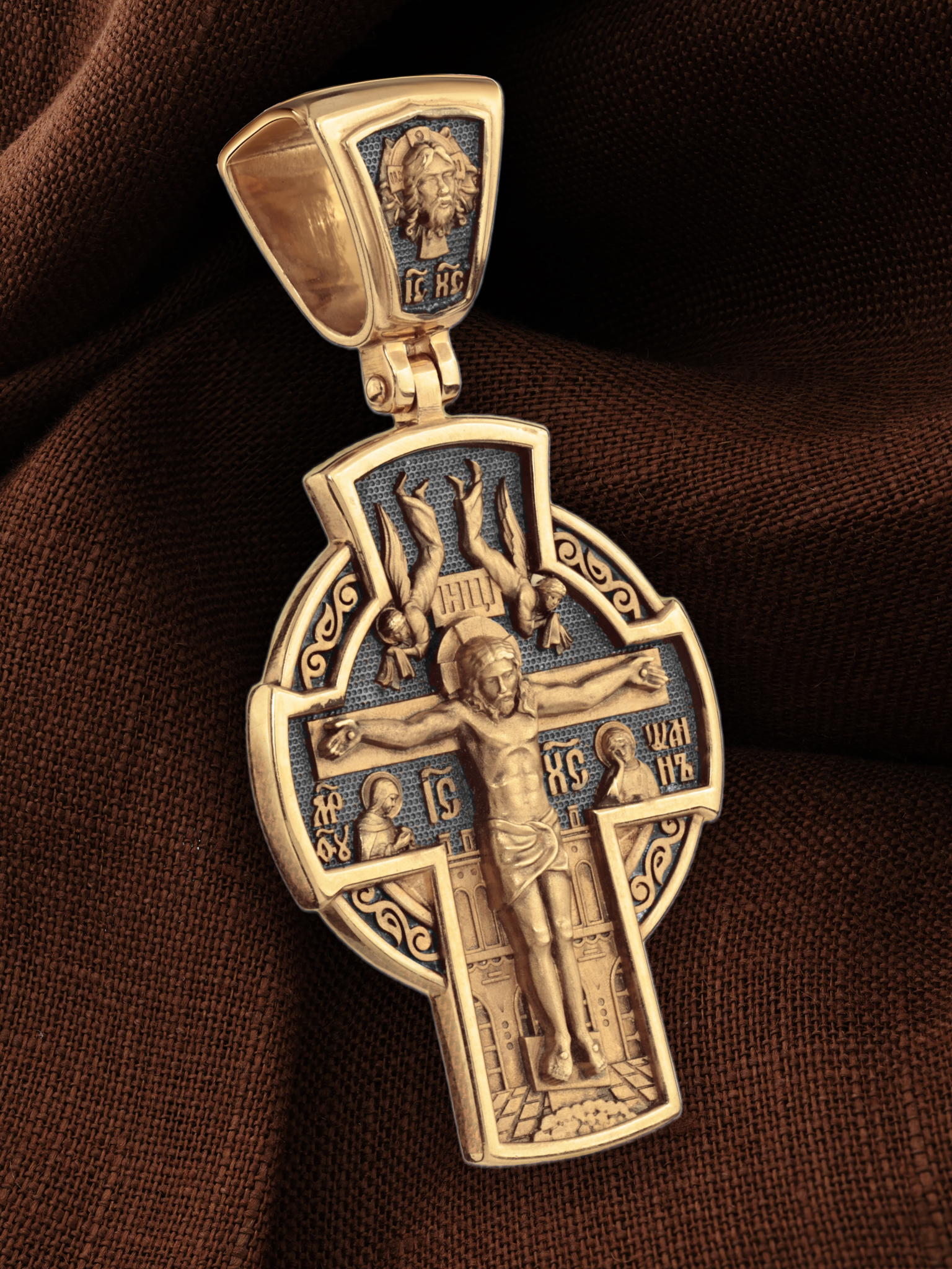 На лицевой стороне креста изображено Распятие Господа и Спасителя нашего Иисуса Христа, отдавшего Себя на смерть, для искупления грехов мира. Крест является символом жертвенной любви всеблагого Бога к падшим людям, всепобеждающим духовным оружием христиан, основанием и средоточием церковной жизни. Верхняя перекладина символизирует титло — табличку, на которой, согласно Евангелию, было начертано: Иисус Назорей Царь Иудейский (IНЦI). Надпись «IC» «ХC», означает Иисус Христос, помещается ниже поперечной перекладины креста. Слева от Распятия изображена Пресвятая Богородица, справа — апостол и евангелист Иоанн Богослов, один из ближайших учеников Иисуса Христа. За крестом высится Иерусалимская стена, в знак того, что Господь был распят вне стен города. Возвышение, на котором стоит Крест, символизирует гору Голгофу, на которой произошло Распятие. На кулонном кольце изображен Нерукотворный образ Господа и Спасителя нашего Иисуса Христа, чудесно отпечатавшийся на плате, которым Христос вытер свой лик.