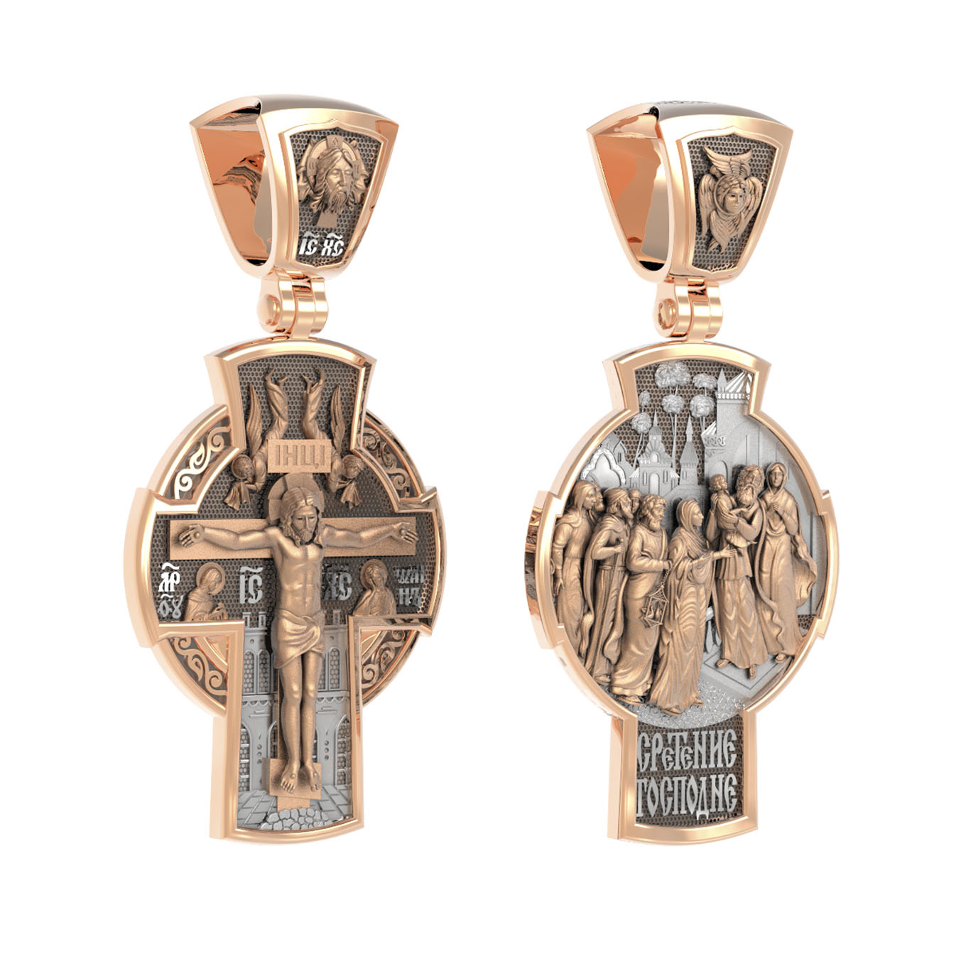На оборотной стороне креста изображена икона Сретение Господне. В сороковой день по рождении Богомладенец был принесен в Иерусалимский храм. В это время жил в Иерусалиме праведный старец Симеон. Ему было откровение, что он не умрет, пока не увидит Христа Спасителя. По внушению свыше благочестивый старец пришел в храм в то время, когда Пресвятая Богородица и праведный Иосиф принесли туда Младенца Иисуса, чтобы исполнить законный обряд. Богоприимец Симеон взял Богомладенца на руки и, благословив Бога, изрек пророчество о Спасителе мира: «Ныне отпускаешь раба Твоего, Владыка, по слову Твоему, с миром, ибо видели очи мои спасение Твое, которое Ты уготовал пред лицем всех народов, свет к просвещению язычников и славу народа Твоего Израиля» (Лк. 2: 29–32). Пресвятой Деве праведный Симеон сказал: «Се, лежит Сей на падение и на восстание многих в Израиле и в предмет пререканий, и Тебе Самой оружие пройдет душу, да откроются помышления многих сердец». В храме была также 84-летняя вдовица Анна, пророчица, дочь Фануилова, которая постом и молитвой служила Богу в храме день и ночь. Она «славила Господа и говорила о Богомладенце всем, ожидавшим избавления в Иерусалиме». На кулонном кольце изображен шестикрылый Ангел — Серафим.