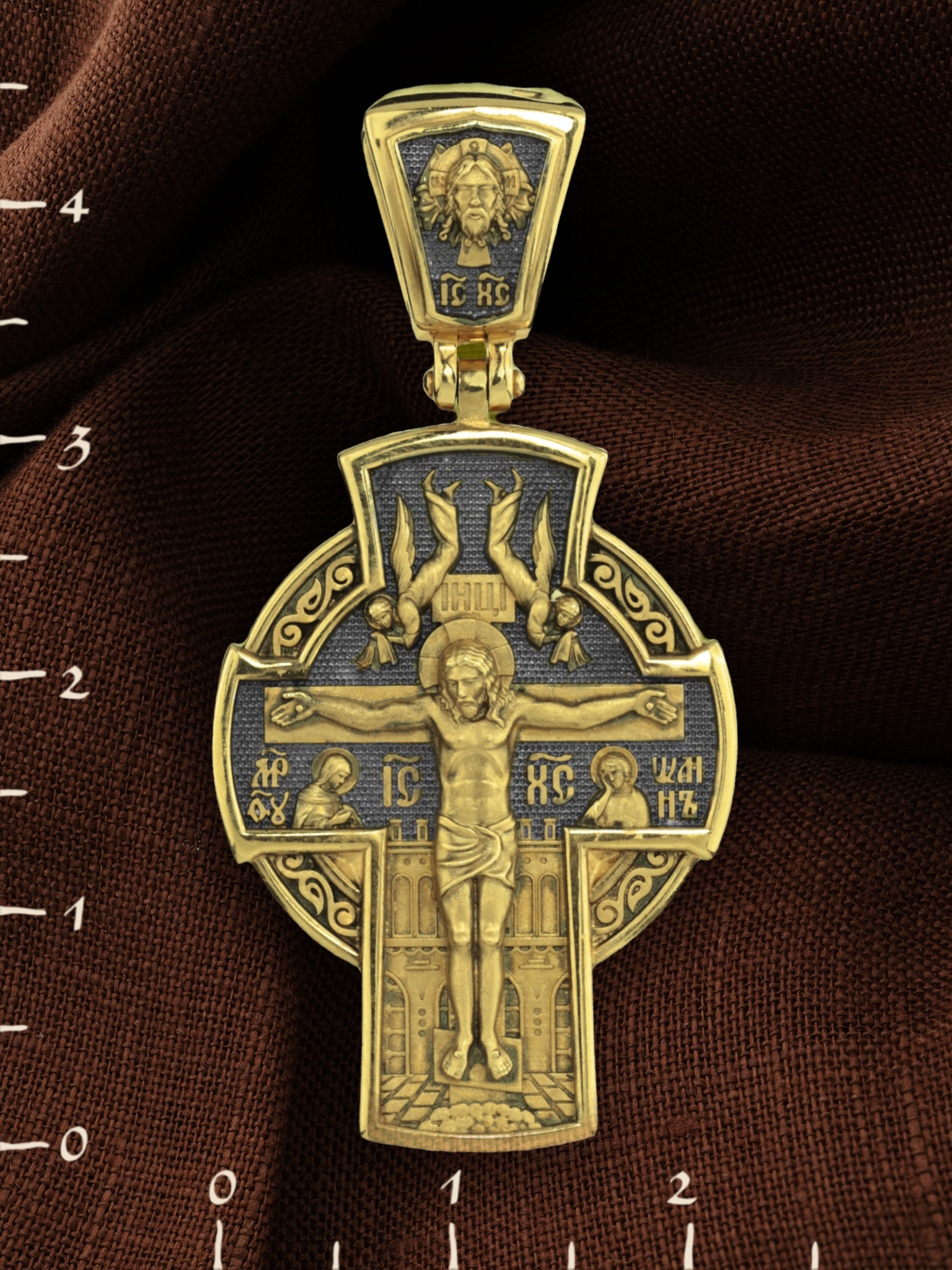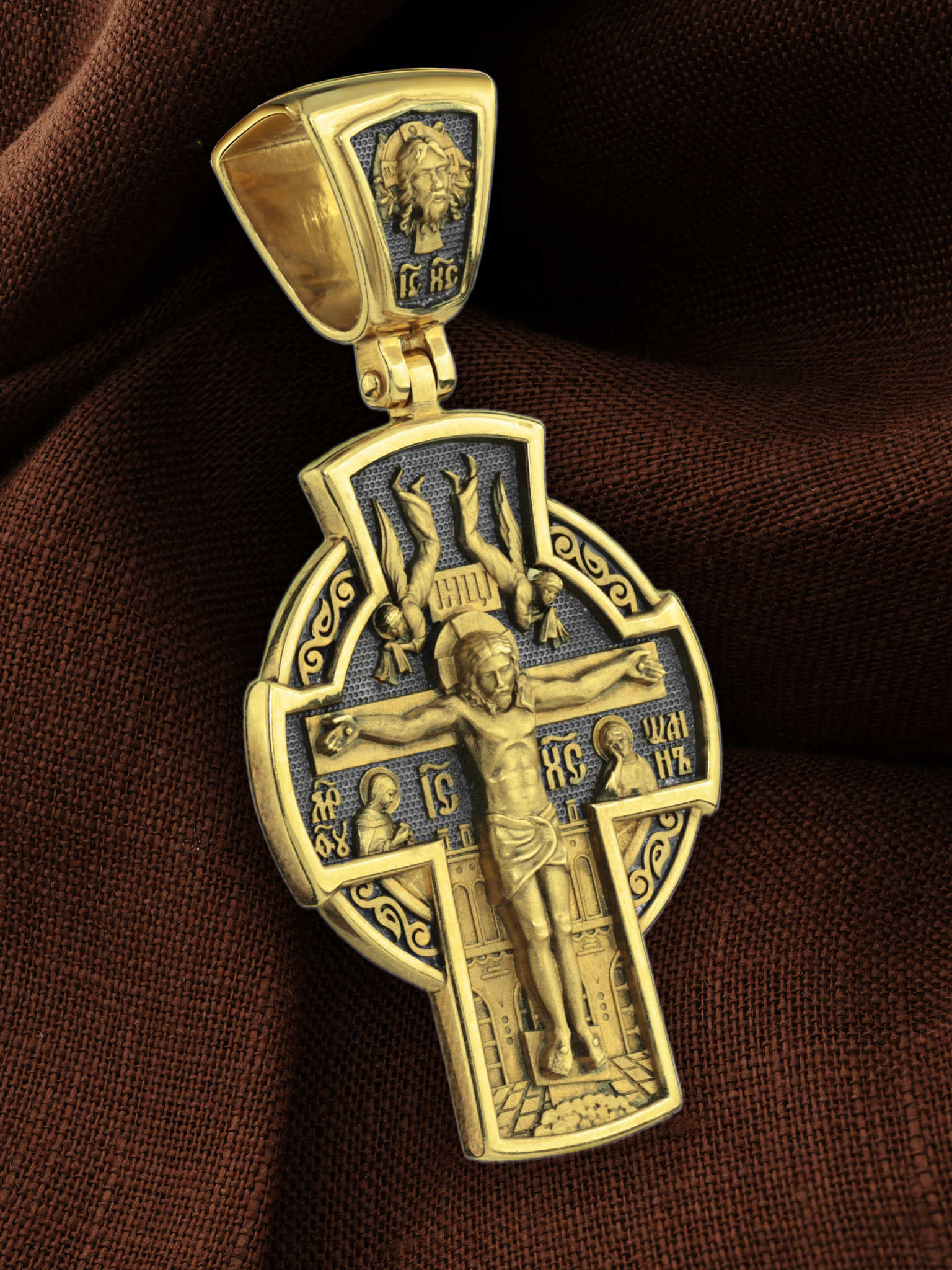 На лицевой стороне креста изображено Распятие Господа и Спасителя нашего Иисуса Христа, отдавшего Себя на смерть, для искупления грехов мира. Крест является символом жертвенной любви всеблагого Бога к падшим людям, всепобеждающим духовным оружием христиан, основанием и средоточием церковной жизни. Верхняя перекладина символизирует титло — табличку, на которой, согласно Евангелию, было начертано: Иисус Назорей Царь Иудейский (IНЦI). Надпись «IC» «ХC», означает Иисус Христос, помещается ниже поперечной перекладины креста. Слева от Распятия изображена Пресвятая Богородица, справа — апостол и евангелист Иоанн Богослов, один из ближайших учеников Иисуса Христа. За крестом высится Иерусалимская стена, в знак того, что Господь был распят вне стен города. Возвышение, на котором стоит Крест, символизирует гору Голгофу, на которой произошло Распятие. На кулонном кольце изображен Нерукотворный образ Господа и Спасителя нашего Иисуса Христа, чудесно отпечатавшийся на плате, которым Христос вытер свой лик.