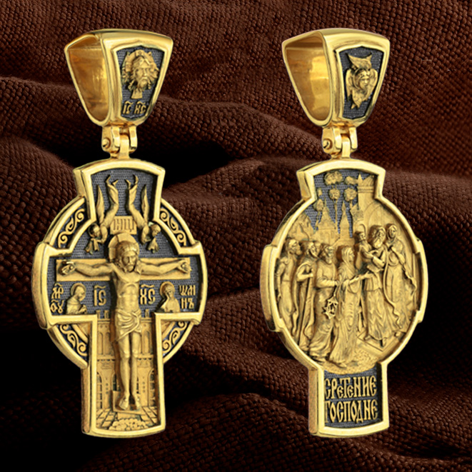 На оборотной стороне креста изображена икона Сретение Господне. В сороковой день по рождении Богомладенец был принесен в Иерусалимский храм. В это время жил в Иерусалиме праведный старец Симеон. Ему было откровение, что он не умрет, пока не увидит Христа Спасителя. По внушению свыше благочестивый старец пришел в храм в то время, когда Пресвятая Богородица и праведный Иосиф принесли туда Младенца Иисуса, чтобы исполнить законный обряд. Богоприимец Симеон взял Богомладенца на руки и, благословив Бога, изрек пророчество о Спасителе мира: «Ныне отпускаешь раба Твоего, Владыка, по слову Твоему, с миром, ибо видели очи мои спасение Твое, которое Ты уготовал пред лицем всех народов, свет к просвещению язычников и славу народа Твоего Израиля» (Лк. 2: 29–32). Пресвятой Деве праведный Симеон сказал: «Се, лежит Сей на падение и на восстание многих в Израиле и в предмет пререканий, и Тебе Самой оружие пройдет душу, да откроются помышления многих сердец». В храме была также 84-летняя вдовица Анна, пророчица, дочь Фануилова, которая постом и молитвой служила Богу в храме день и ночь. Она «славила Господа и говорила о Богомладенце всем, ожидавшим избавления в Иерусалиме». На кулонном кольце изображен шестикрылый Ангел — Серафим.