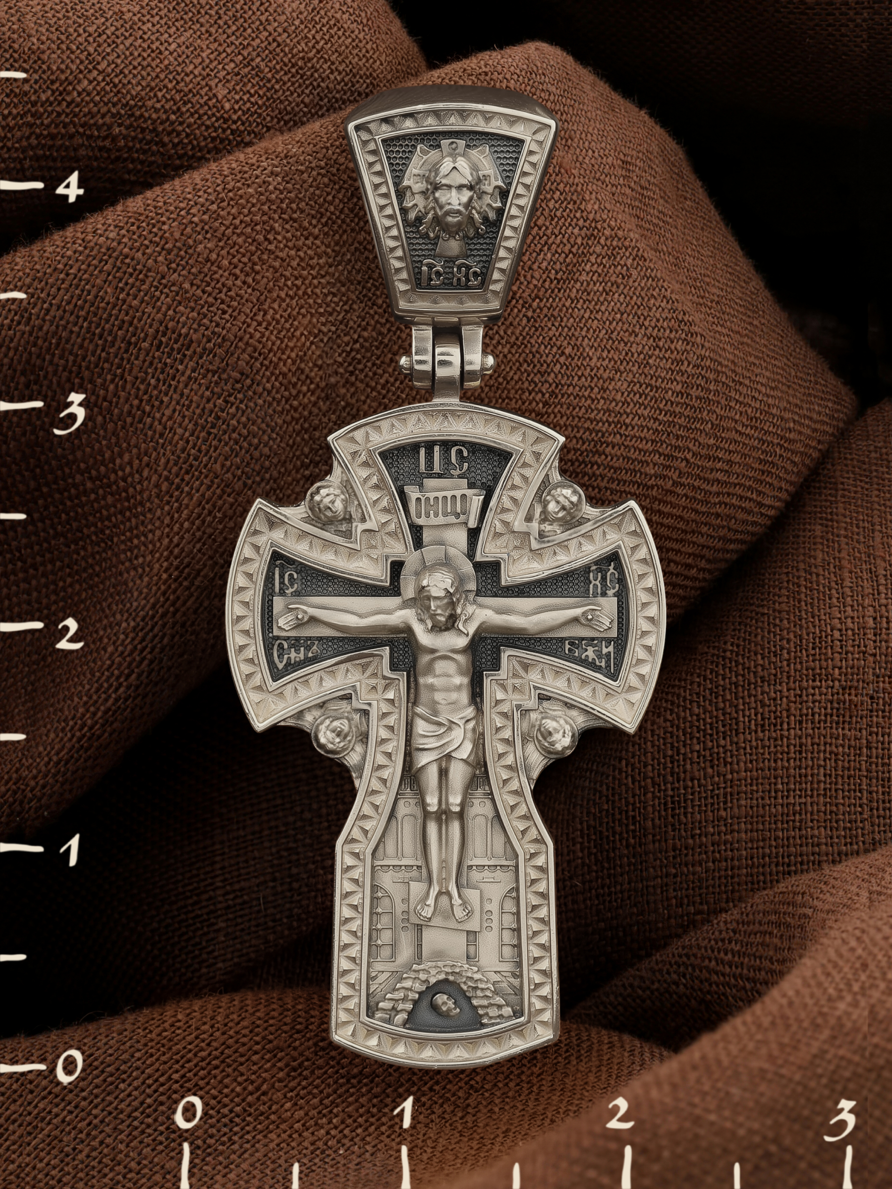 На лицевой стороне креста изображено Распятие Господа и Спасителя нашего Иисуса Христа, отдавшего Себя на смерть, для искупления грехов мира. Крест является символом жертвенной любви Всеблагого Бога к падшим людям, всепобеждающим духовным оружием христиан, основанием и средоточием церковной жизни. Господь сказал: кто хочет идти за Мною, отвергнись себя, и возьми крест свой, и следуй за Мною. (Мк. 8: 34). Над Распятием помещена надпись «Царь Славы». На верхней табличке, выше головы Иисуса, расположена надпись, составленная Понтием Пилатом — «IНЦI». Она означает «Иисус Назорей, Царь Иудейский». Надпись «IC» «ХC», означает Иисус Христос, помещается на разных сторонах поперечной перекладины креста. Рядом расположена надпись «Сын Божий». За крестом высится Иерусалимская стена, в знак того, что Господь был распят вне стен города. Возвышение, на котором стоит Крест, символизирует гору Голгофу, на которой произошло Распятие. Под подножием Креста изображена покоящаяся голова (череп) Адама. На кулонном кольце изображен Нерукотворный образ Господа и Спасителя нашего Иисуса Христа, чудесно отпечатавшийся на плате, которым Христос вытер свой лик.