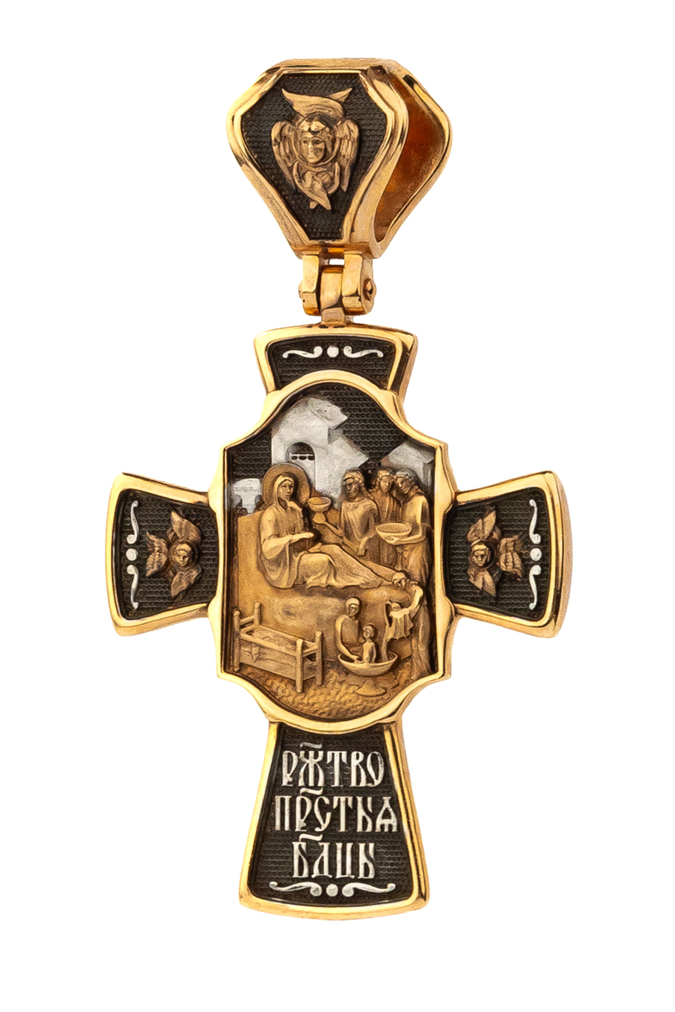 На оборотной стороне креста изображена икона Рождество Пресвятой Богородицы. Согласно церковному Преданию, Пресвятая Дева Мария родилась в небольшом галилейском городе Назарете. Родителями Её были праведные Иоаким и Анна. Супруги были бездетны, но не теряли надежды, что Господь может разрешить неплодство Анны даже в её преклонном возрасте. Они горячо молились и просили Господа даровать им дитя, которое обещали посвятить Богу для служения в храме. И Господь услышал их молитвы: Праведная Анна зачала и разрешилась дочерью Марией — будущей Пресвятой Богородицей. На кулонном кольце изображен шестикрылый Ангел — Серафим.