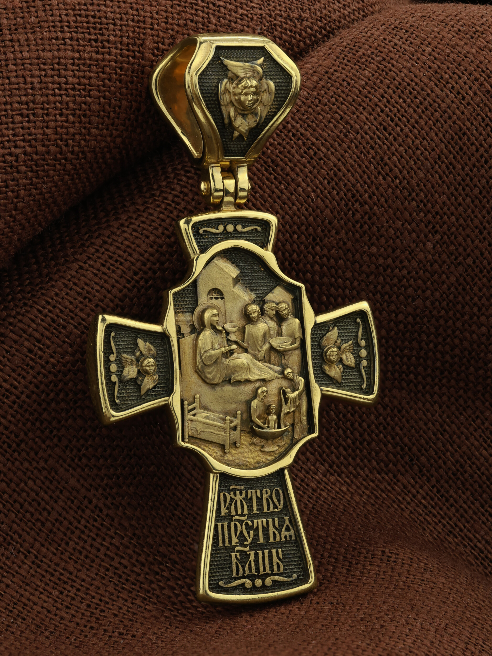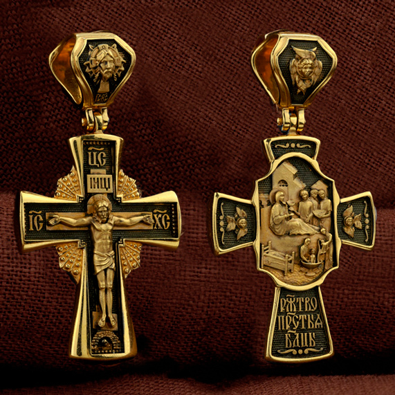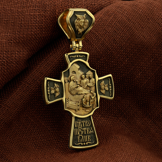 На оборотной стороне креста изображена икона Рождество Пресвятой Богородицы. Согласно церковному Преданию, Пресвятая Дева Мария родилась в небольшом галилейском городе Назарете. Родителями Её были праведные Иоаким и Анна. Супруги были бездетны, но не теряли надежды, что Господь может разрешить неплодство Анны даже в её преклонном возрасте. Они горячо молились и просили Господа даровать им дитя, которое обещали посвятить Богу для служения в храме. И Господь услышал их молитвы: Праведная Анна зачала и разрешилась дочерью Марией — будущей Пресвятой Богородицей. На кулонном кольце изображен шестикрылый Ангел — Серафим.