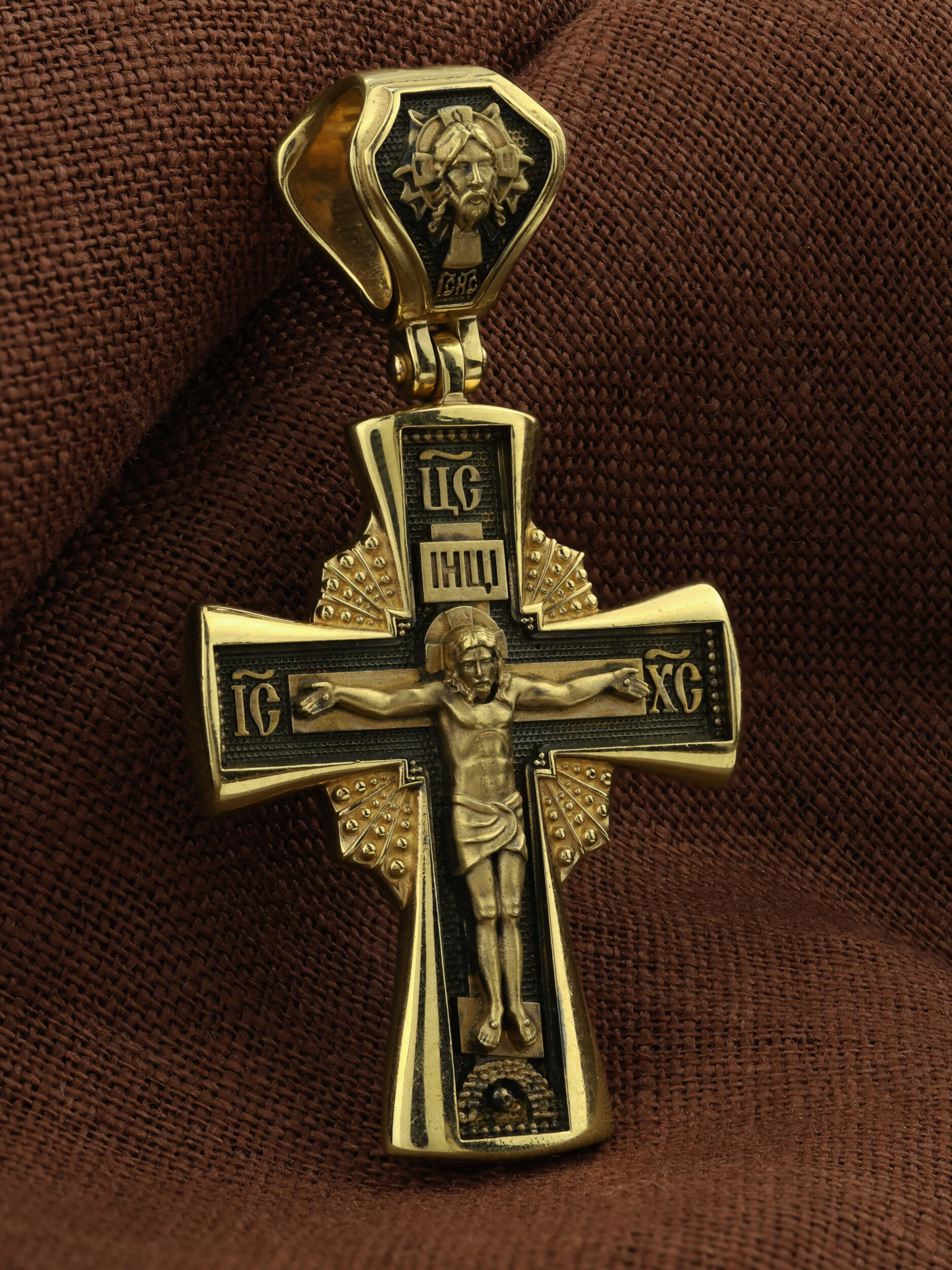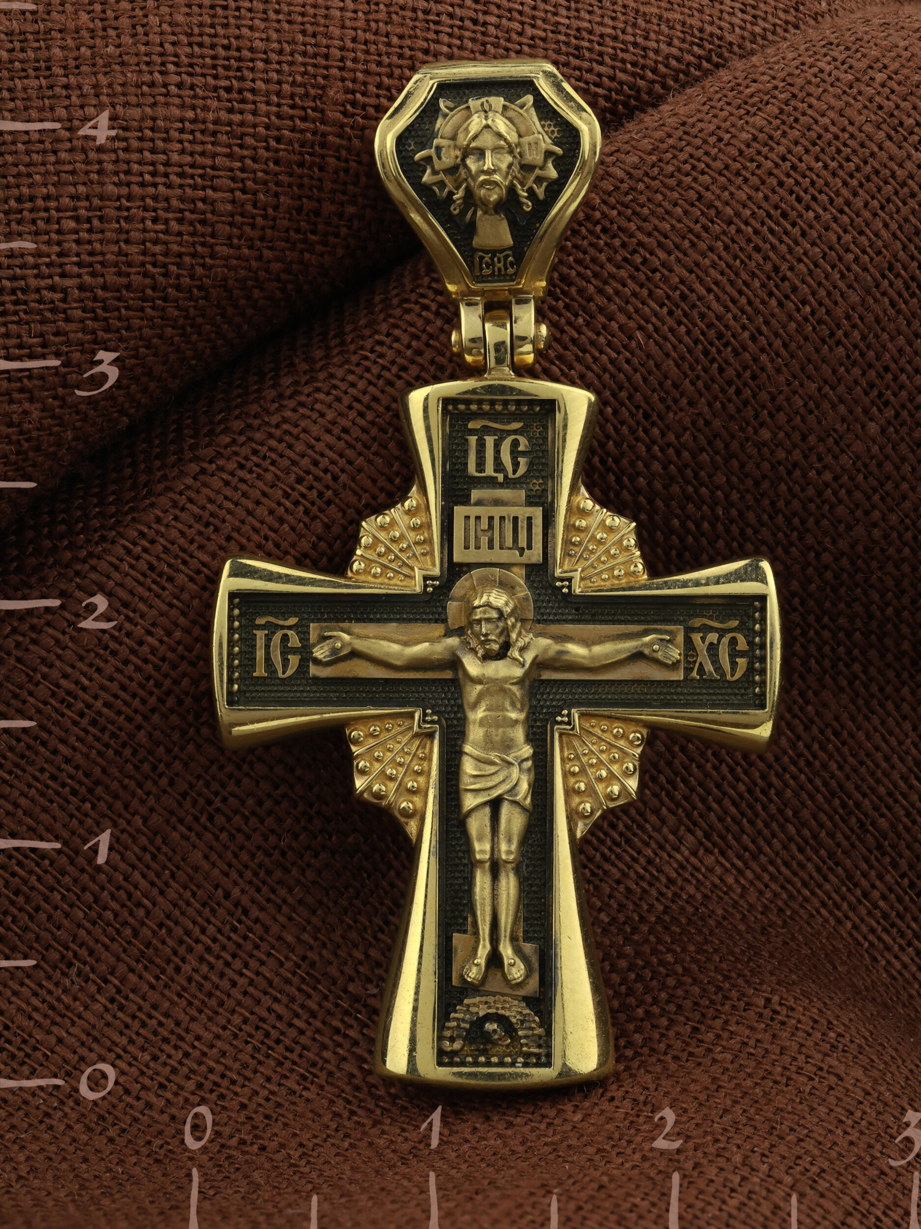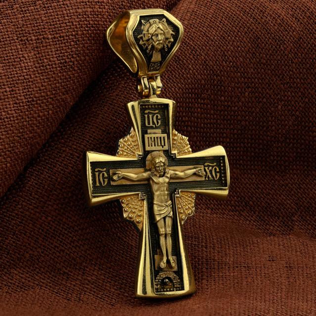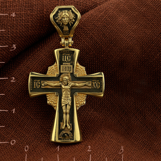 На лицевой стороне креста изображено Распятие Господа и Спасителя нашего Иисуса Христа, отдавшего Себя на смерть, для искупления грехов мира. Крест является символом жертвенной любви Всеблагого Бога к падшим людям, всепобеждающим духовным оружием христиан, основанием и средоточием церковной жизни. Господь сказал: кто хочет идти за Мною, отвергнись себя, и возьми крест свой, и следуй за Мною. (Мк. 8: 34). Над Распятием помещена надпись «Царь Славы». На верхней табличке, выше головы Иисуса, расположена надпись, составленная Понтием Пилатом — «IНЦI». Она означает «Иисус Назорей, Царь Иудейский». Надпись «IC» «ХC», означает Иисус Христос, помещается на разных сторонах поперечной перекладины креста. Возвышение, на котором стоит Крест, символизирует гору Голгофу, на которой произошло Распятие. Под подножием Креста изображена покоящаяся голова (череп) Адама. На кулонном кольце изображен Нерукотворный образ Господа и Спасителя нашего Иисуса Христа, чудесно отпечатавшийся на плате, которым Христос вытер свой лик. Ниже надпись — «IC» «ХC».