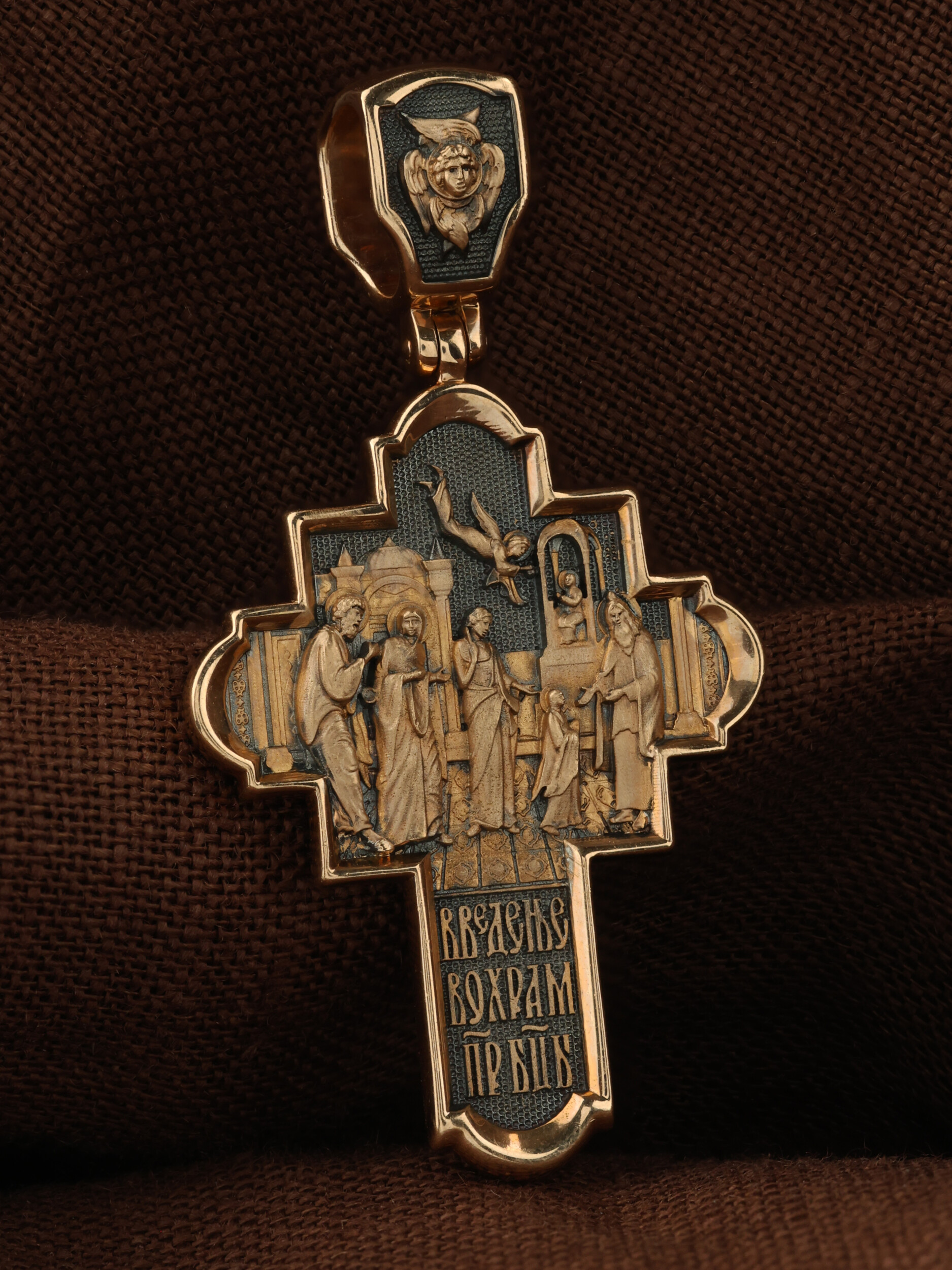 На оборотной стороне креста изображена икона Введение во Храм Пресвятой Богородицы. По сохраненным Преданием рассказам, родители Девы Марии, праведные Иоаким и Анна, молясь о разрешении неплодства, дали обет, если родится дитя, посвятить его на служение Богу. Когда Пресвятой Деве исполнилось три года, святые родители решили выполнить свое обещание. Собрав родственников и знакомых, одев Пречистую Марию в лучшие одежды, с пением священных песней, с зажженными свечами в руках привели ее в Иерусалимский храм. Там встретил отроковицу первосвященник со множеством священников. В храм вела лестница в пятнадцать высоких ступеней. Младенец Мария, казалось, не могла бы Сама взойти по этой лестнице. Но как только Ее поставили на первую ступень, укрепляемая силой Божией, Она быстро преодолела остальные ступени и взошла на верхнюю. Затем первосвященник, по внушению свыше, ввел Пресвятую Деву в Святое святых, куда из всех людей только раз в году входил первосвященник с очистительной жертвенной кровью. Все присутствовавшие в храме дивились необыкновенному событию. На кулонном кольце изображен шестикрылый Ангел — Серафим.