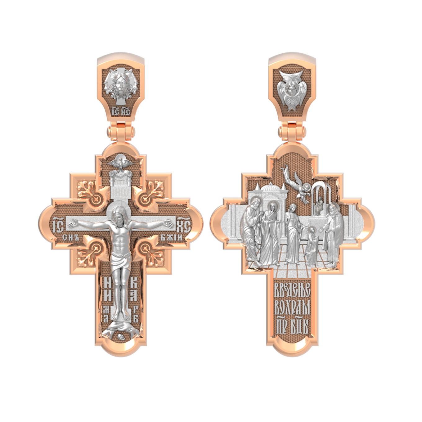 На оборотной стороне креста изображена икона Введение во Храм Пресвятой Богородицы. По сохраненным Преданием рассказам, родители Девы Марии, праведные Иоаким и Анна, молясь о разрешении неплодства, дали обет, если родится дитя, посвятить его на служение Богу. Когда Пресвятой Деве исполнилось три года, святые родители решили выполнить свое обещание. Собрав родственников и знакомых, одев Пречистую Марию в лучшие одежды, с пением священных песней, с зажженными свечами в руках привели ее в Иерусалимский храм. Там встретил отроковицу первосвященник со множеством священников. В храм вела лестница в пятнадцать высоких ступеней. Младенец Мария, казалось, не могла бы Сама взойти по этой лестнице. Но как только Ее поставили на первую ступень, укрепляемая силой Божией, Она быстро преодолела остальные ступени и взошла на верхнюю. Затем первосвященник, по внушению свыше, ввел Пресвятую Деву в Святое святых, куда из всех людей только раз в году входил первосвященник с очистительной жертвенной кровью. Все присутствовавшие в храме дивились необыкновенному событию. На кулонном кольце изображен шестикрылый Ангел — Серафим.