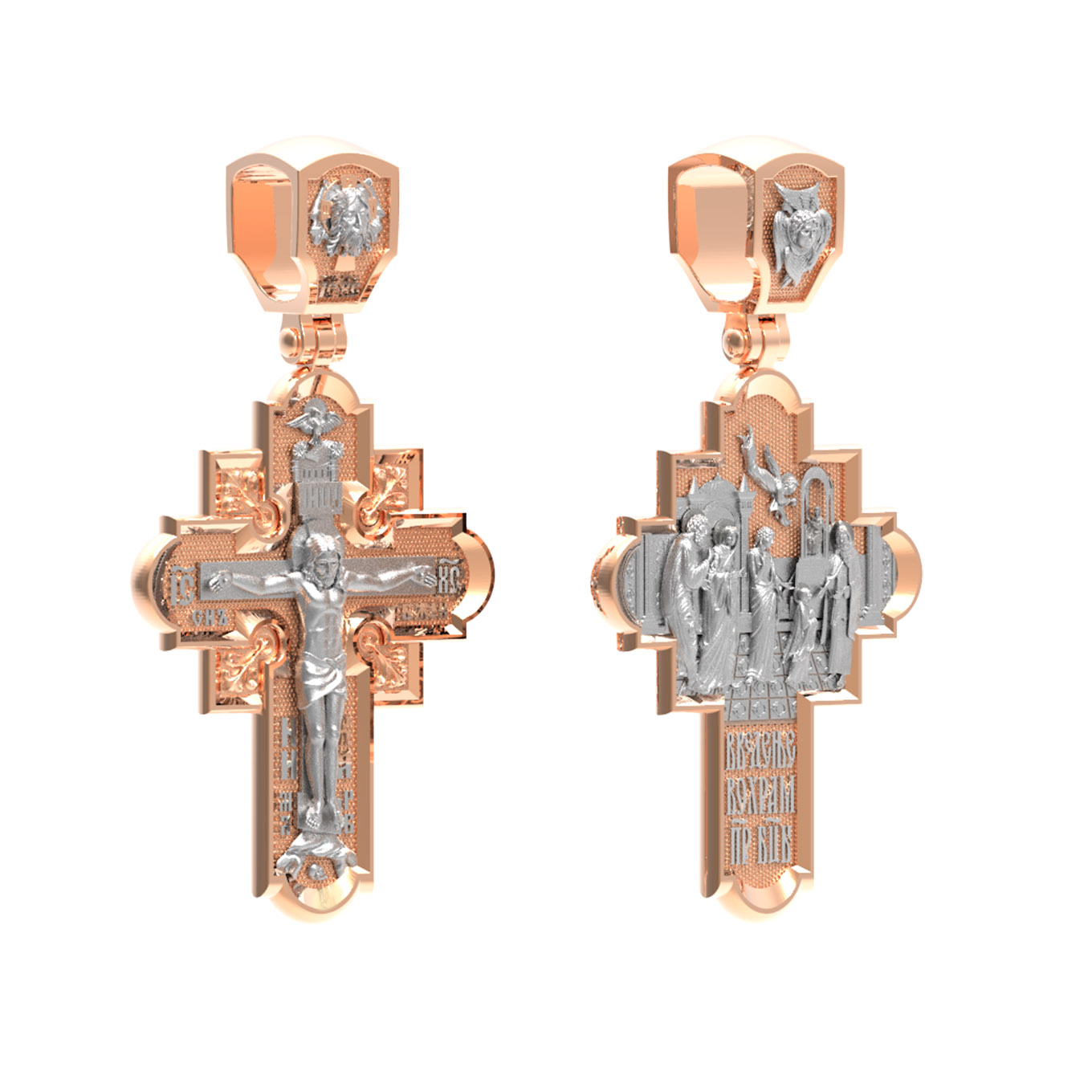 На лицевой стороне креста изображено Распятие Господа и Спасителя нашего Иисуса Христа. Крест- символ спасения и искупления рода человеческого, знамение победы над смертью и адом. Иисус Христос, как искупительная жертва освобождения человечества от власти греха, умер крестной смертью и в третий день воскрес. Верхняя перекладина символизирует титло — табличку, на которой, согласно Евангелию, было начертано: Иисус Назорей Царь Иудейский (IНЦI). Надпись «IC» «ХC», означает Иисус Христос, помещается на разных сторонах поперечной перекладины креста. Ниже перекладины расположено словосочетание «СЫН БОЖИЙ», что означает божественную природу Иисуса Христа. Надпись «МЛРБ» — «место лобное рай бысть» означает, что место лобное стало раем и помещаются в нижней части креста. Рядом — слово «НИКА», что означает «победитель». Возвышение, на котором стоит Крест, символизирует гору Голгофу, на которой произошло Распятие. Под подножием Креста изображена покоящаяся голова (череп) Адама. На кулонном кольце изображен Нерукотворный образ Господа и Спасителя нашего Иисуса Христа, чудесно отпечатавшийся на плате, которым Христос вытер свой лик. Ниже надпись — «IC» «ХC».