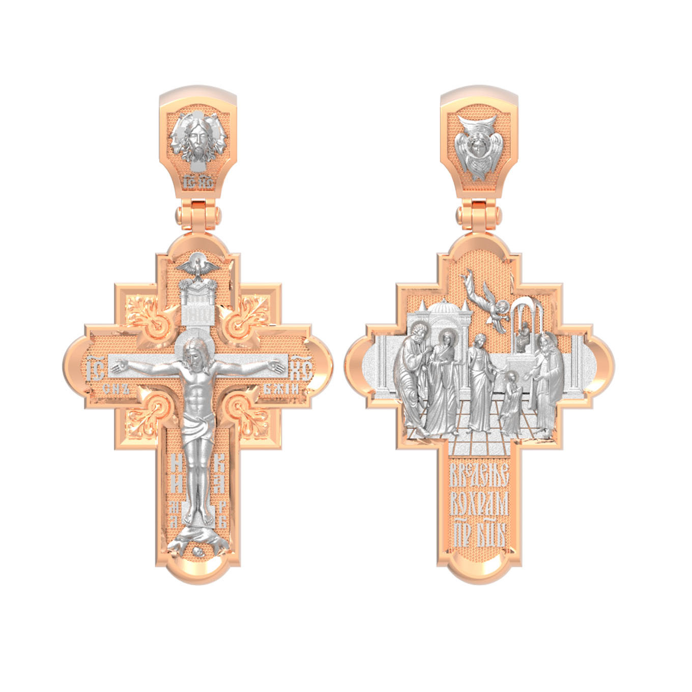 На оборотной стороне креста изображена икона Введение во Храм Пресвятой Богородицы. По сохраненным Преданием рассказам, родители Девы Марии, праведные Иоаким и Анна, молясь о разрешении неплодства, дали обет, если родится дитя, посвятить его на служение Богу. Когда Пресвятой Деве исполнилось три года, святые родители решили выполнить свое обещание. Собрав родственников и знакомых, одев Пречистую Марию в лучшие одежды, с пением священных песней, с зажженными свечами в руках привели ее в Иерусалимский храм. Там встретил отроковицу первосвященник со множеством священников. В храм вела лестница в пятнадцать высоких ступеней. Младенец Мария, казалось, не могла бы Сама взойти по этой лестнице. Но как только Ее поставили на первую ступень, укрепляемая силой Божией, Она быстро преодолела остальные ступени и взошла на верхнюю. Затем первосвященник, по внушению свыше, ввел Пресвятую Деву в Святое святых, куда из всех людей только раз в году входил первосвященник с очистительной жертвенной кровью. Все присутствовавшие в храме дивились необыкновенному событию. На кулонном кольце изображен шестикрылый Ангел — Серафим.