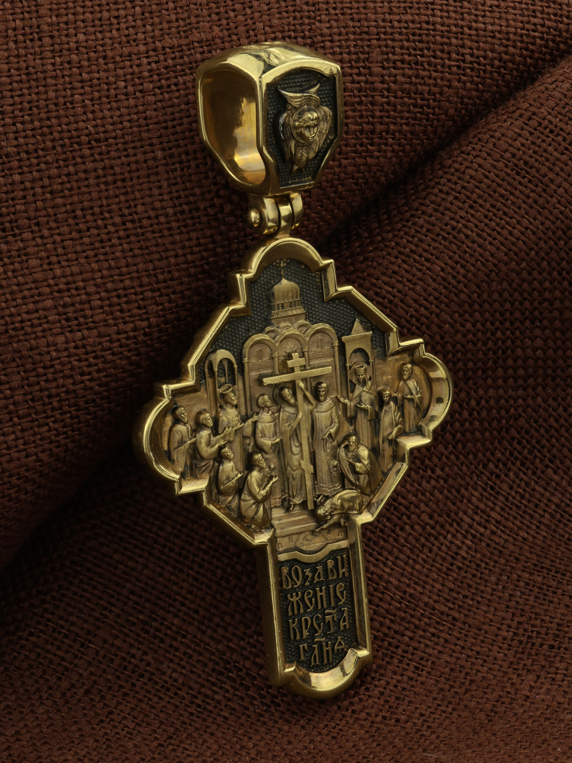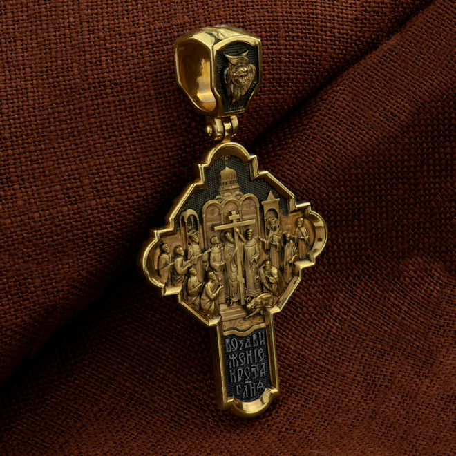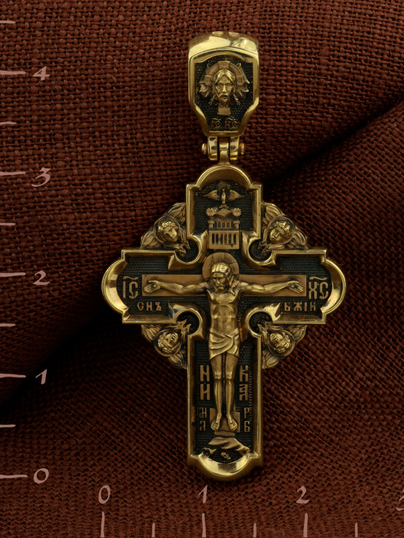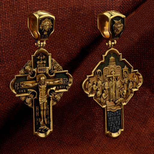 На оборотной стороне креста изображена икона Воздвижение Честного и Животворящего Креста Господня. Равноапостольный царь Константин пожелал построить храмы Божии на священных для христиан местах в Палестине и найти Крест, на котором был распят Спаситель. Исполнить желание царя взялась, с великою радостью, его мать, св. равноапостольная царица Елена. Крест был обретен в 326 году около горы Голгофы в Иерусалиме. C VII века с этим днём стали соединять память о возвращении Животворящего Креста из Персии византийским императором Ираклием (629). Праздник называется Воздвижением Креста, потому что и при обретении, и при возвращении Креста патриарх Макарий поднимал (Воздвигал) крест три раза, чтобы все могли его видеть. Народ же, видя Крест Спасителя, кланялся и восклицал: «Господи, помилуй!». Св. равноапостольные цари Константин и Елена, над местом страданий, погребения и воскресения Иисуса Христа построили обширный и великолепный храм в честь Воскресения Христова. На кулонном кольце изображен шестикрылый Ангел — Серафим.