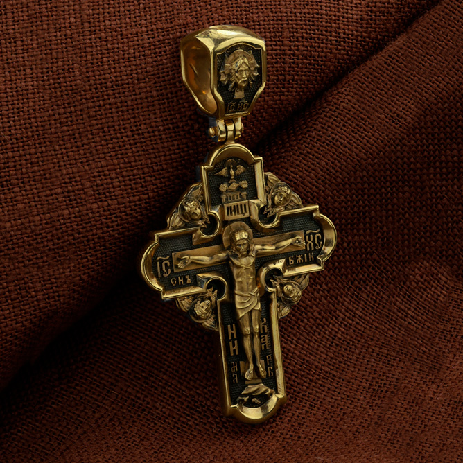 На лицевой стороне креста изображено Распятие Господа и Спасителя нашего Иисуса Христа. Крест- символ спасения и искупления рода человеческого, знамение победы над смертью и адом. Иисус Христос, как искупительная жертва освобождения человечества от власти греха, умер крестной смертью и в третий день воскрес. Верхняя перекладина символизирует титло — табличку, на которой, согласно Евангелию, было начертано: Иисус Назорей Царь Иудейский (IНЦI). Надпись «IC» «ХC», означает Иисус Христос, помещается на разных сторонах поперечной перекладины креста. Ниже перекладины расположено словосочетание «СЫН БОЖИЙ», что означает божественную природу Иисуса Христа. Надпись «МЛРБ» — «место лобное рай бысть» означает, что место лобное стало раем и помещаются в нижней части креста. Рядом — слово «НИКА», что означает «победитель». Возвышение, на котором стоит Крест, символизирует гору Голгофу, на которой произошло Распятие. Под подножием Креста изображена покоящаяся голова (череп) Адама. На кулонном кольце изображен Нерукотворный образ Господа и Спасителя нашего Иисуса Христа, чудесно отпечатавшийся на плате, которым Христос вытер свой лик. Ниже надпись — «IC» «ХC».