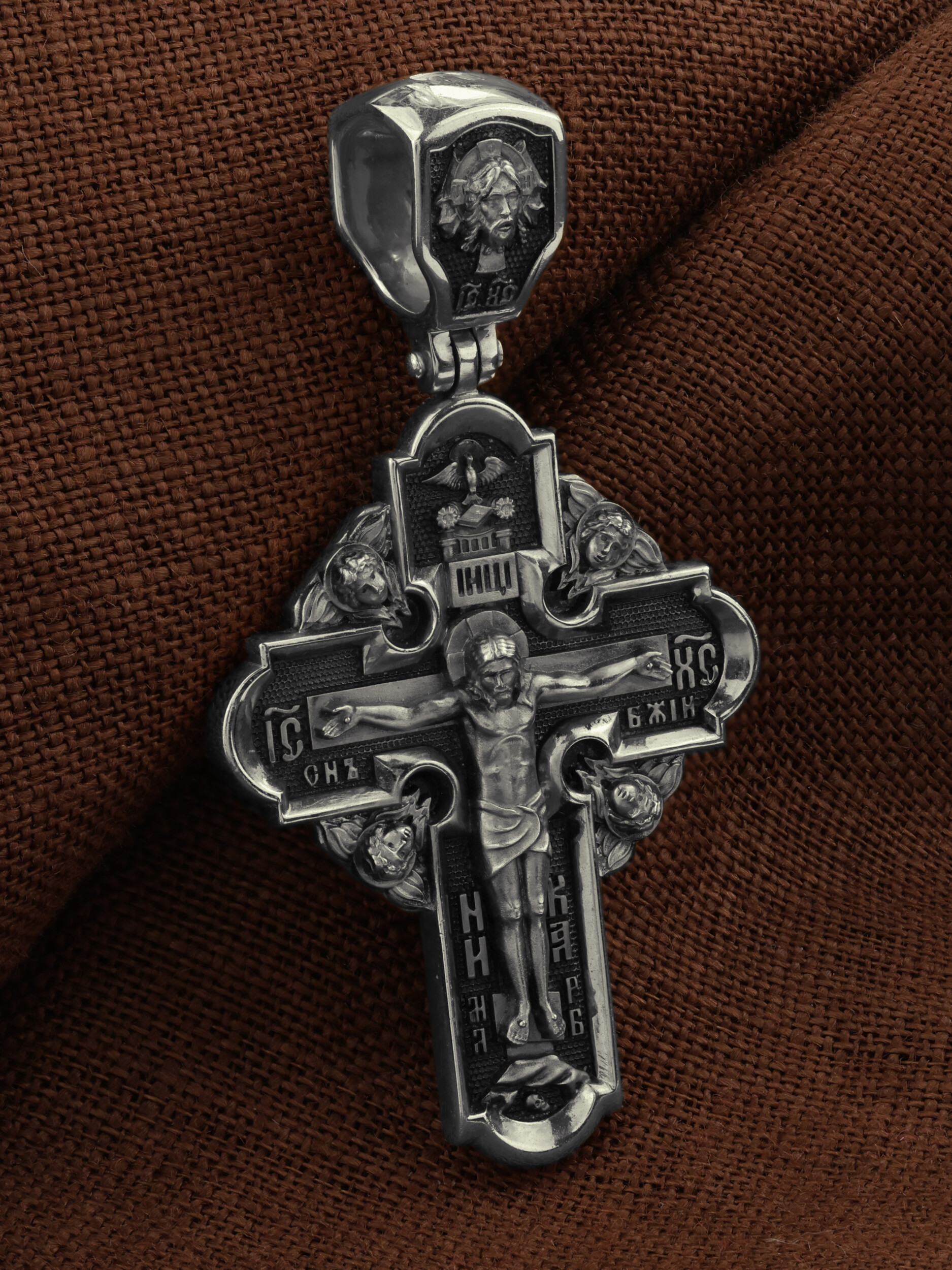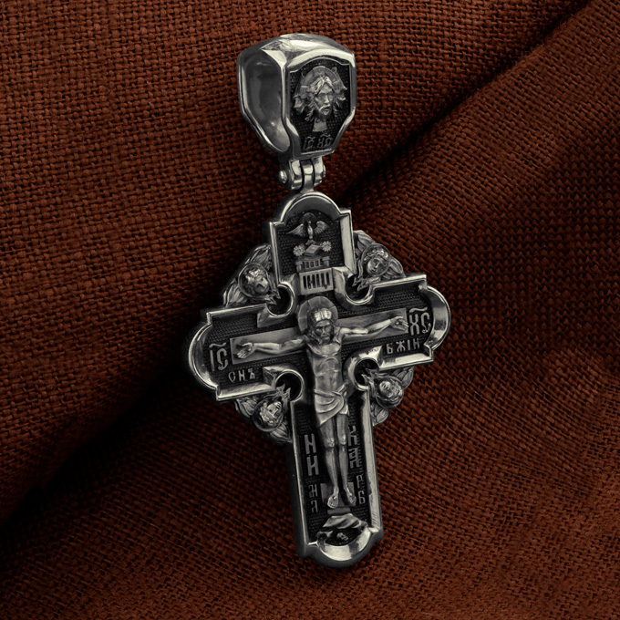 На лицевой стороне креста изображено Распятие Господа и Спасителя нашего Иисуса Христа. Крест- символ спасения и искупления рода человеческого, знамение победы над смертью и адом. Иисус Христос, как искупительная жертва освобождения человечества от власти греха, умер крестной смертью и в третий день воскрес. Верхняя перекладина символизирует титло — табличку, на которой, согласно Евангелию, было начертано: Иисус Назорей Царь Иудейский (IНЦI). Надпись «IC» «ХC», означает Иисус Христос, помещается на разных сторонах поперечной перекладины креста. Ниже перекладины расположено словосочетание «СЫН БОЖИЙ», что означает божественную природу Иисуса Христа. Надпись «МЛРБ» — «место лобное рай бысть» означает, что место лобное стало раем и помещаются в нижней части креста. Рядом — слово «НИКА», что означает «победитель». Возвышение, на котором стоит Крест, символизирует гору Голгофу, на которой произошло Распятие. Под подножием Креста изображена покоящаяся голова (череп) Адама. На кулонном кольце изображен Нерукотворный образ Господа и Спасителя нашего Иисуса Христа, чудесно отпечатавшийся на плате, которым Христос вытер свой лик. Ниже надпись — «IC» «ХC».
