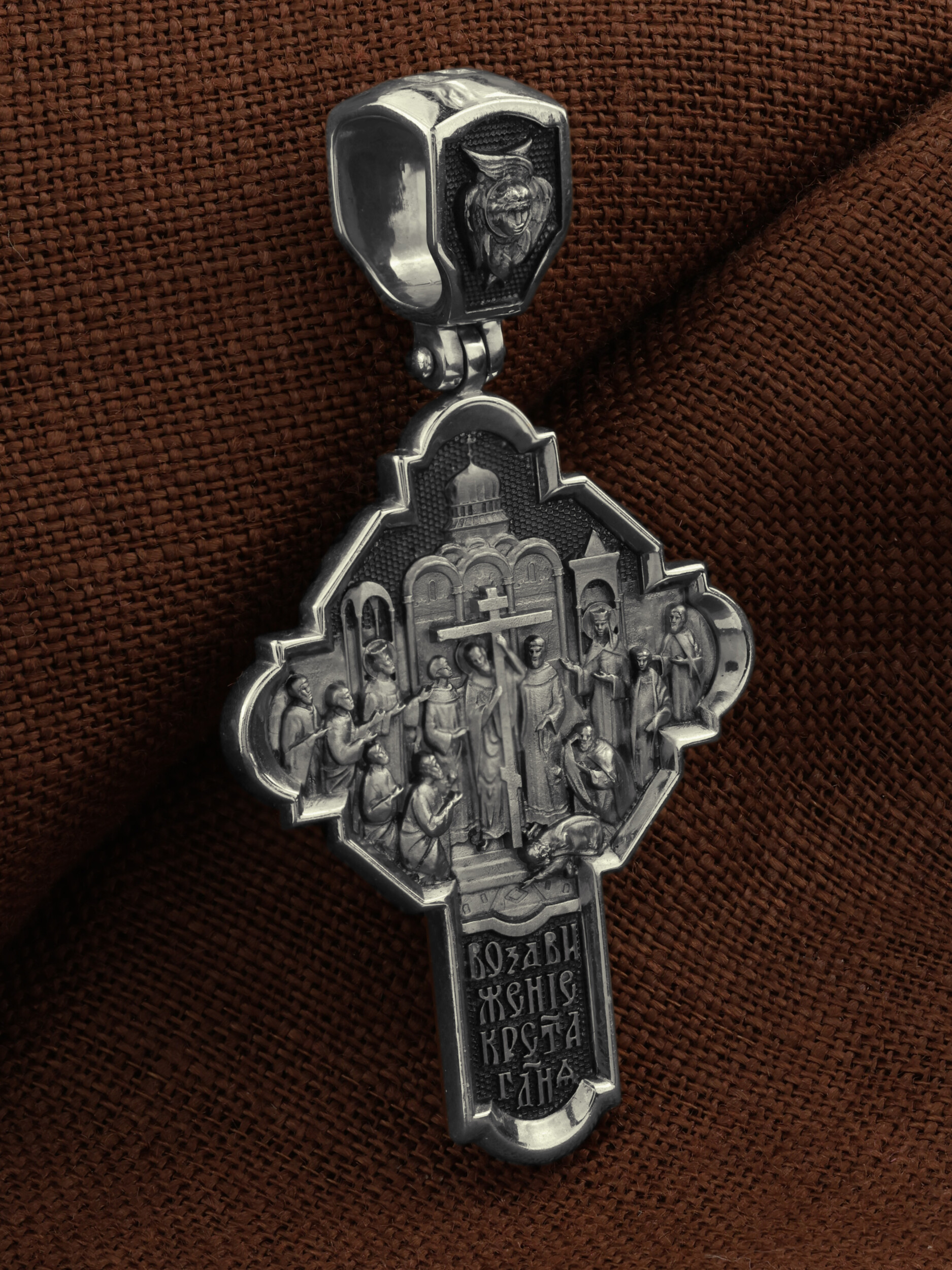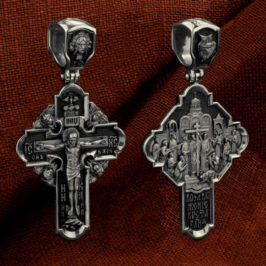На оборотной стороне креста изображена икона Воздвижение Честного и Животворящего Креста Господня. Равноапостольный царь Константин пожелал построить храмы Божии на священных для христиан местах в Палестине и найти Крест, на котором был распят Спаситель. Исполнить желание царя взялась, с великою радостью, его мать, св. равноапостольная царица Елена. Крест был обретен в 326 году около горы Голгофы в Иерусалиме. C VII века с этим днём стали соединять память о возвращении Животворящего Креста из Персии византийским императором Ираклием (629). Праздник называется Воздвижением Креста, потому что и при обретении, и при возвращении Креста патриарх Макарий поднимал (Воздвигал) крест три раза, чтобы все могли его видеть. Народ же, видя Крест Спасителя, кланялся и восклицал: «Господи, помилуй!». Св. равноапостольные цари Константин и Елена, над местом страданий, погребения и воскресения Иисуса Христа построили обширный и великолепный храм в честь Воскресения Христова. На кулонном кольце изображен шестикрылый Ангел — Серафим.