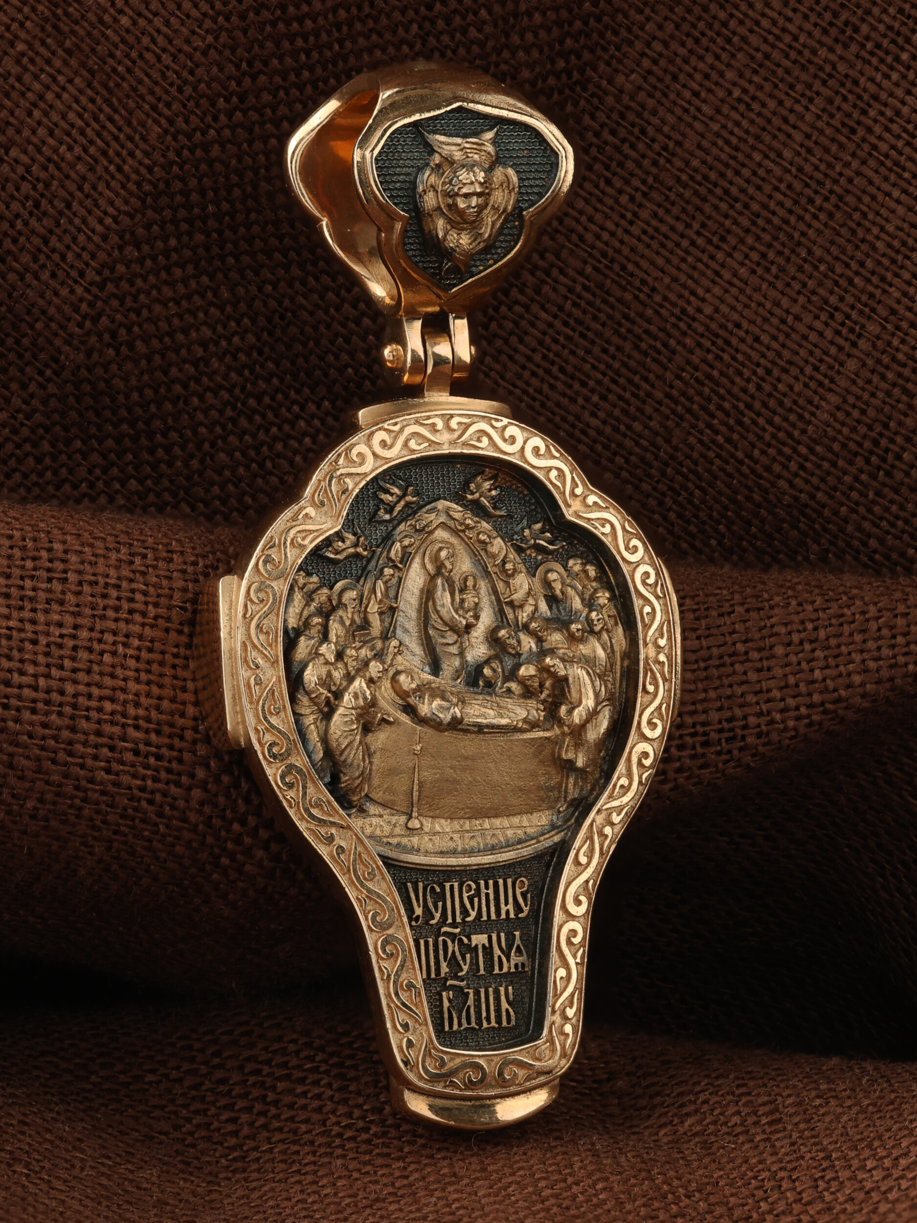 На оборотной стороне креста изображена икона Успения Пресвятой Богородицы. Все годы после Распятия, Воскресения и Вознесения Иисуса Христа Пресвятая Дева провела большей частью в Иерусалиме, проповедуя Господа наравне с апостолами. Но вот настало время Ее земной кончины. Архангел Гавриил возвестил Ей, что через три дня душа Ее оставит тело. Но Богородица очень обрадовалась. Ведь Ее ожидала встреча с Тем, Кого Она любила гораздо больше, чем жизнь. Три дня спустя в доме апостола Иоанна, где жила Мария, собрались и другие апостолы: Господь чудесным образом устроил так, что все они вернулись к этому дню из дальних странствий, где проповедовали Христа. Не было только Фомы. Апостолы стали свидетелями блаженной кончины Святой Девы. Сам Христос, окруженный множеством ангелов, явился, чтобы принять душу Своей Пречистой Матери и возвести Ее в рай. На кулонном кольце изображен шестикрылый Ангел — Серафим.
